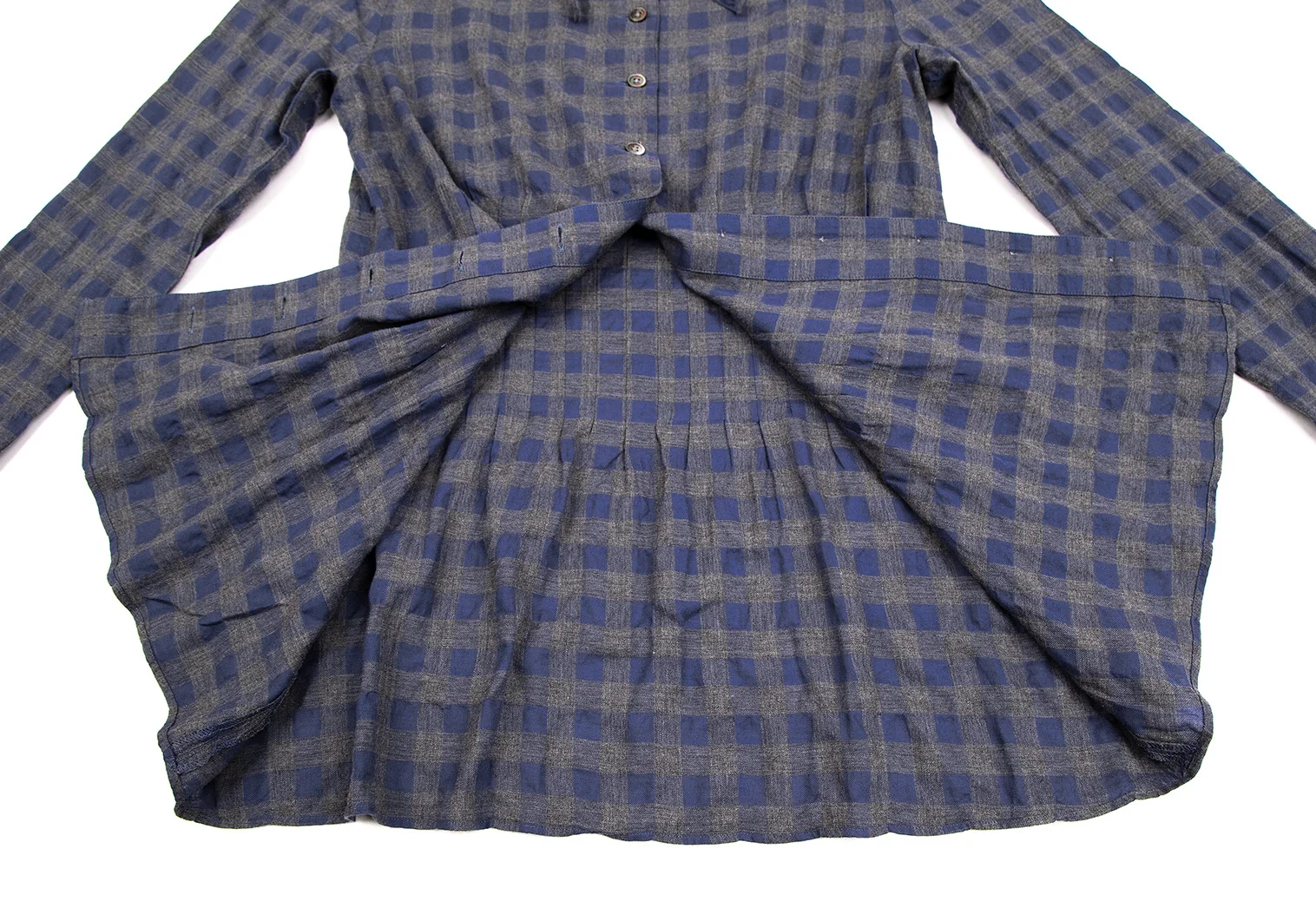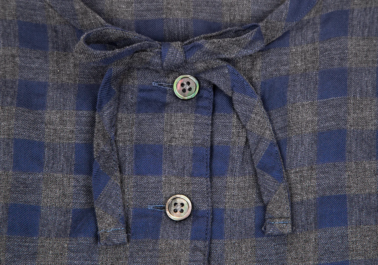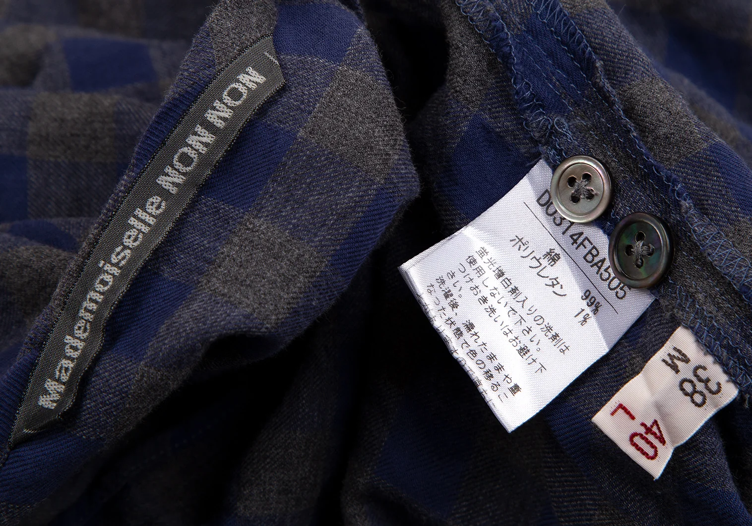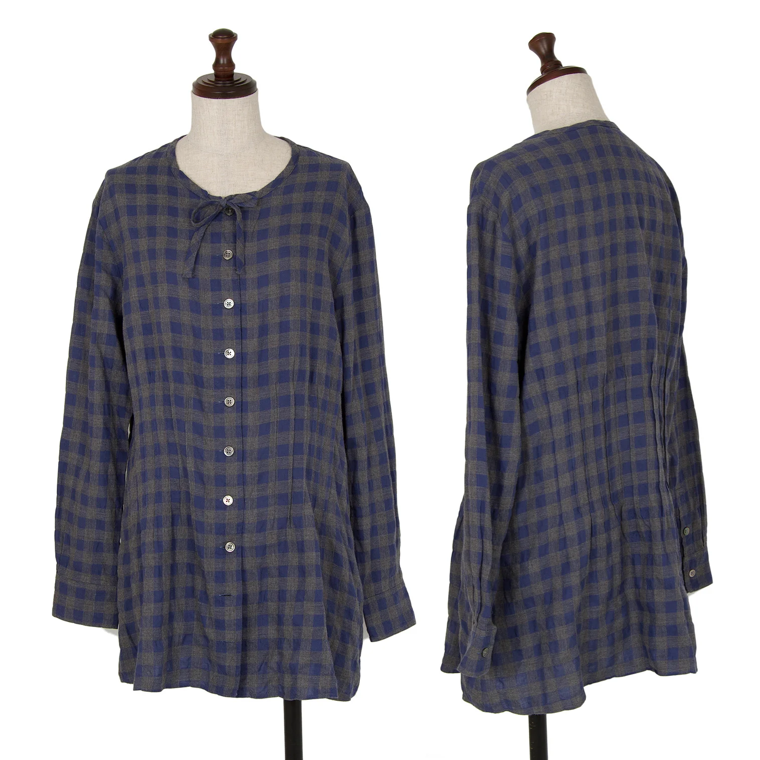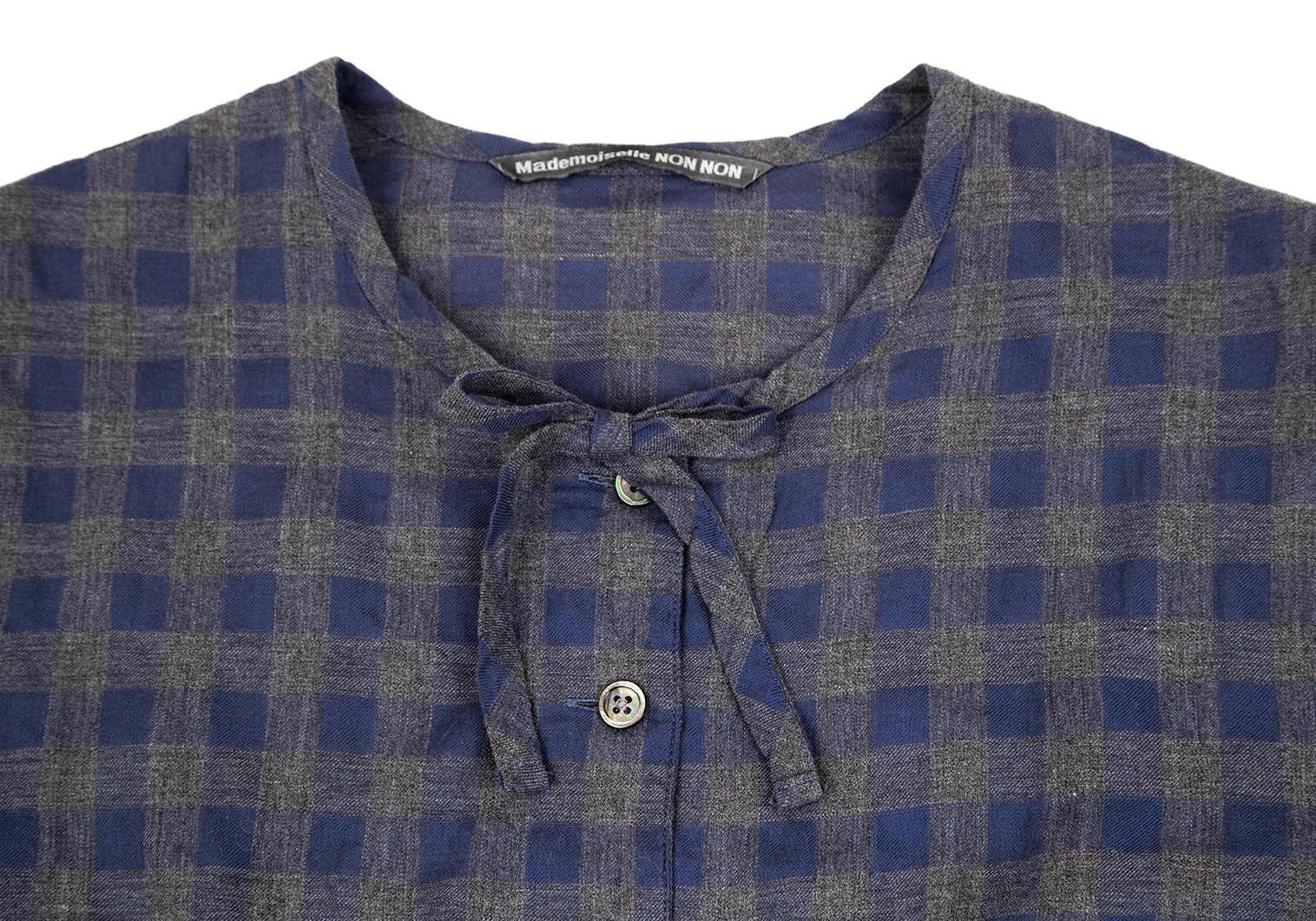マドモアゼルノンノンMademoiselle NON NON コットンブロックチェックリボンデザインギャザーシャツ グレー青40L