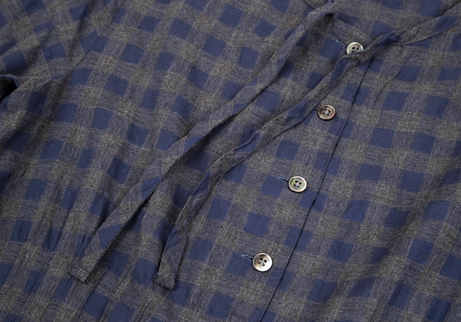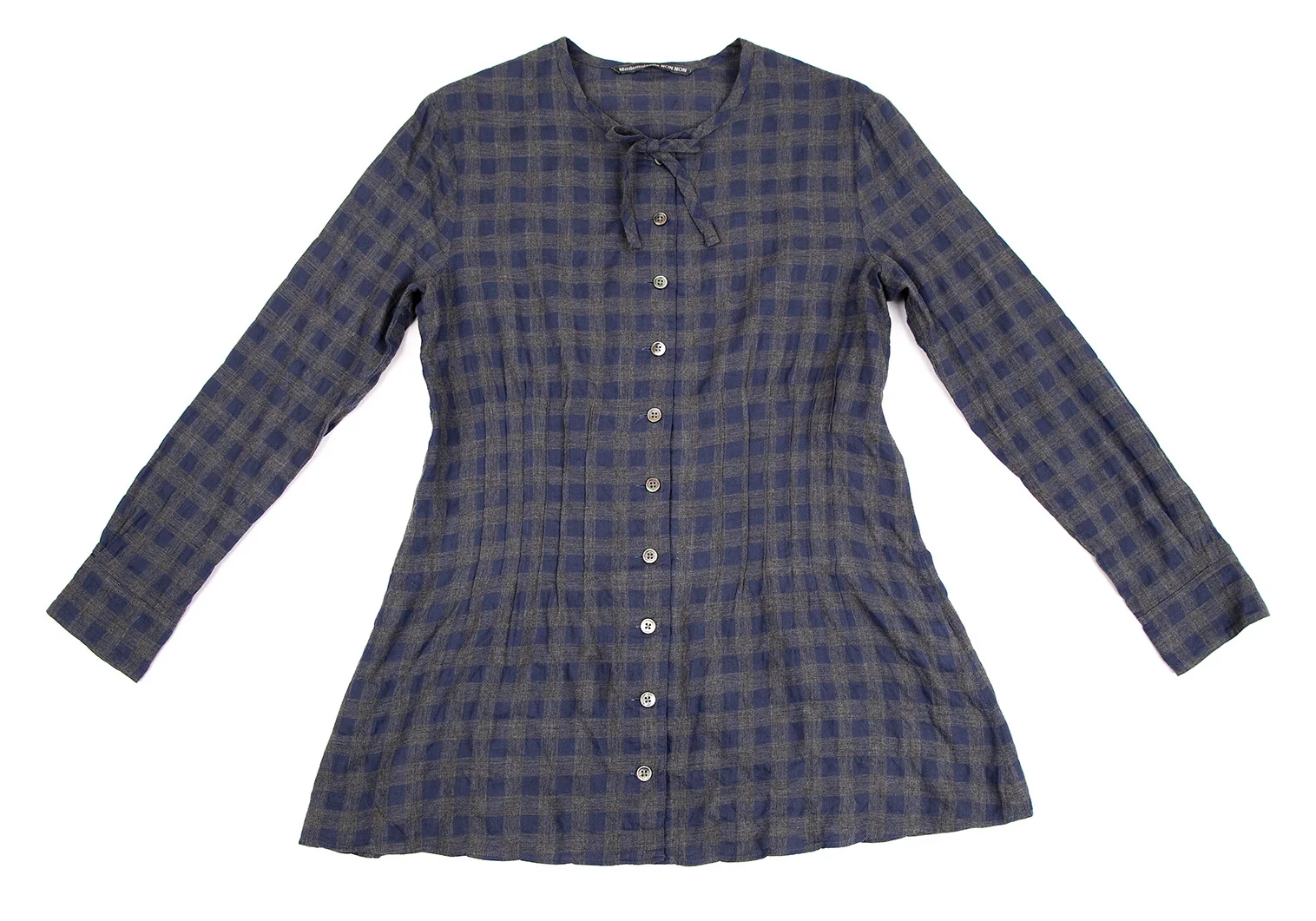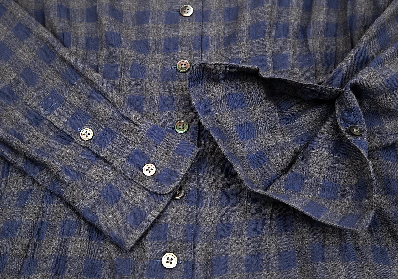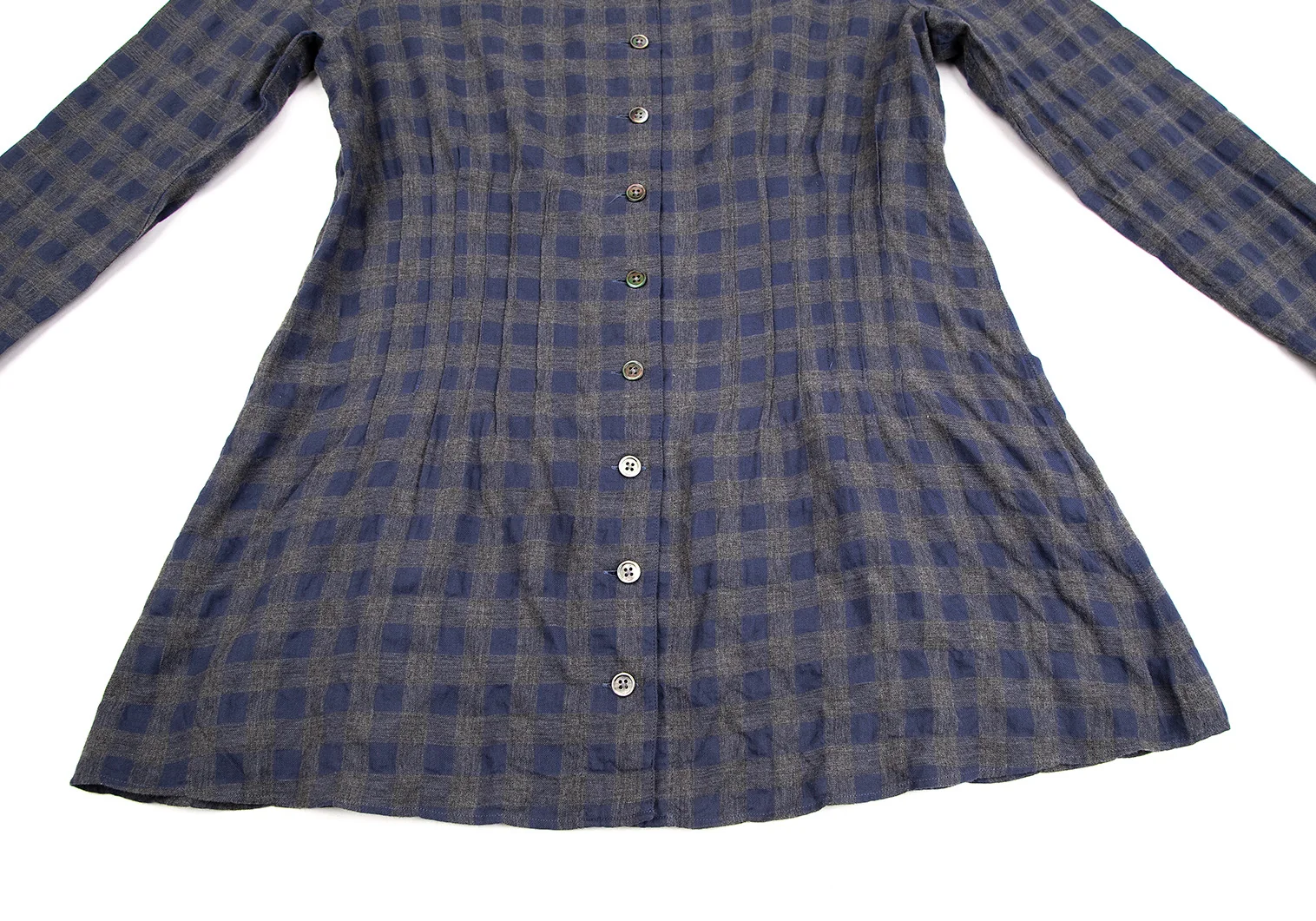 マドモアゼルノンノンMademoiselle NON NON コットンブロックチェックリボンデザインギャザーシャツ グレー青40L
