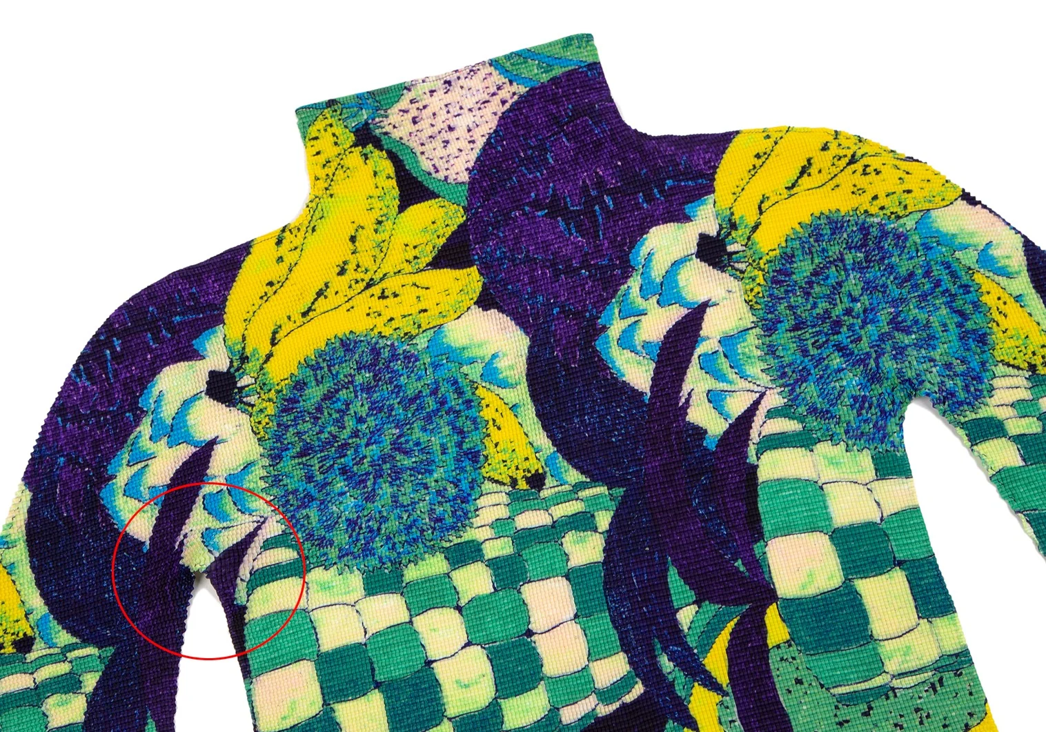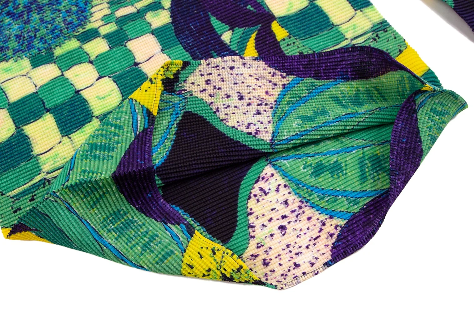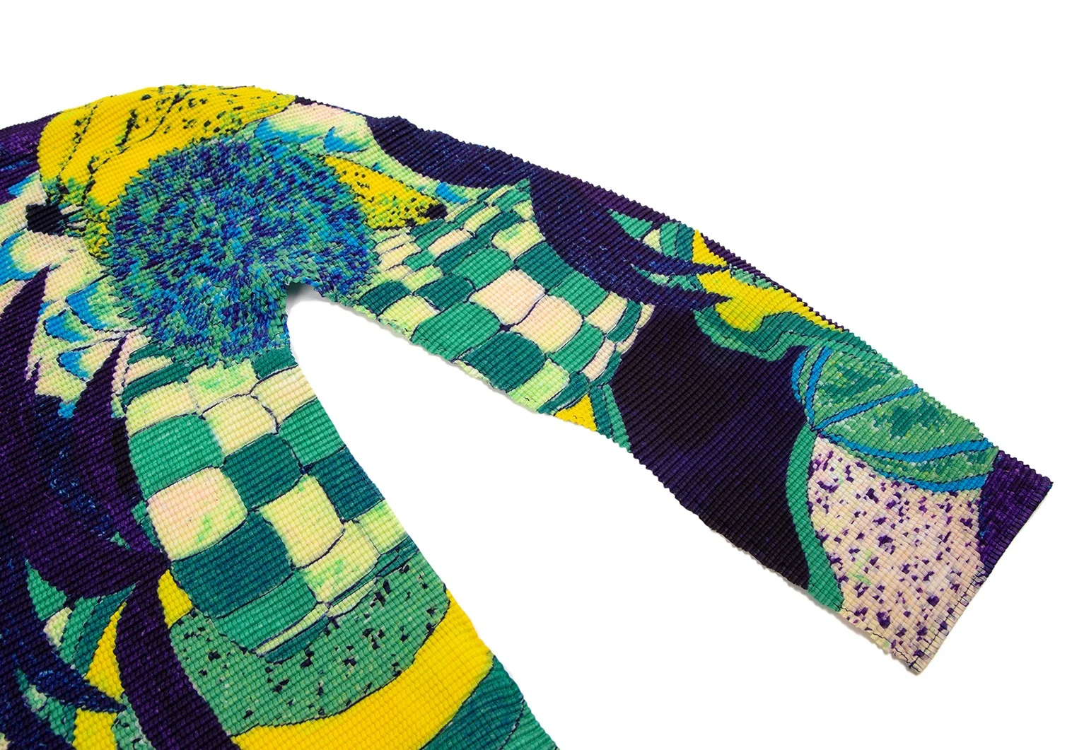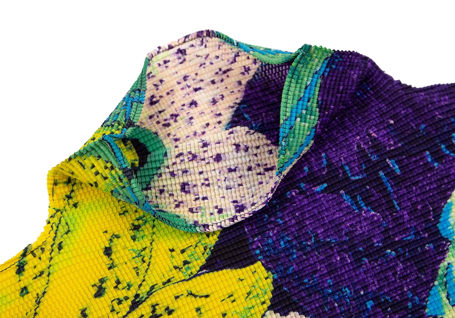 イッセイミヤケ ミーISSEY MIYAKE me トロピカルフルーツプリントストレッチプリーツハイネックカットソー 紺黄他F