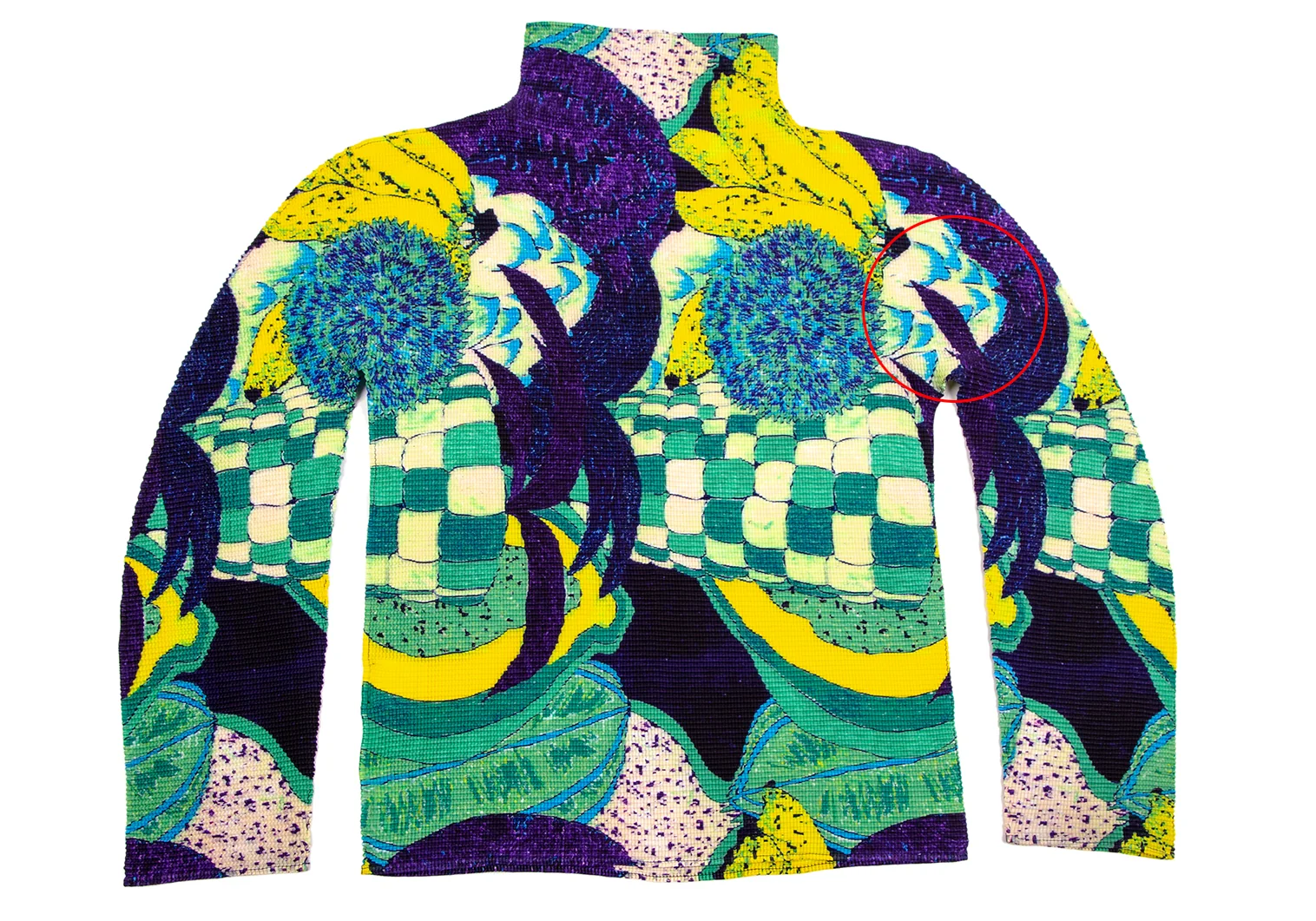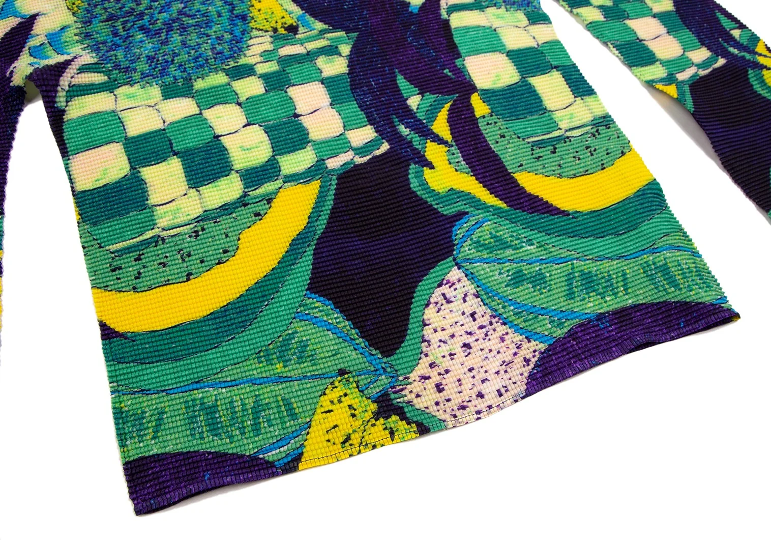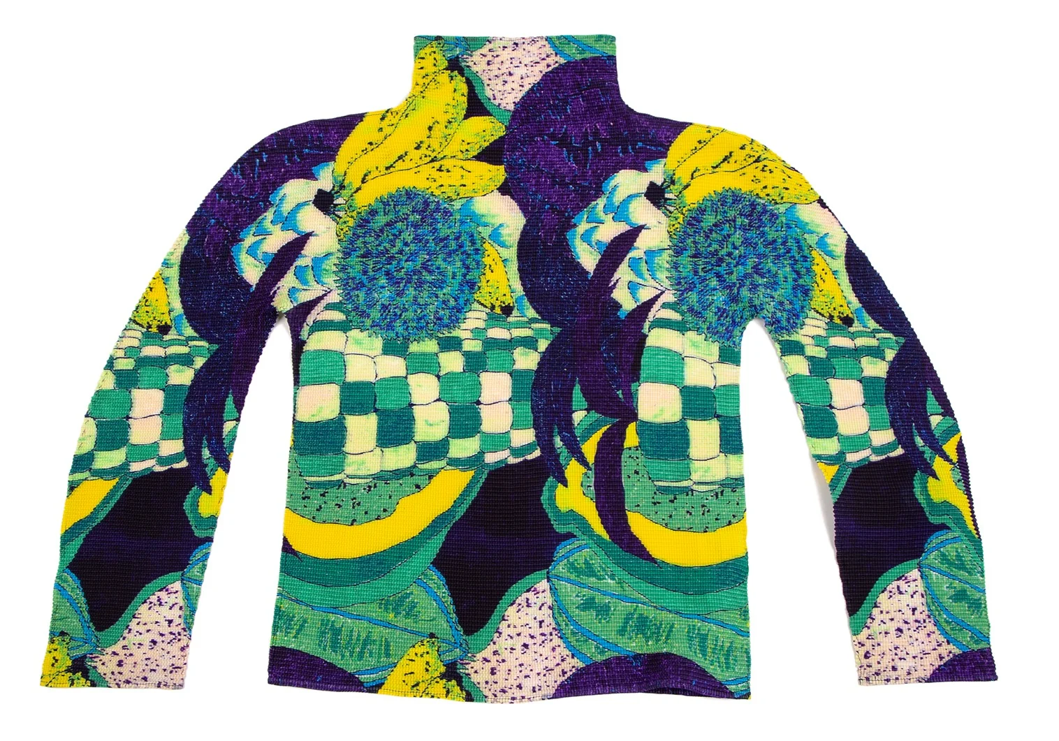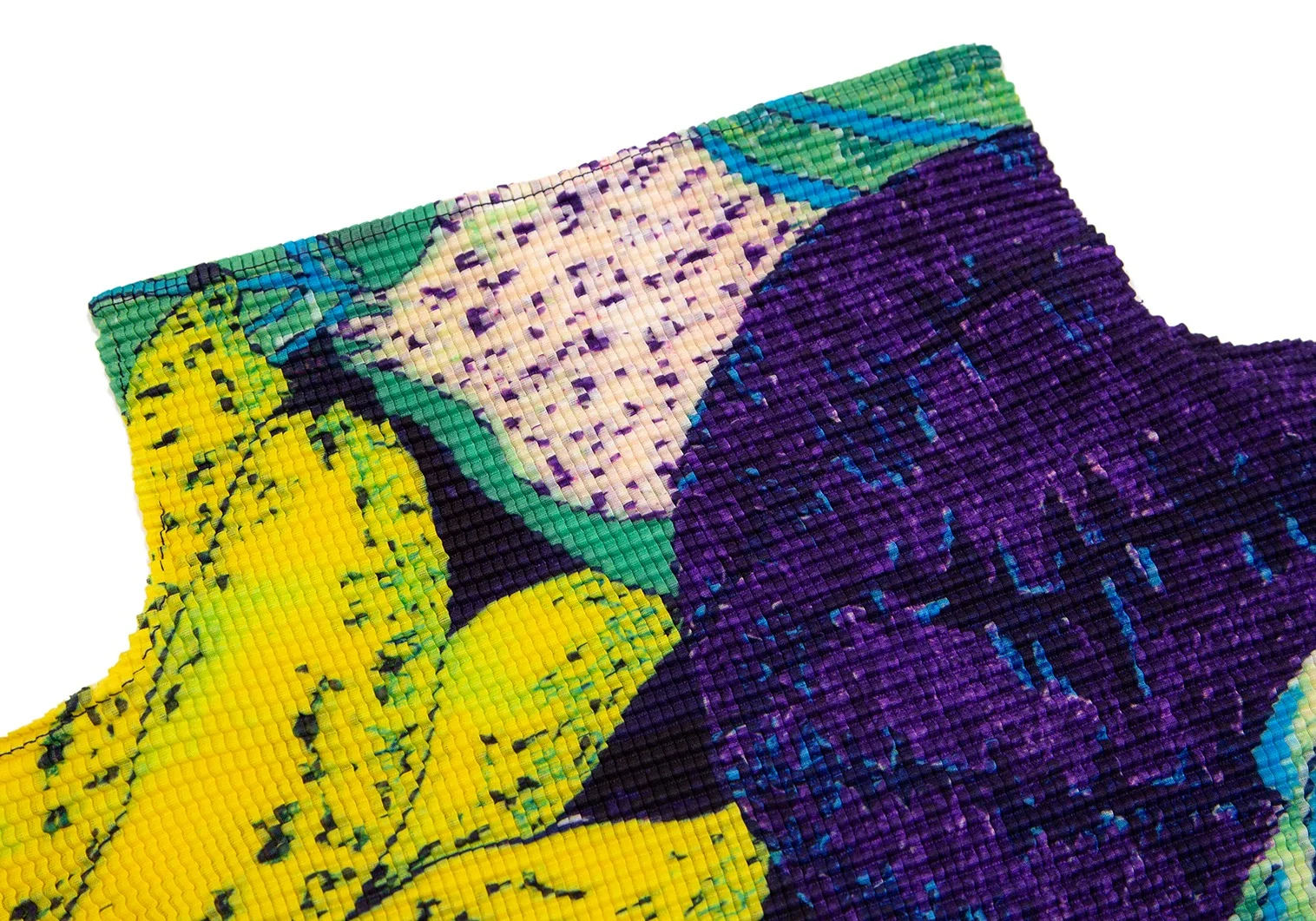イッセイミヤケ ミーISSEY MIYAKE me トロピカルフルーツプリントストレッチプリーツハイネックカットソー 紺黄他F