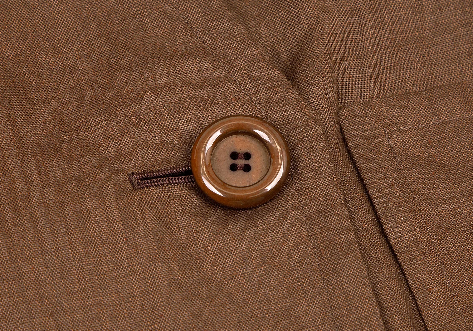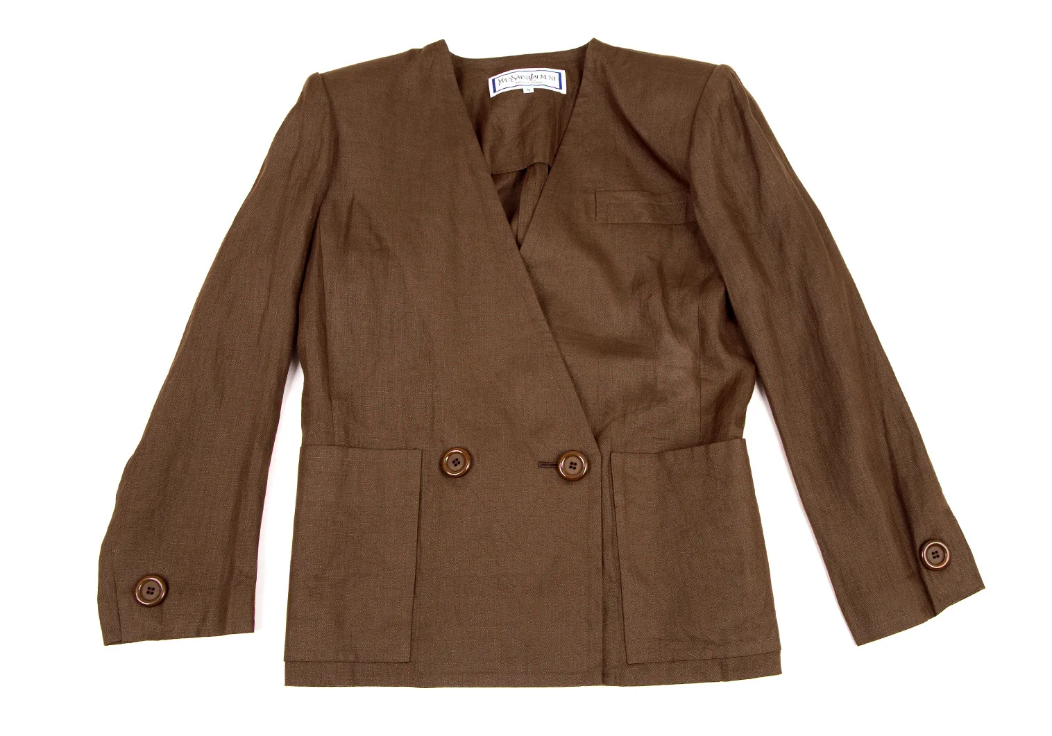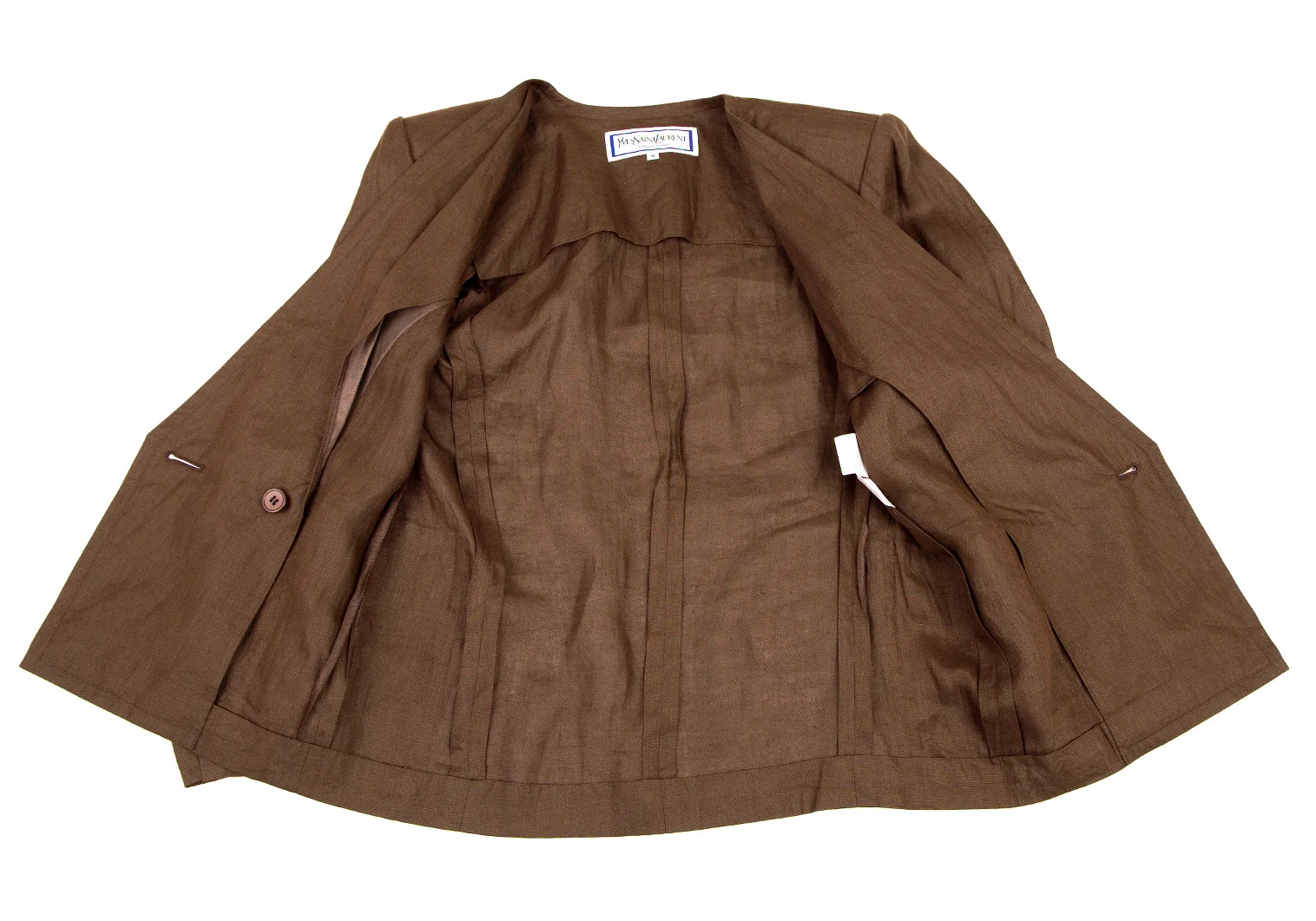 イヴサンローランYves Saint Laurent リネンノーカラーダブルセットアップスーツ 茶S・M