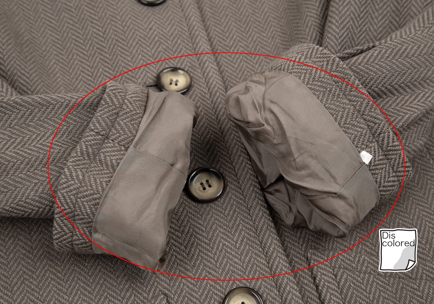 分厚めの肩パッドがあります。袖裏に変色があります(画像参照)。その他、目立ったシミ、汚れ、ほつれ等なくいい状態です。クリーニング済み