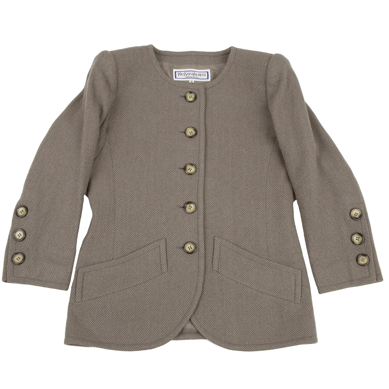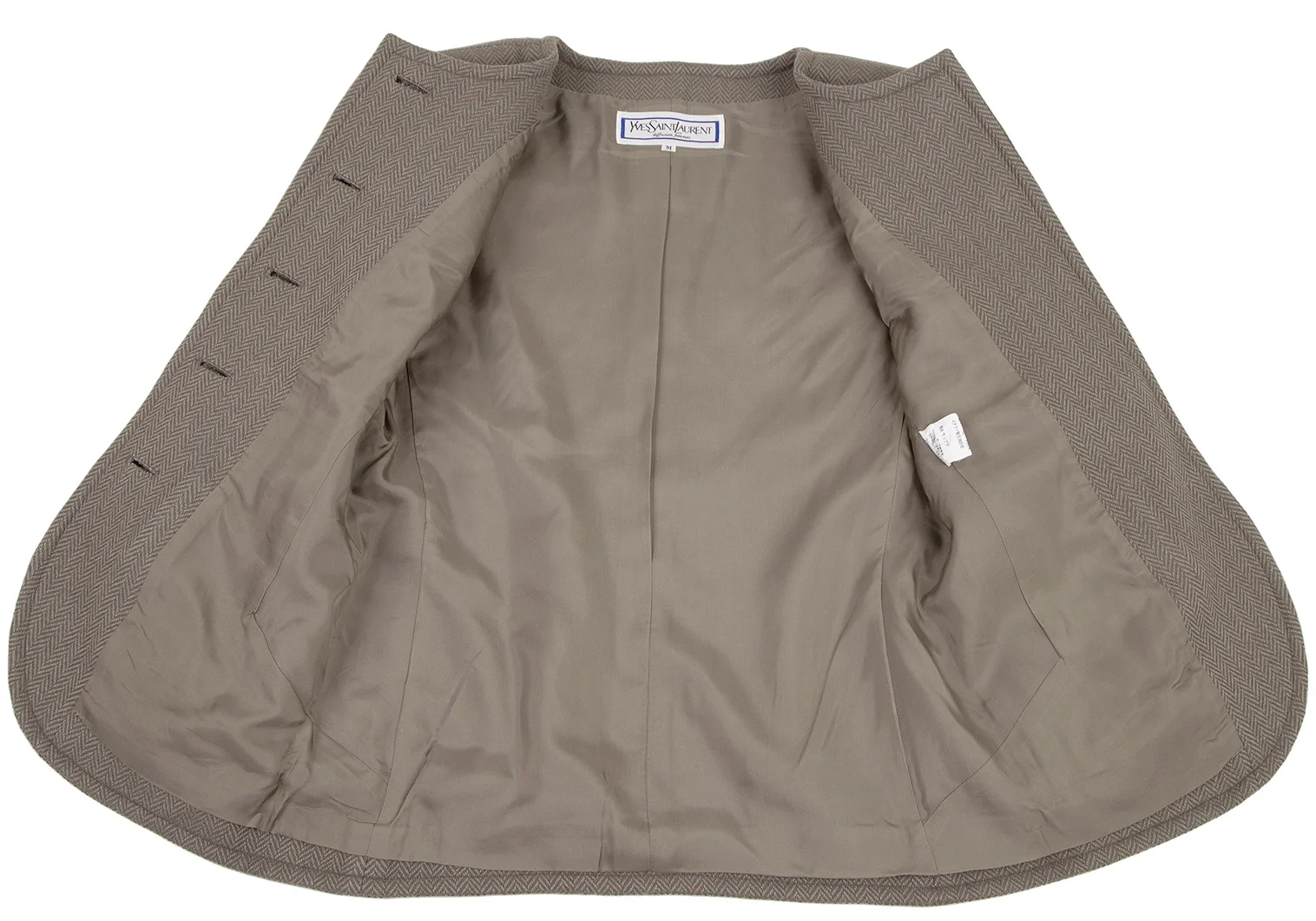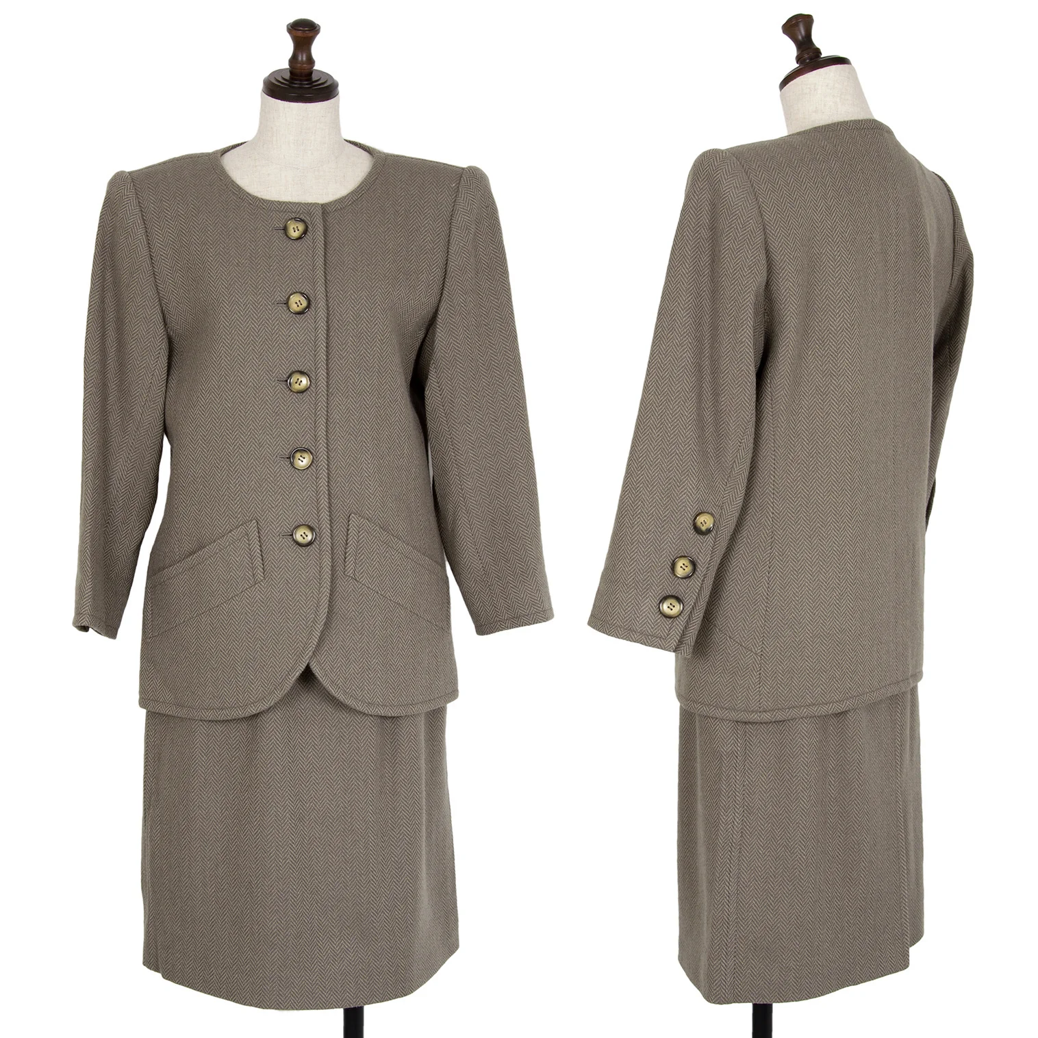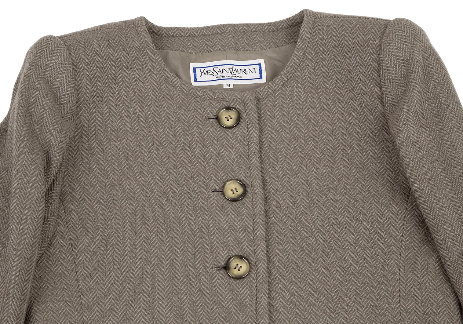 イヴサンローランYves Saint Laurent ウールヘリンボーンノーカラーセットアップスーツ モスグレーM
