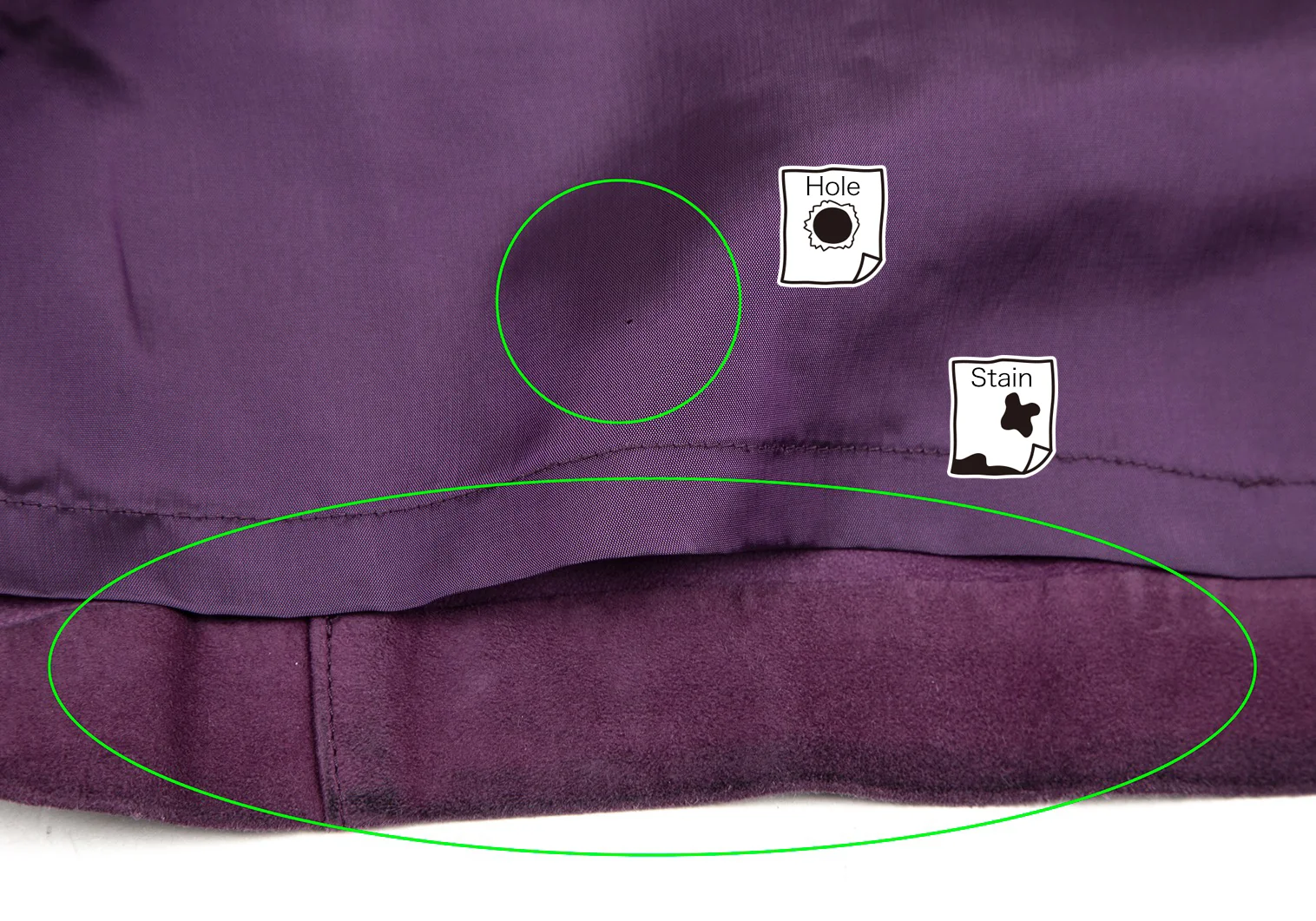 全体に擦れ毛羽立ち、前裾に多数のシミと擦れ、後ろ裾に擦れ、裾裏全体に汚れ・針穴があります。(画像参照)その他目立ったシミ、汚れ、ほつれ等ないです。クリーニング済み