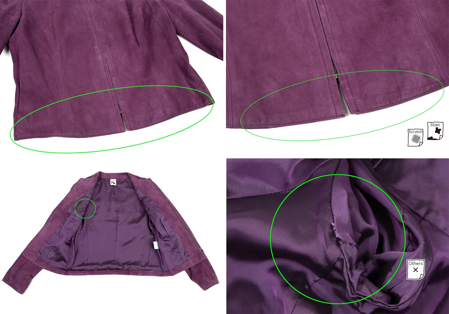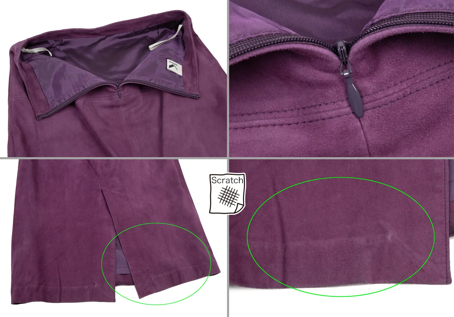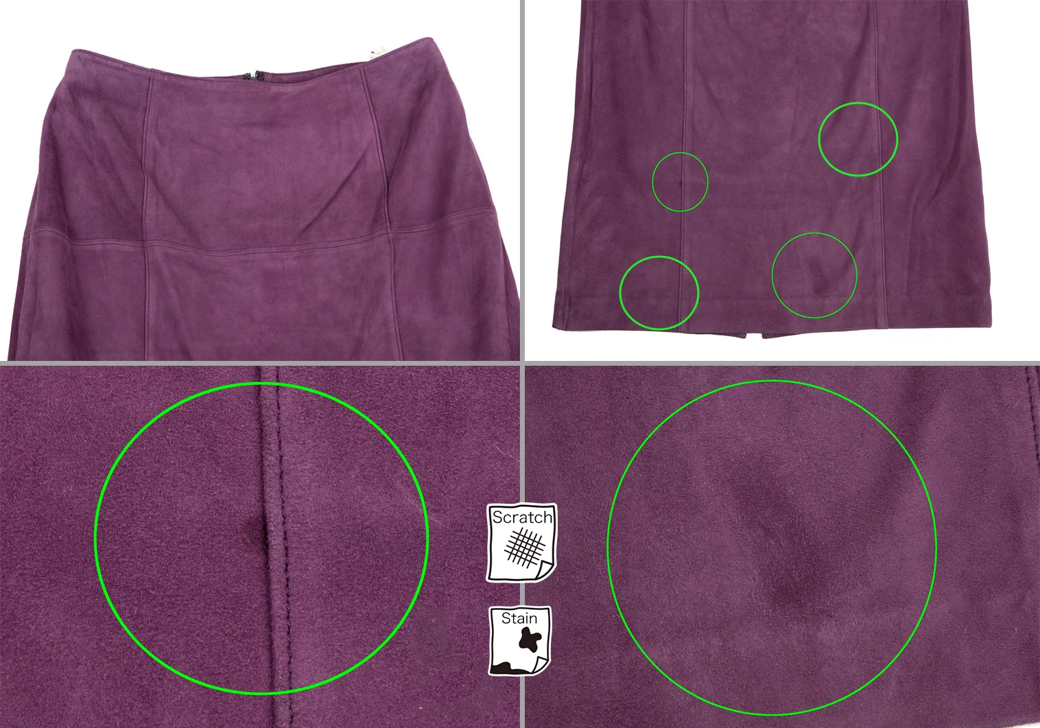 全体に擦れ毛羽立ちがあります。ジャケット:右袖・脇に毛抜け、右脇の裏地に破れあり、後ろ右袖に汚れ、袖表裏・前後裾に擦れ・薄汚れがあります。スカート:前裾に多数のシミと擦れ、後ろ裾に擦れ、裾裏全体に汚れ・針穴があります。(画像参照)。その他ほつれ等ないです。クリーニング済み