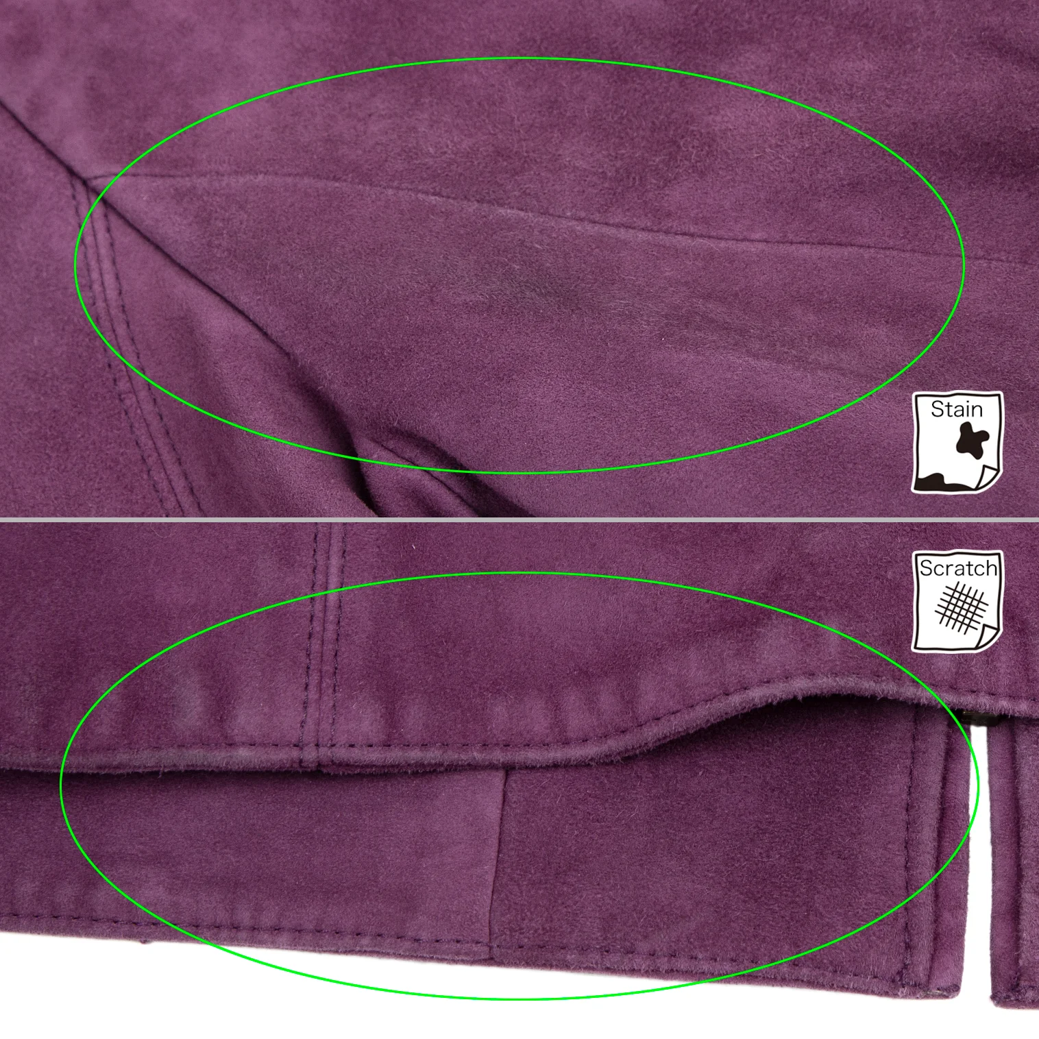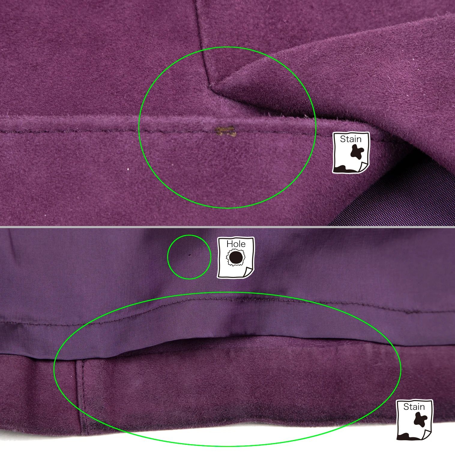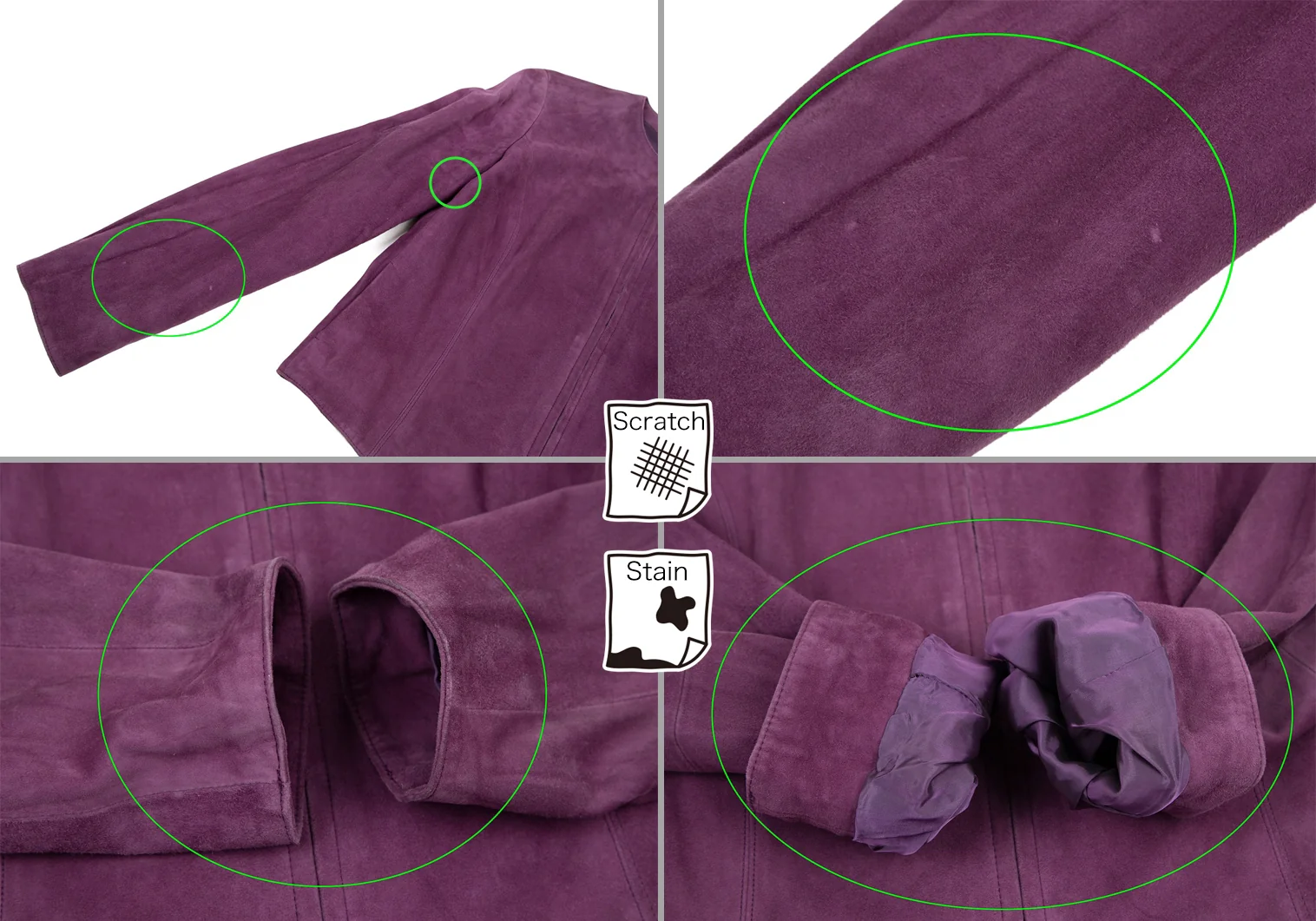 全体に擦れ毛羽立ちがあります。ジャケット:右袖・脇に毛抜け、右脇の裏地に破れあり、後ろ右袖に汚れ、袖表裏・前後裾に擦れ・薄汚れがあります。スカート:前裾に多数のシミと擦れ、後ろ裾に擦れ、裾裏全体に汚れ・針穴があります。(画像参照)。その他ほつれ等ないです。クリーニング済み