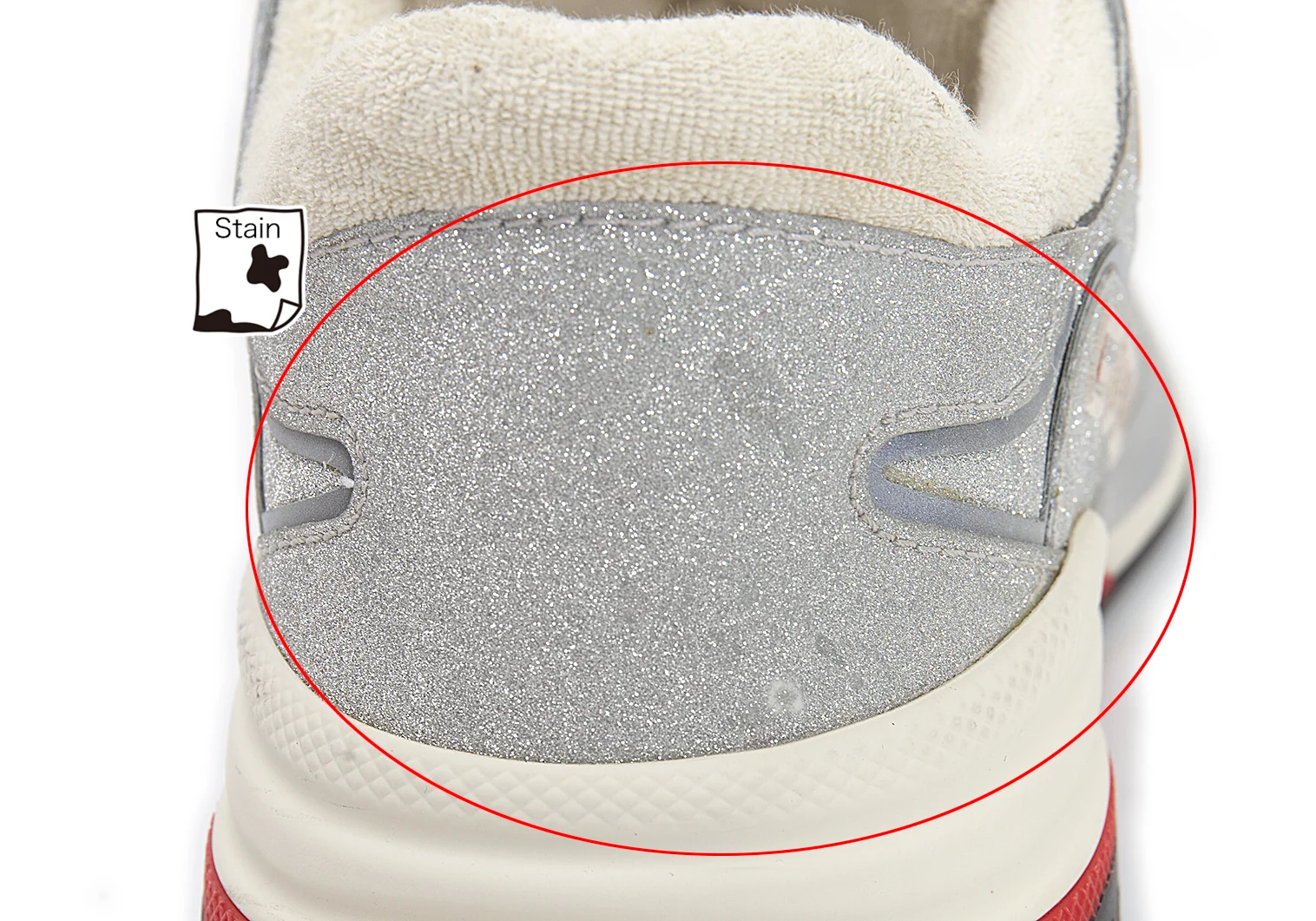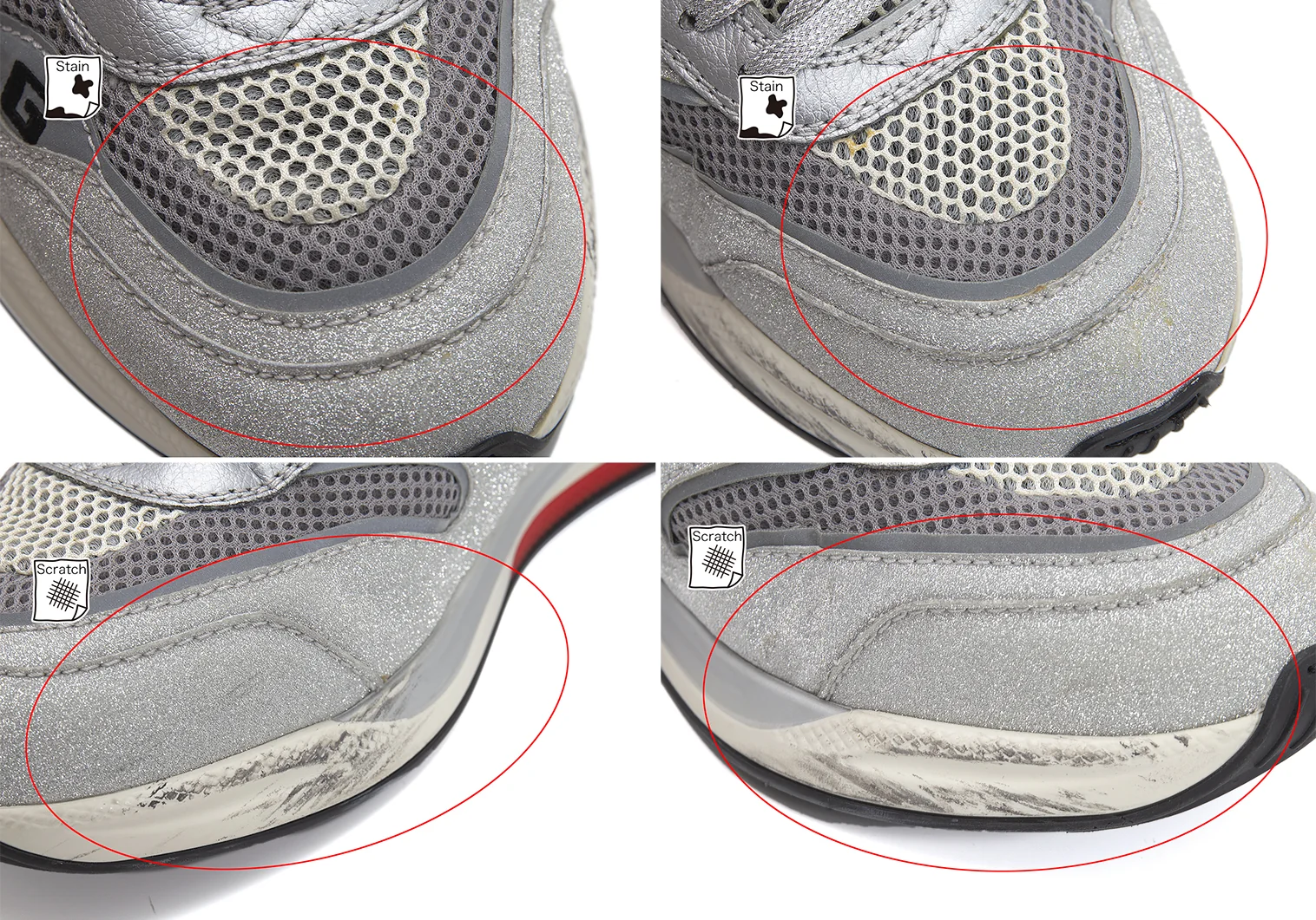 踵薄シミ、爪先汚れ、擦れ、内側擦れがあります(写真参照)。その他目立った傷や汚れなどなくいい状態です。