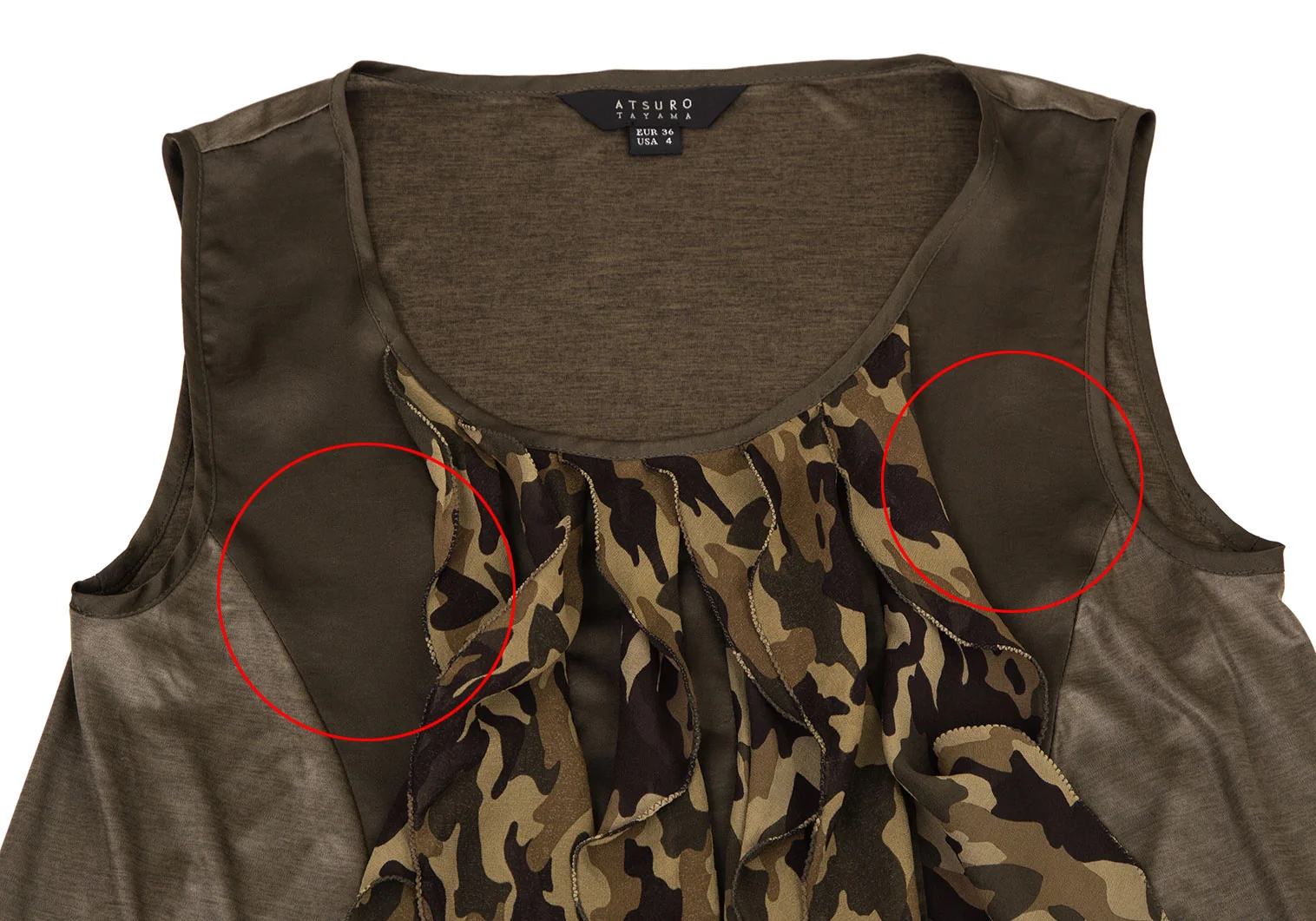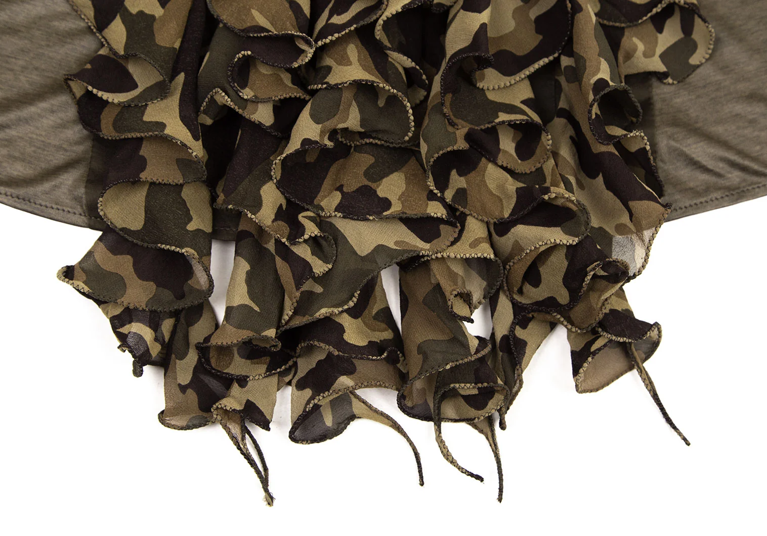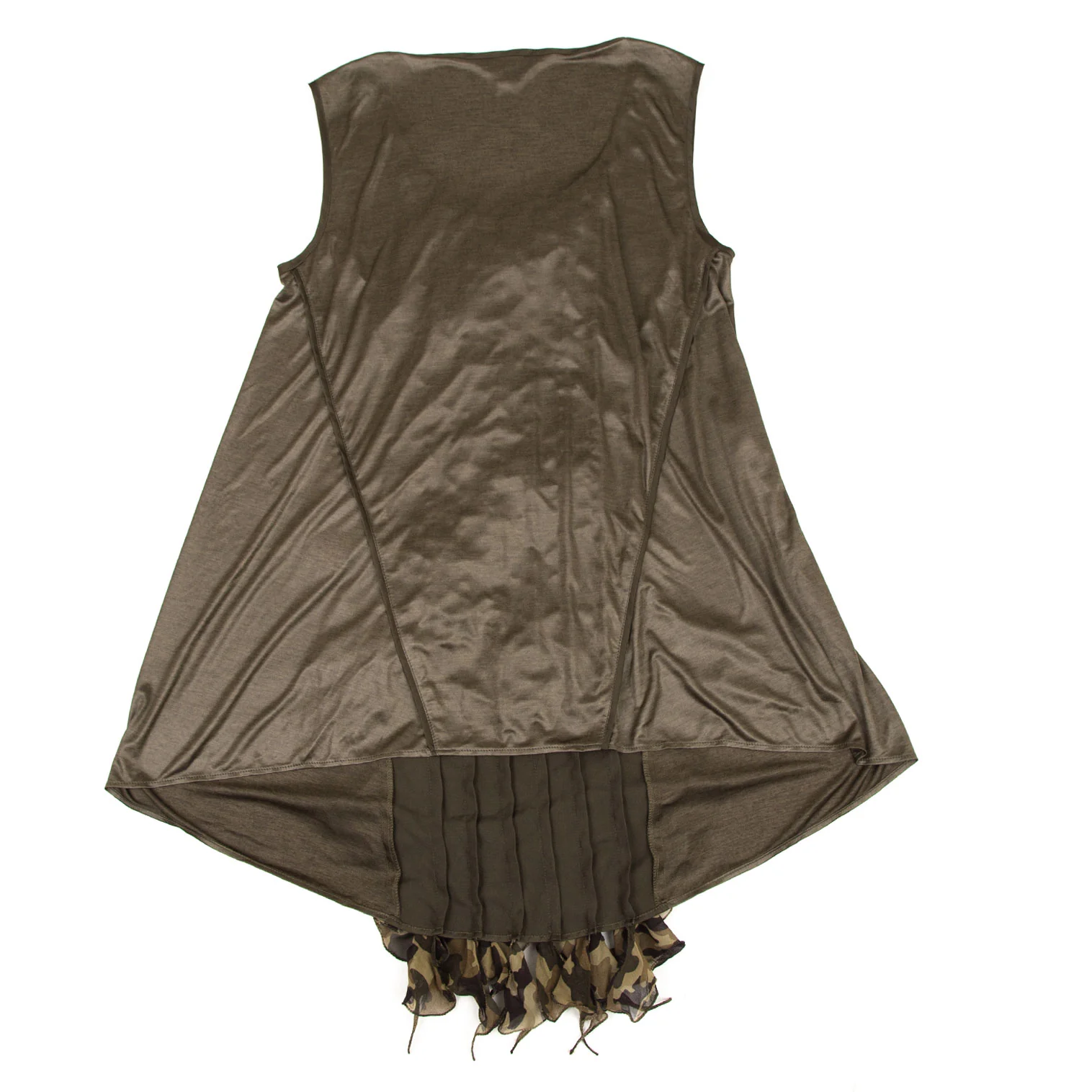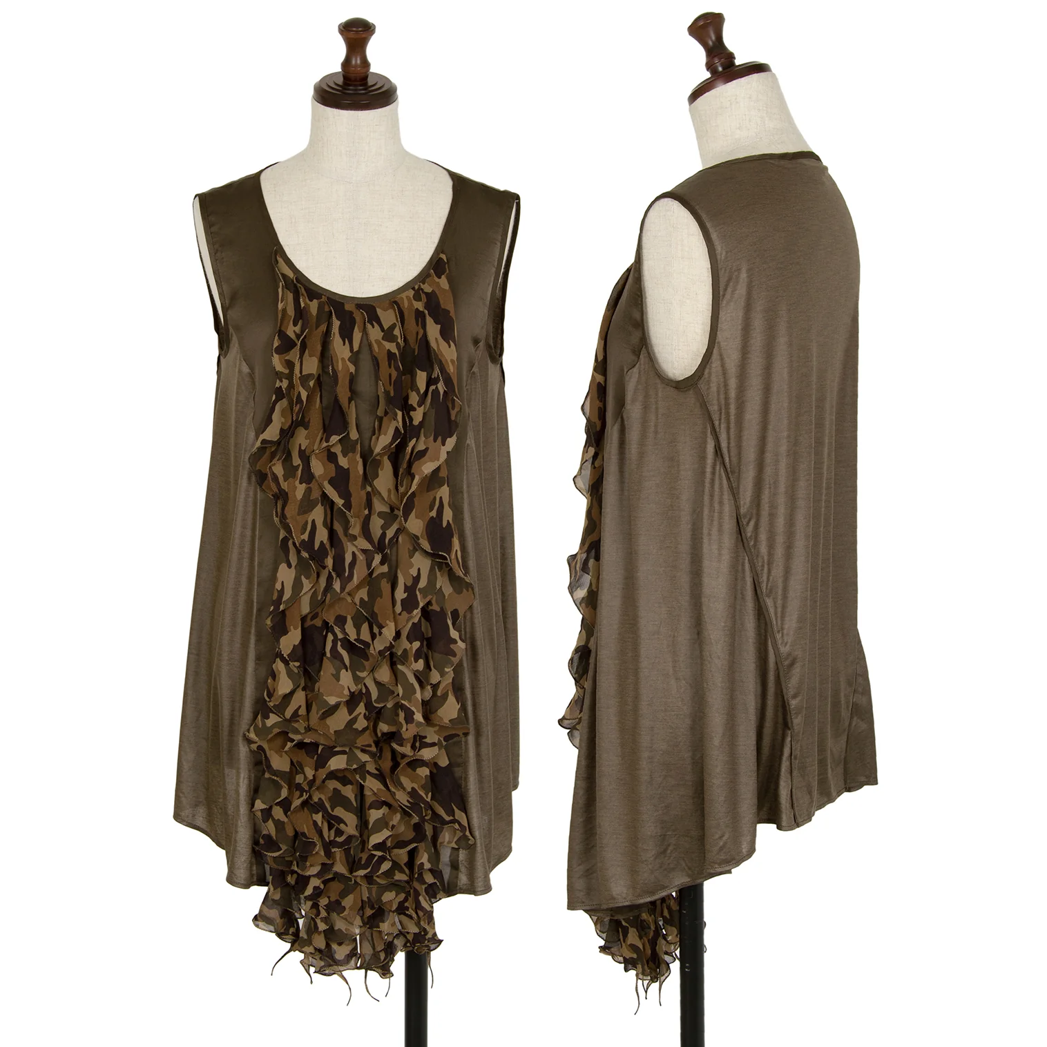 アツロウタヤマATSURO TAYAMA シルク切替迷彩フリル装飾ノースリーブトップス カーキ36