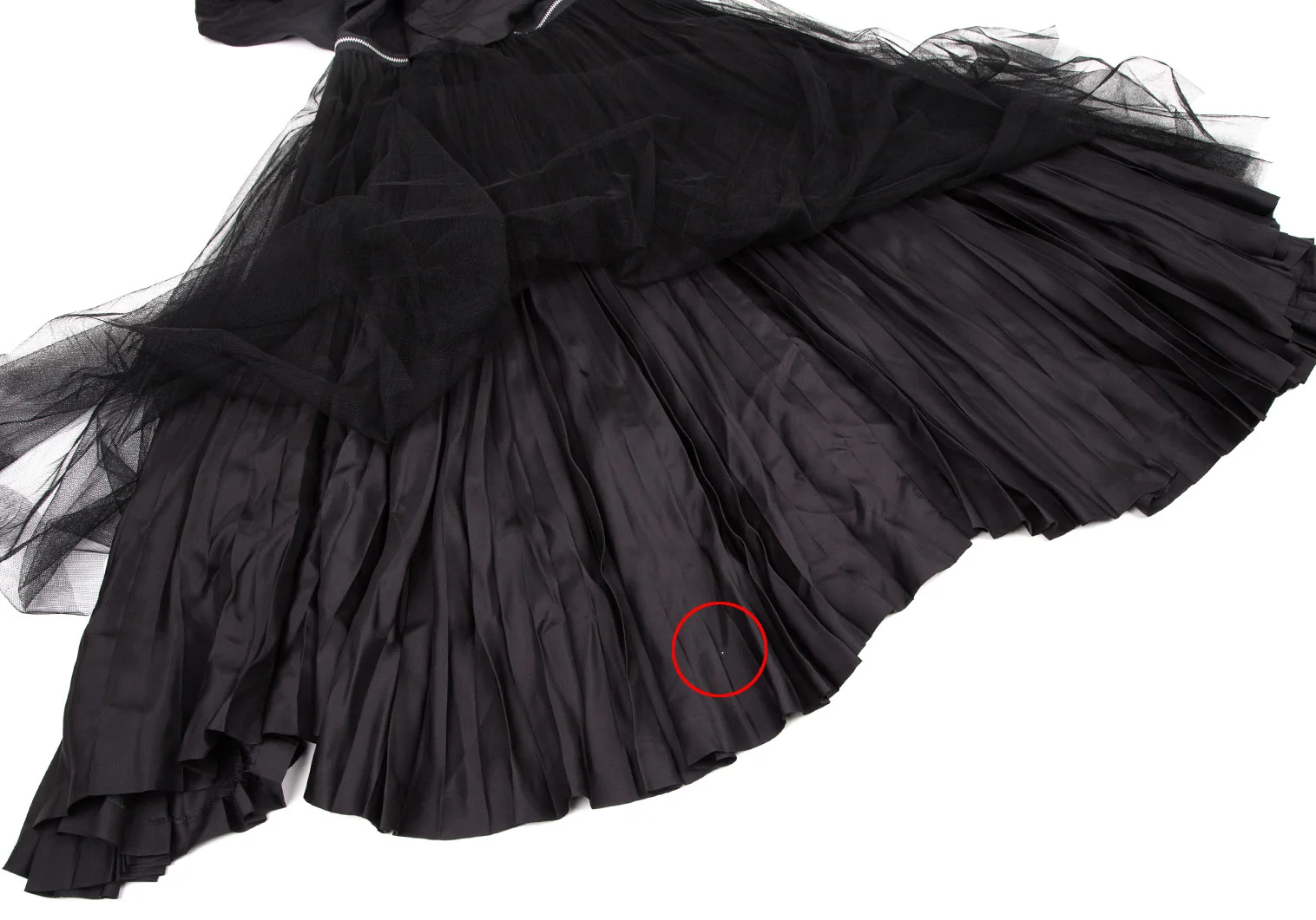 袖先・袖裏に薄汚れ、チュールスカート裏に汚れ・穴があります(写真参照)。その他に目立ったシミ、汚れ、ほつれ等はありません。クリーニング済み