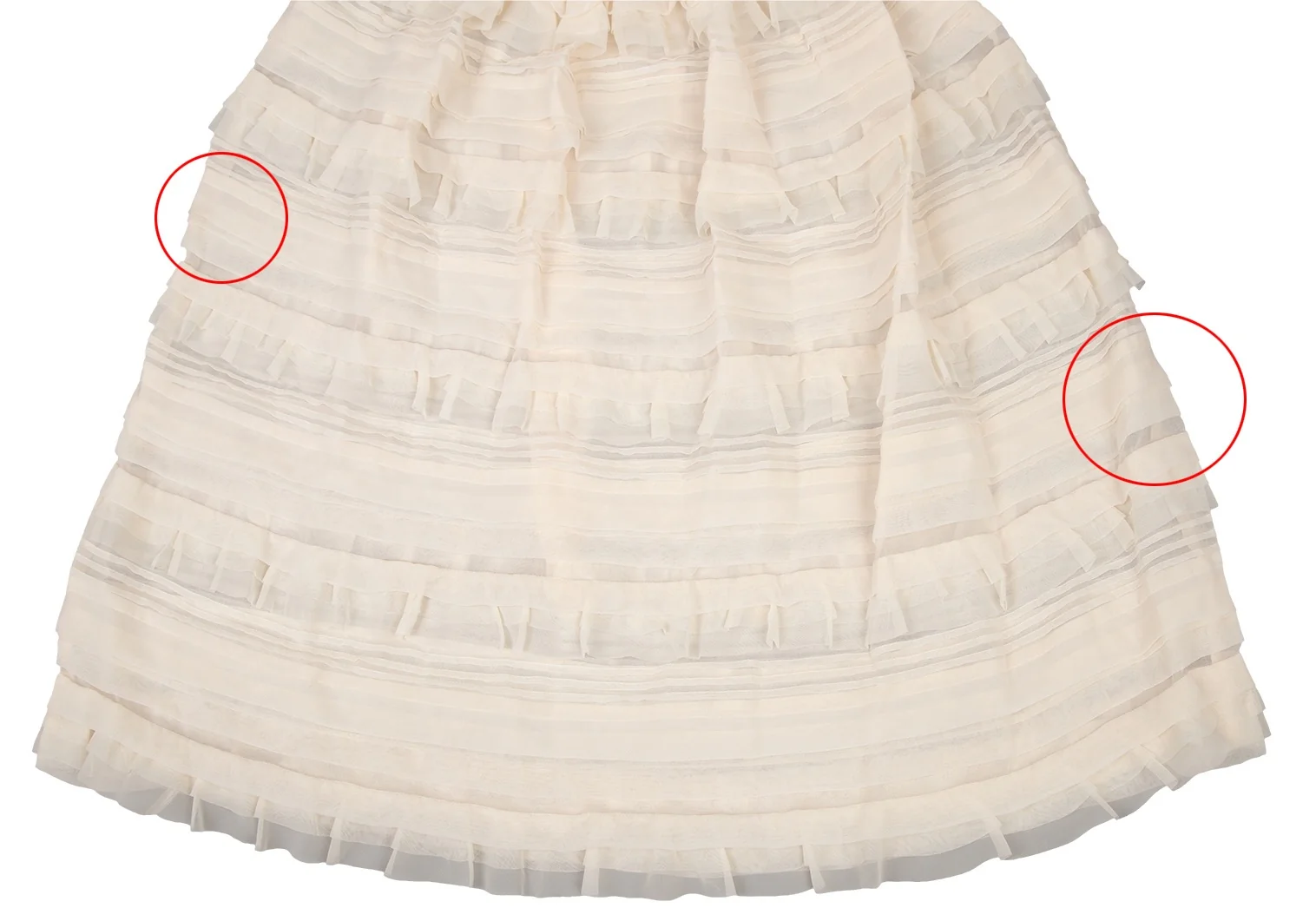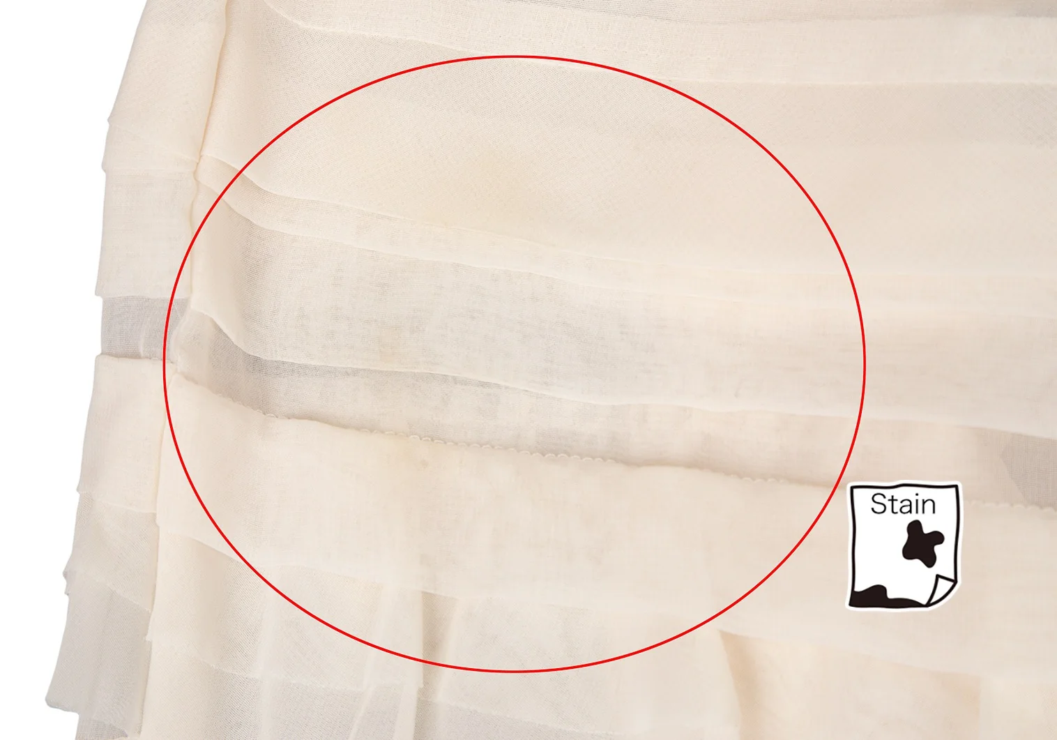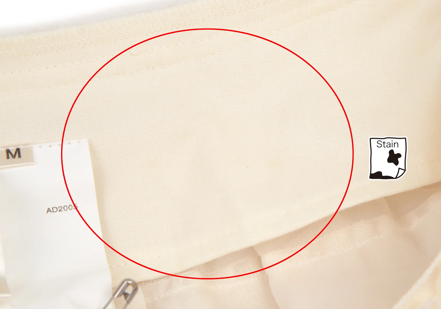 透け感のある生地です。ウエスト裏に薄汚れ、前裾に薄汚れとダメージ、後ろ裾に薄シミがあります(画像参照)。その他目立ったシミ、汚れ、ほつれ等なくいい状態です。クリーニング済み