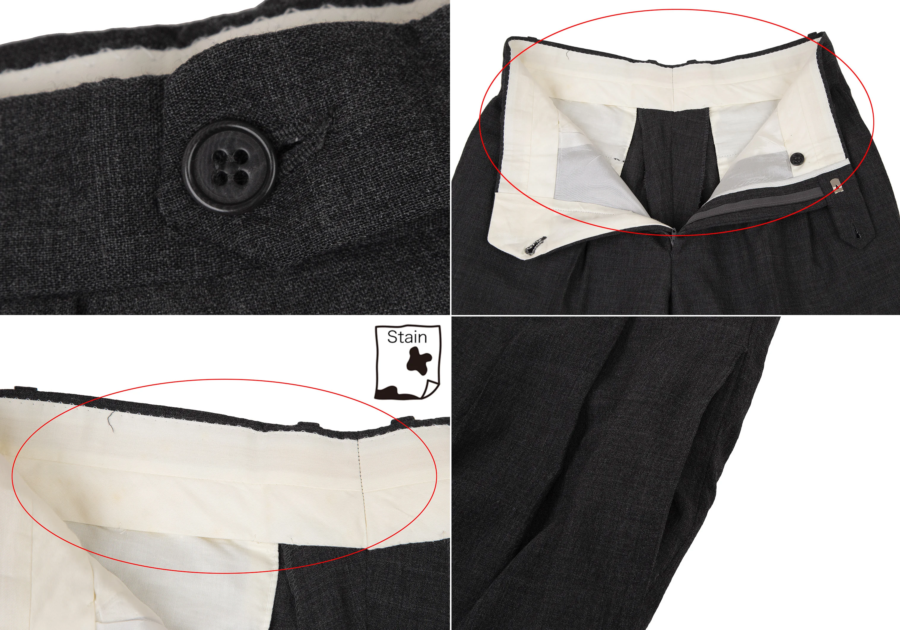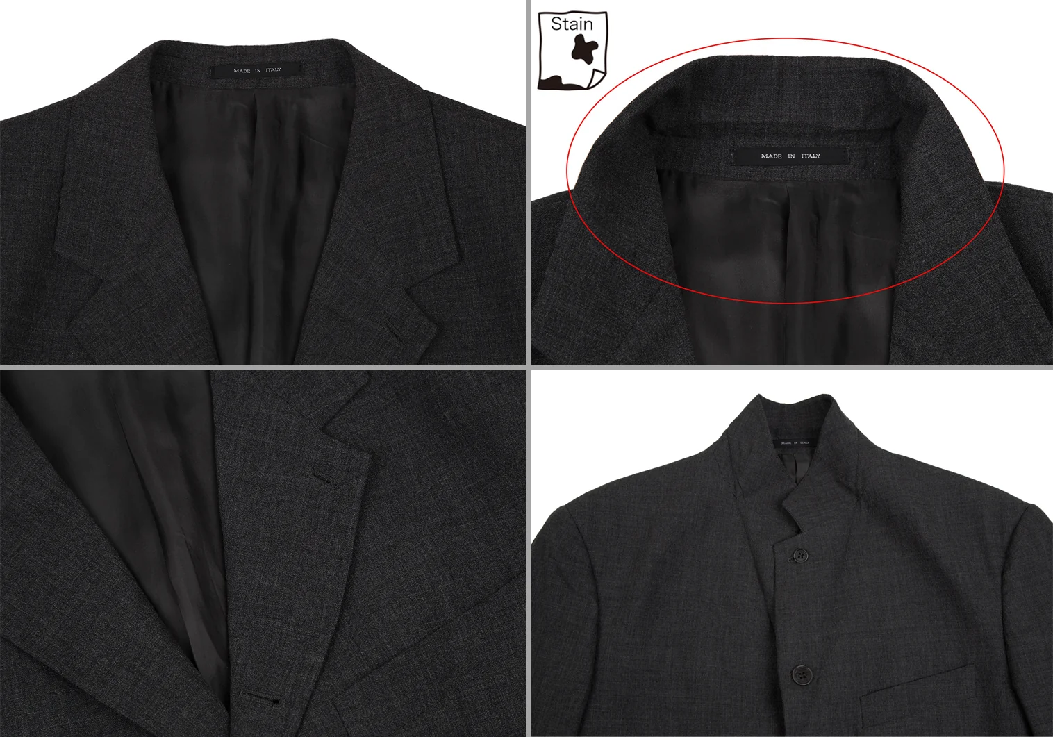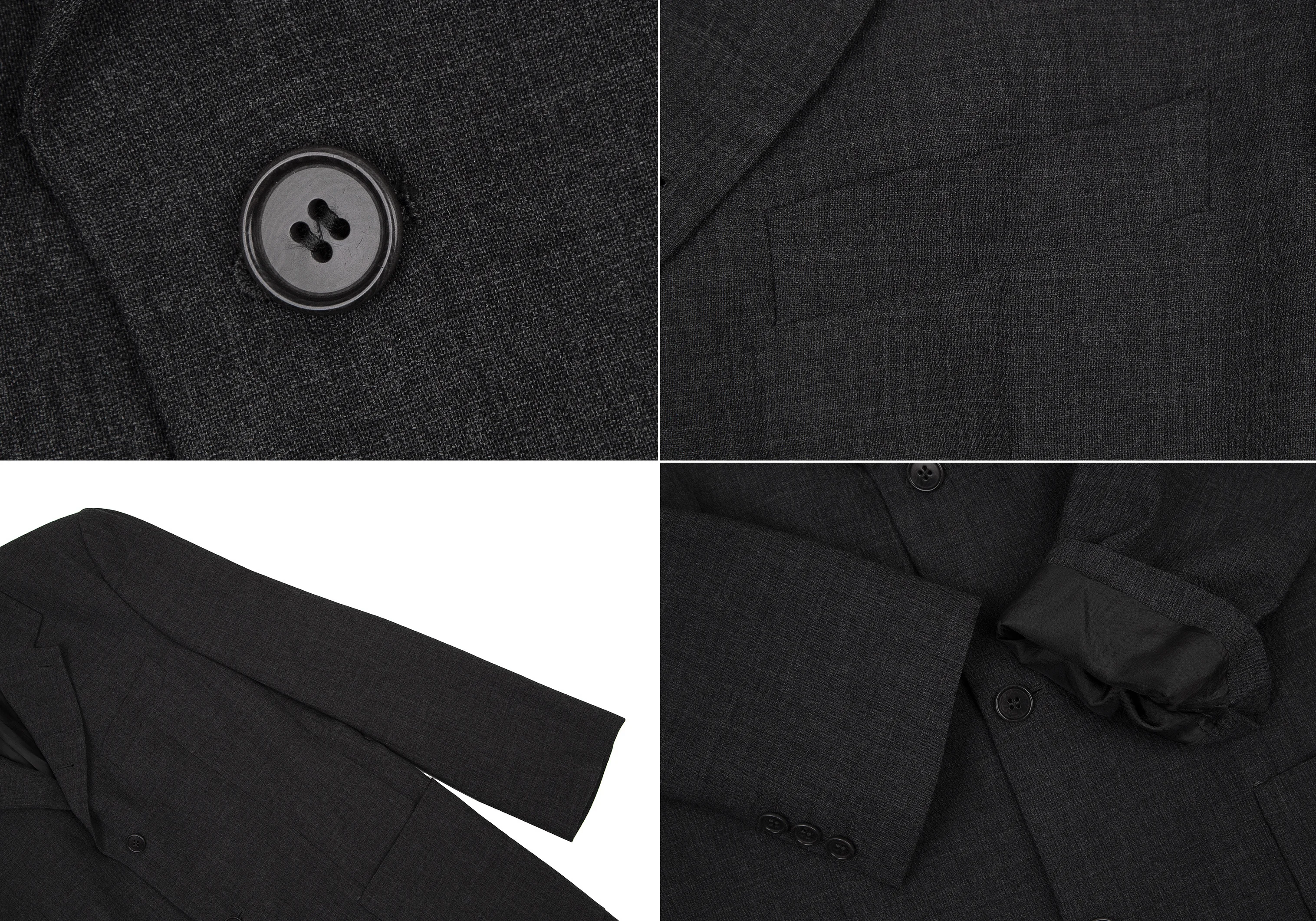 ジャケット:肩パッドがあります。襟元に薄汚れ・テカリ、裏側ポケット口にダメージがあります。パンツ:セットアップのためブランドタグはありません。ウエスト見返しに汚れがあります。(画像参照)その他目立ったシミ、汚れ、ほつれ等なくいい状態です。クリーニング済み