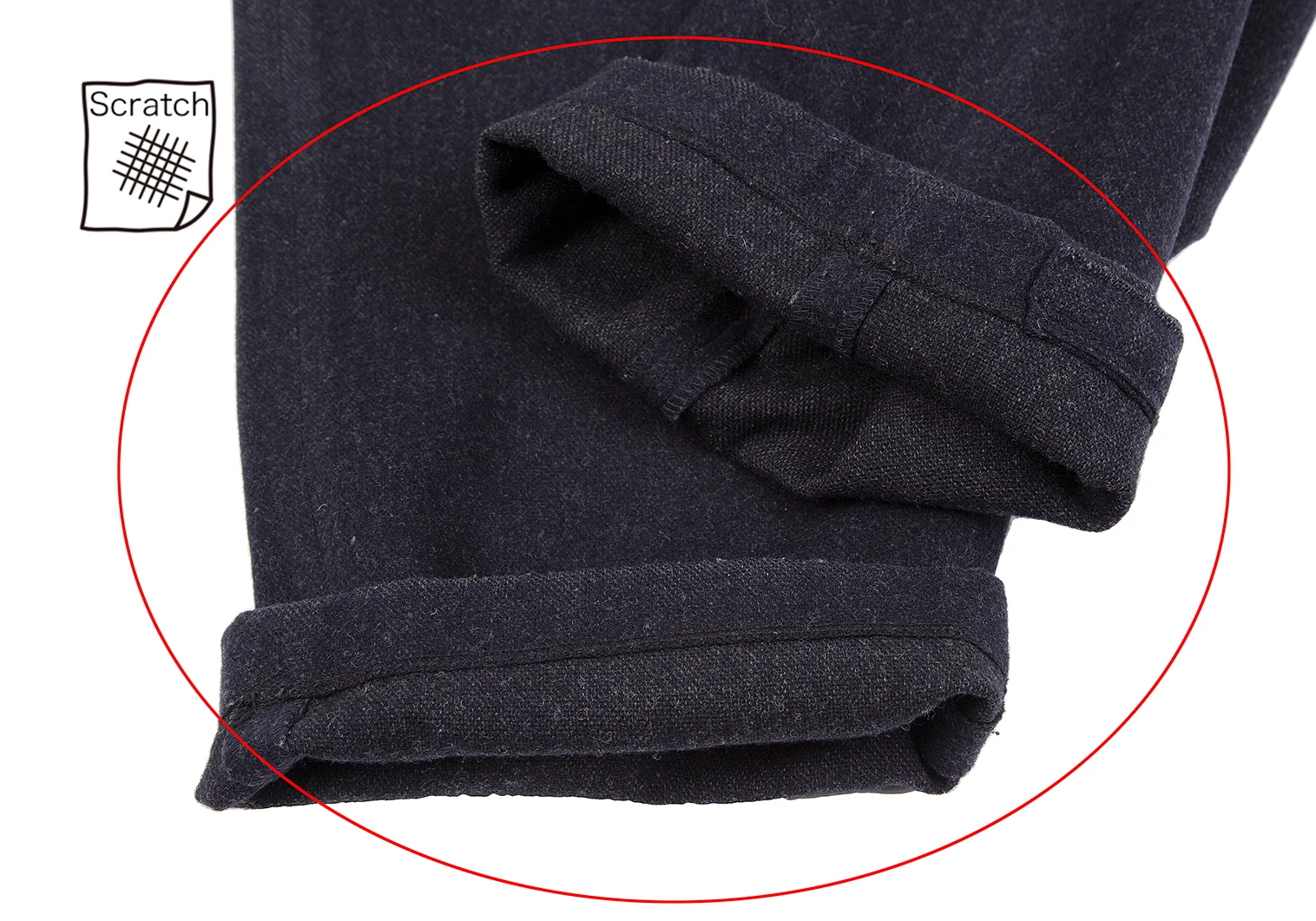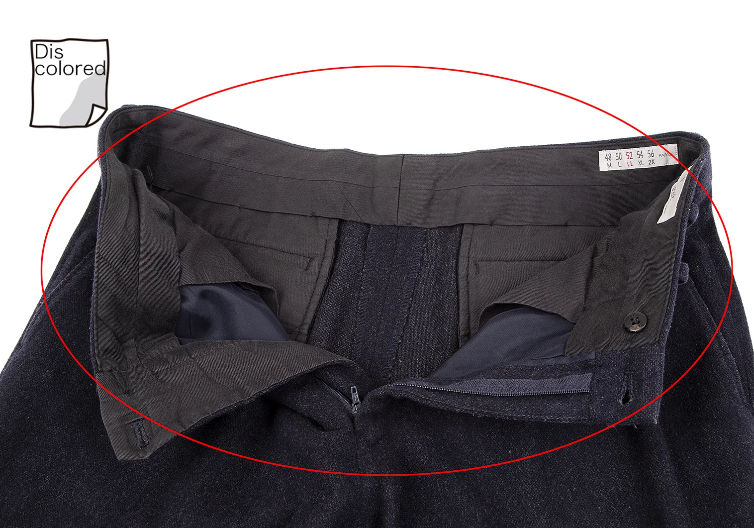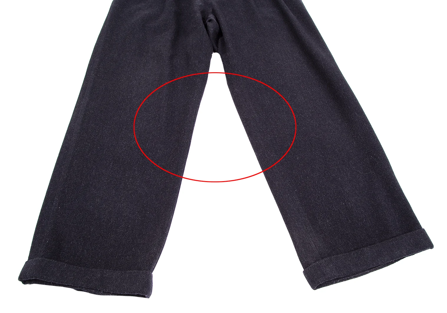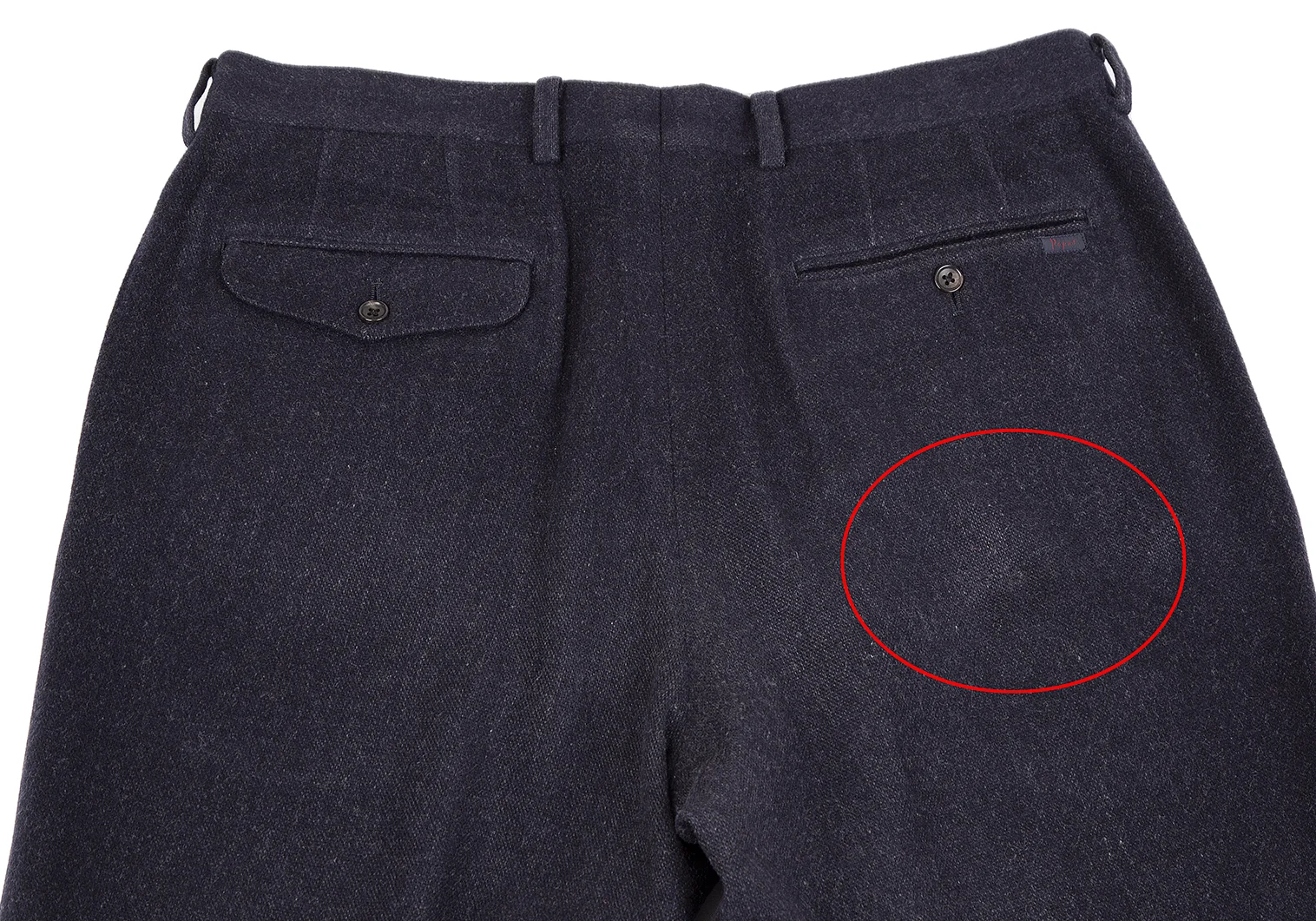 ウエスト裏に色褪せ、股下・膝・裾・ヒップにスレがあります(写真参照)その他目立ったシミ、汚れ、ほつれ等はありません。クリーニング済み
