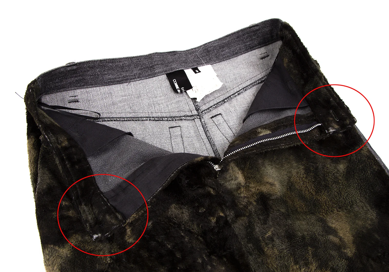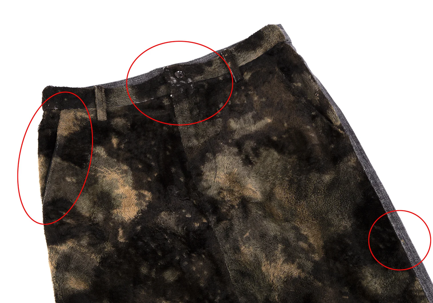 ウエストボタン部分・ウエスト裏側・右ポケットにスレ、左側サイドにシミ、裾裏にほつれがあります。(画像参照)その他目立ったシミ、汚れ、ほつれ等なくいい状態です。クリーニング済み
