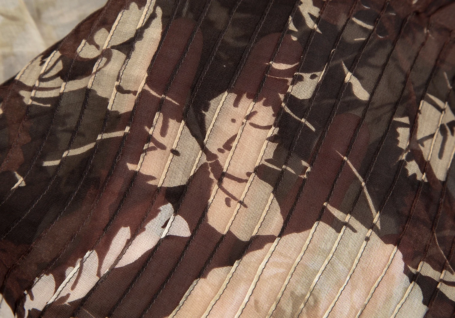品質表示タグがありません。透け感のある生地です。目立ったシミ、汚れ、ほつれ等なくいい状態です。クリーニング済み