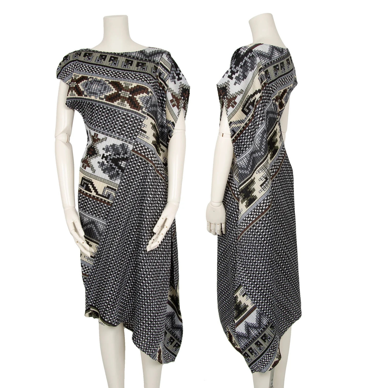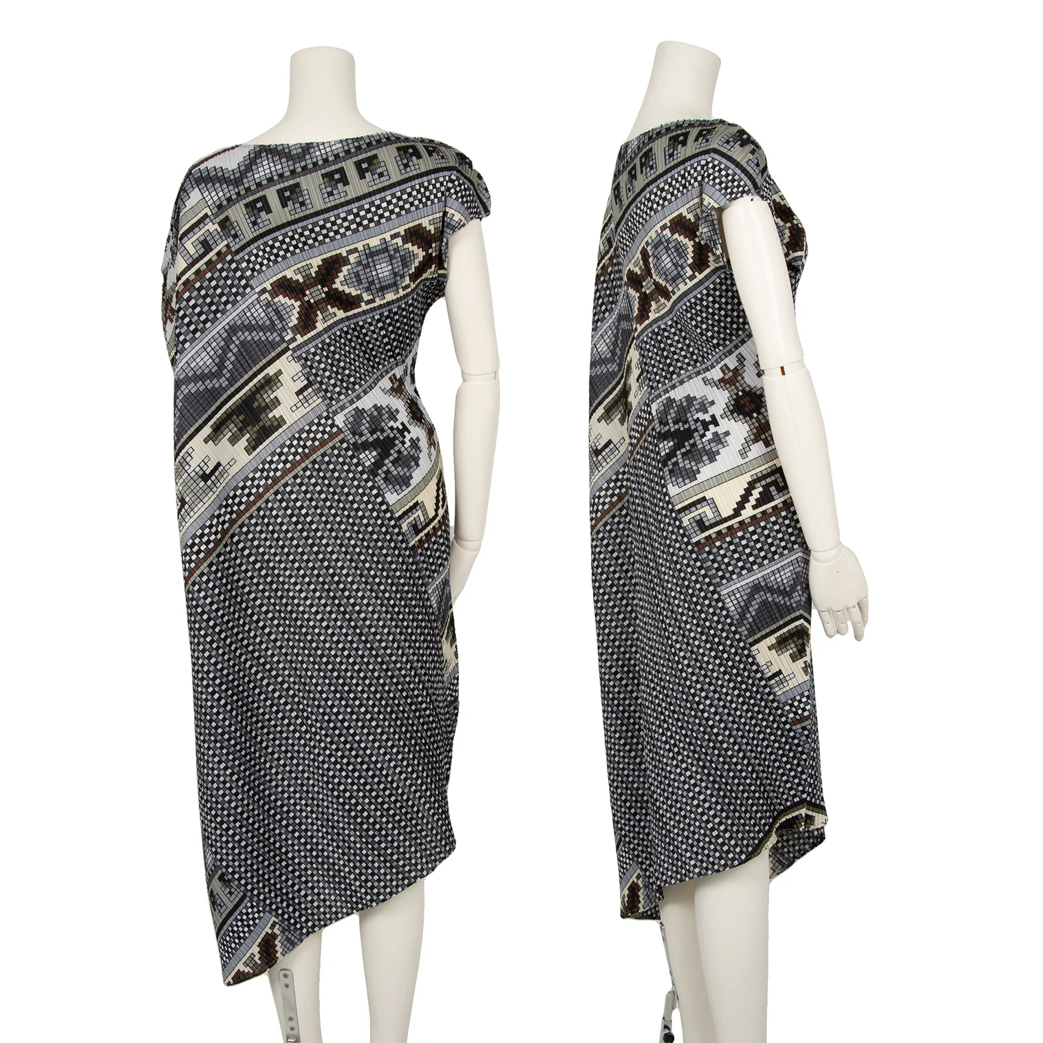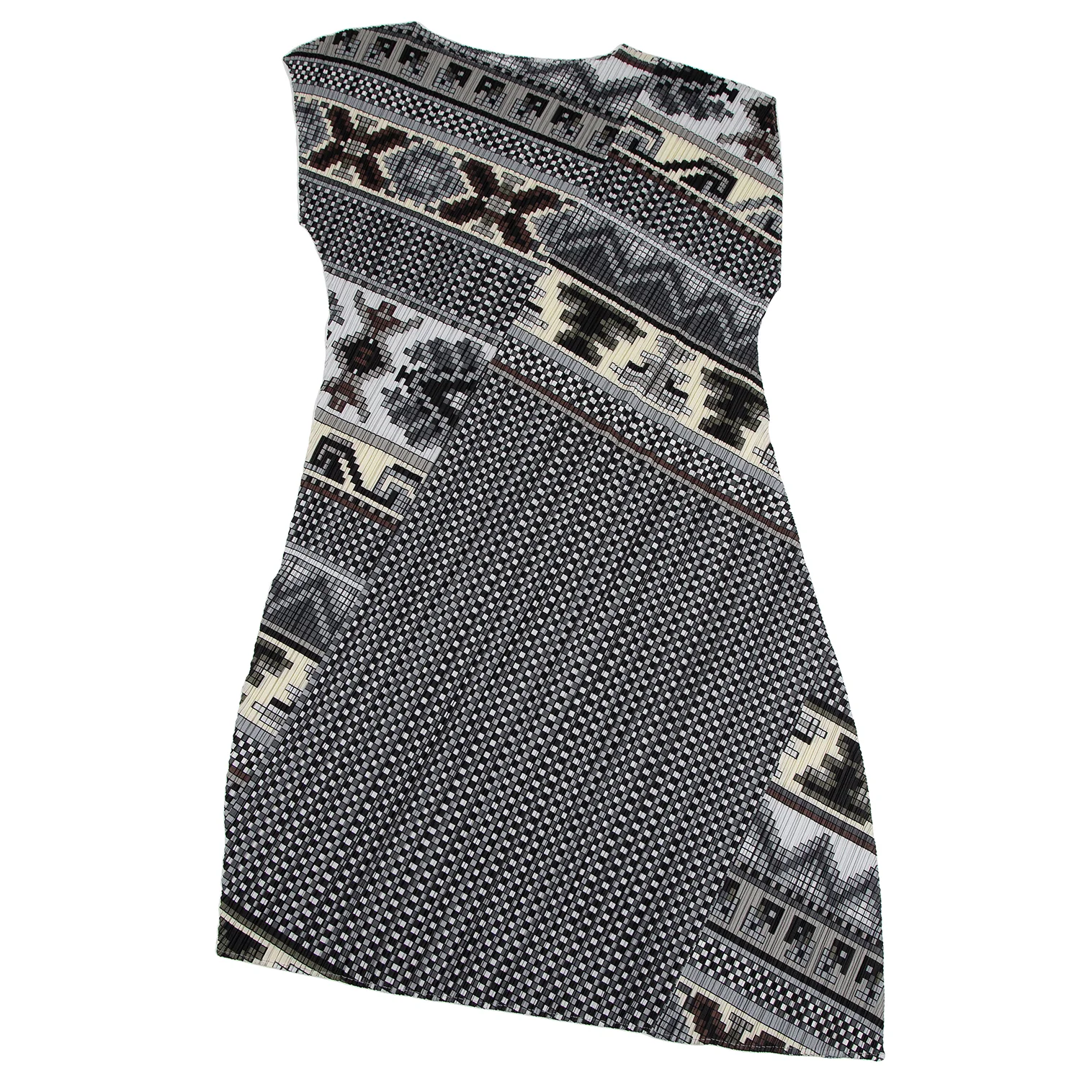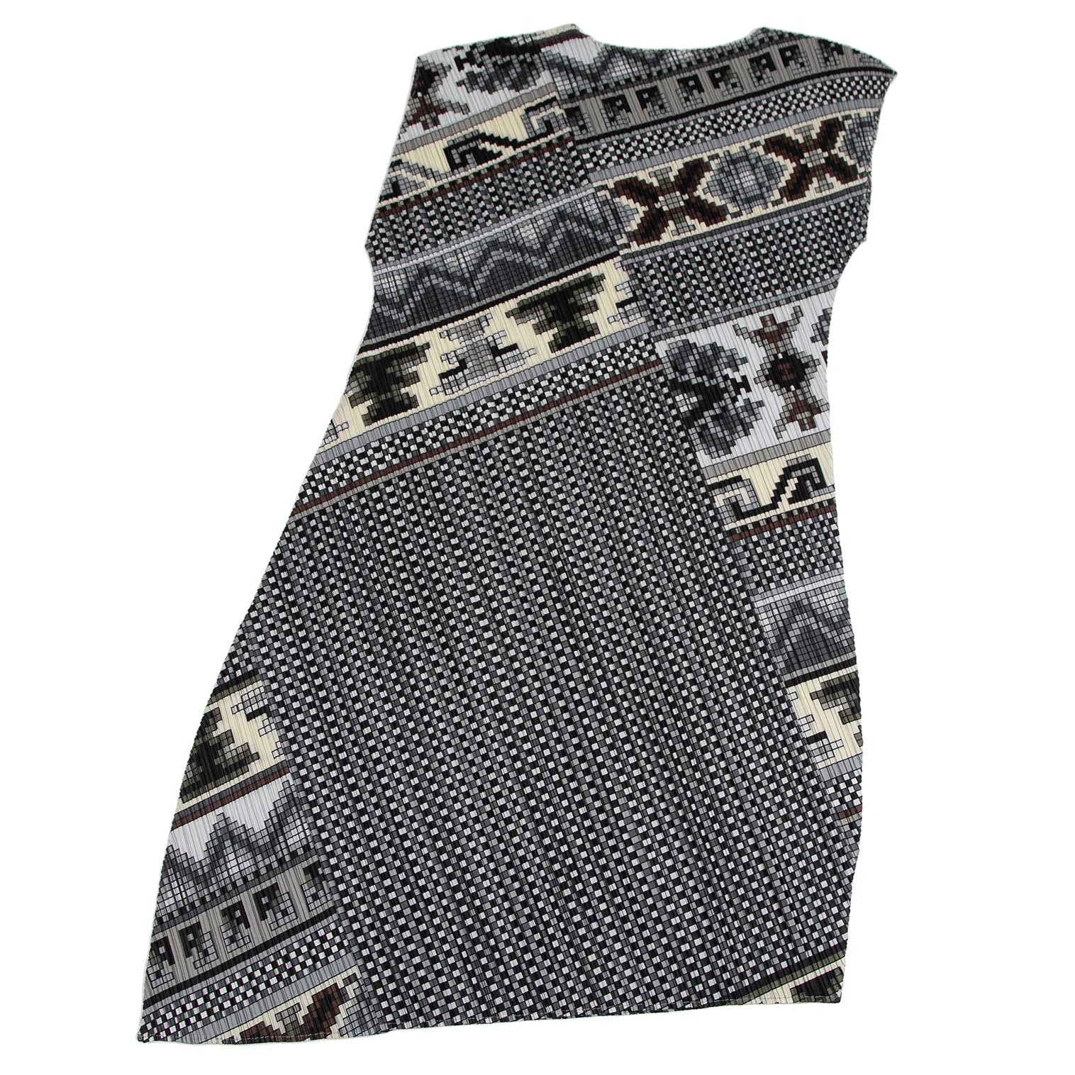 プリーツプリーズPLEATS PLEASE 斜行ブロックプリントプリーツノースリーブワンピース グレーマルチ1