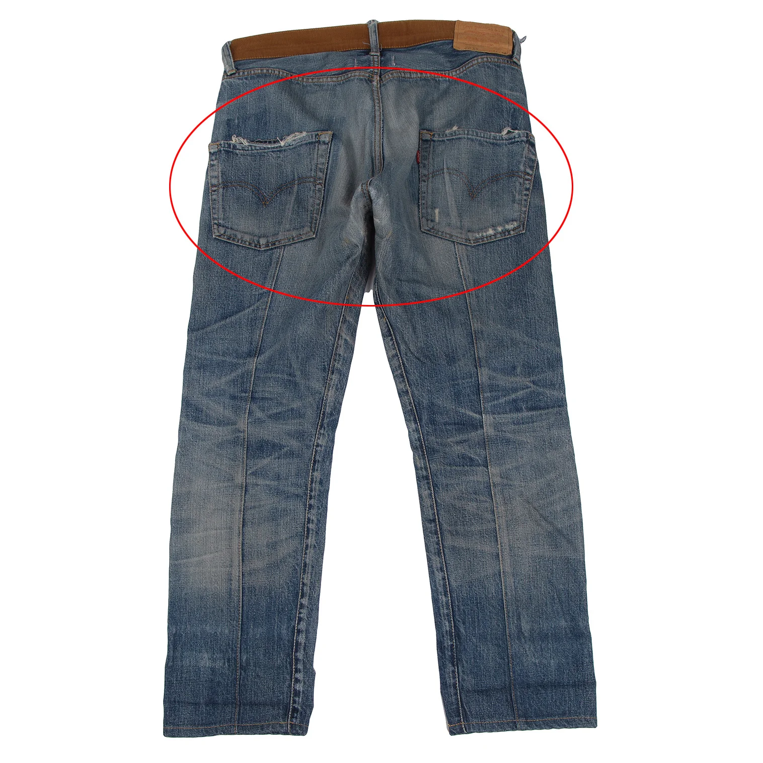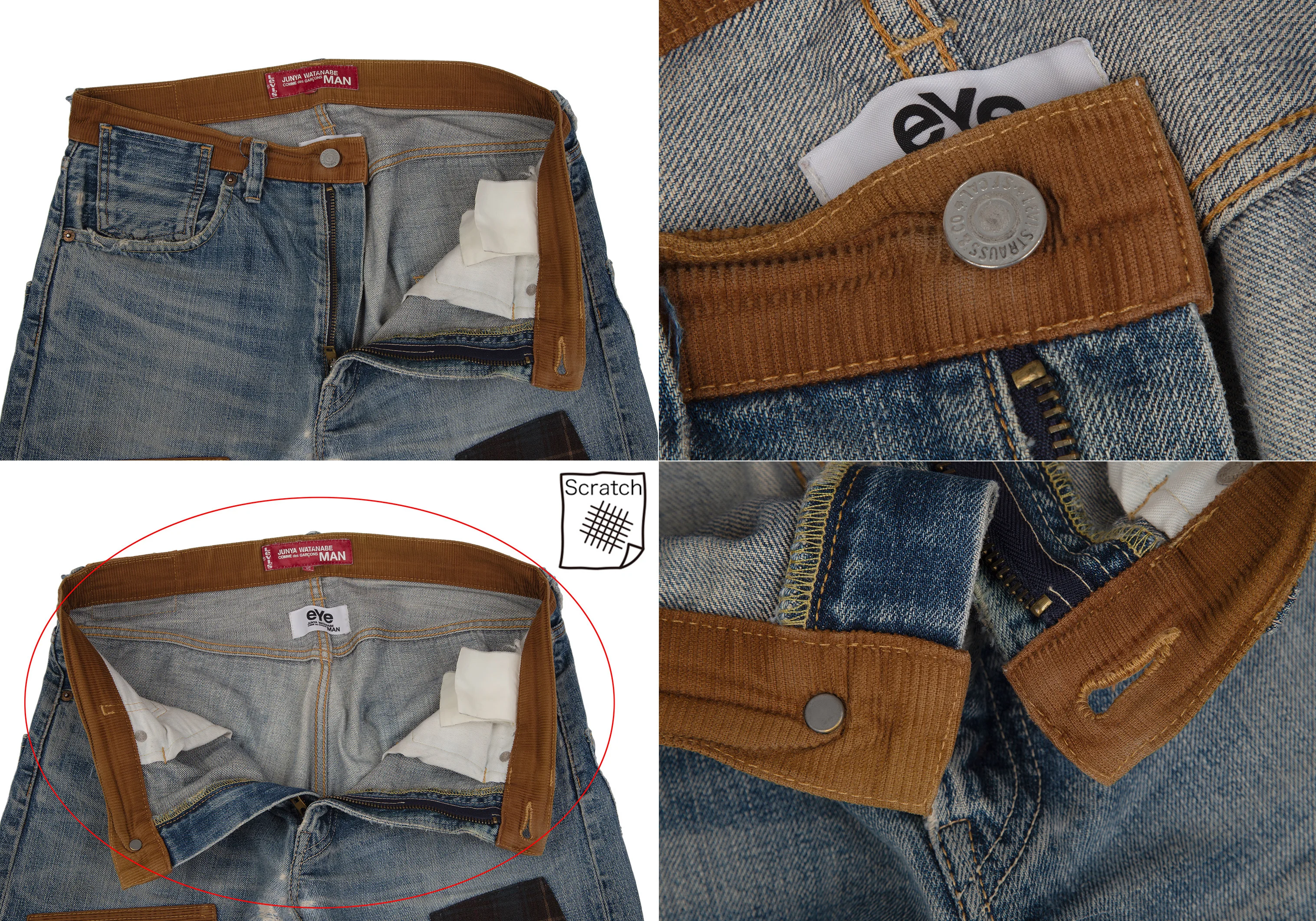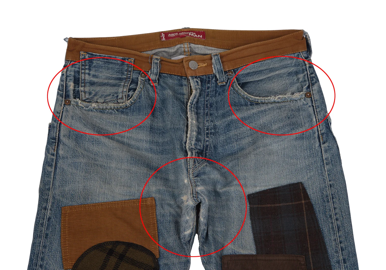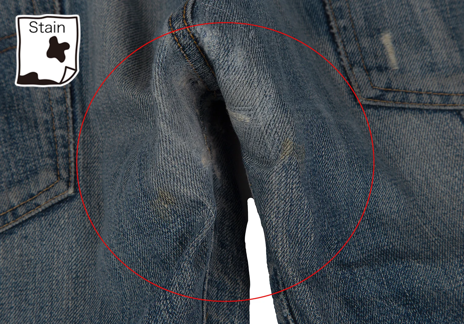 タグの印字が消えています。ポケット・股下・ベルトループにダメージ、股裏地に補修跡、後ろ股下に汚れ、ウエスト内側・前裾・裾裏にスレがあります(画像参照)。その他目立ったシミ、汚れ、ほつれ等なくいい状態です。クリーニング済み