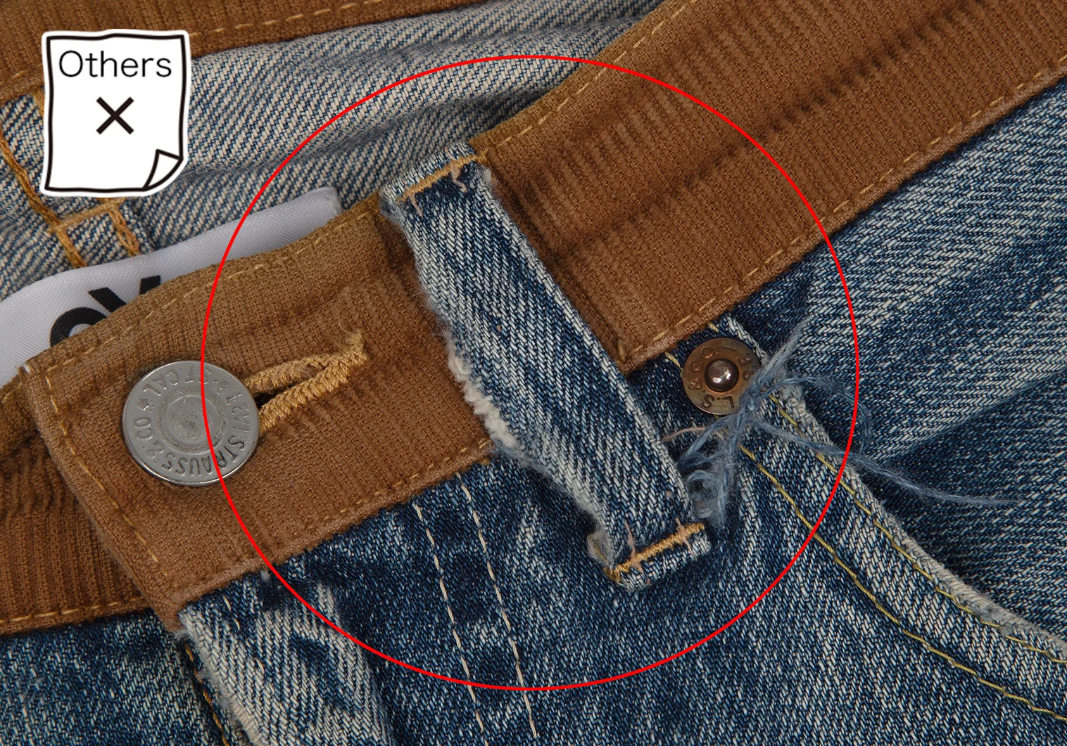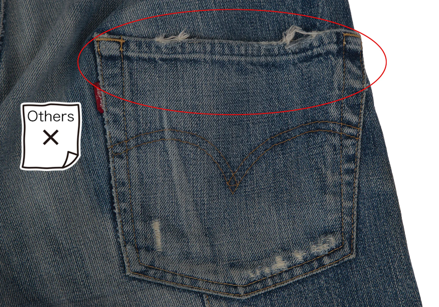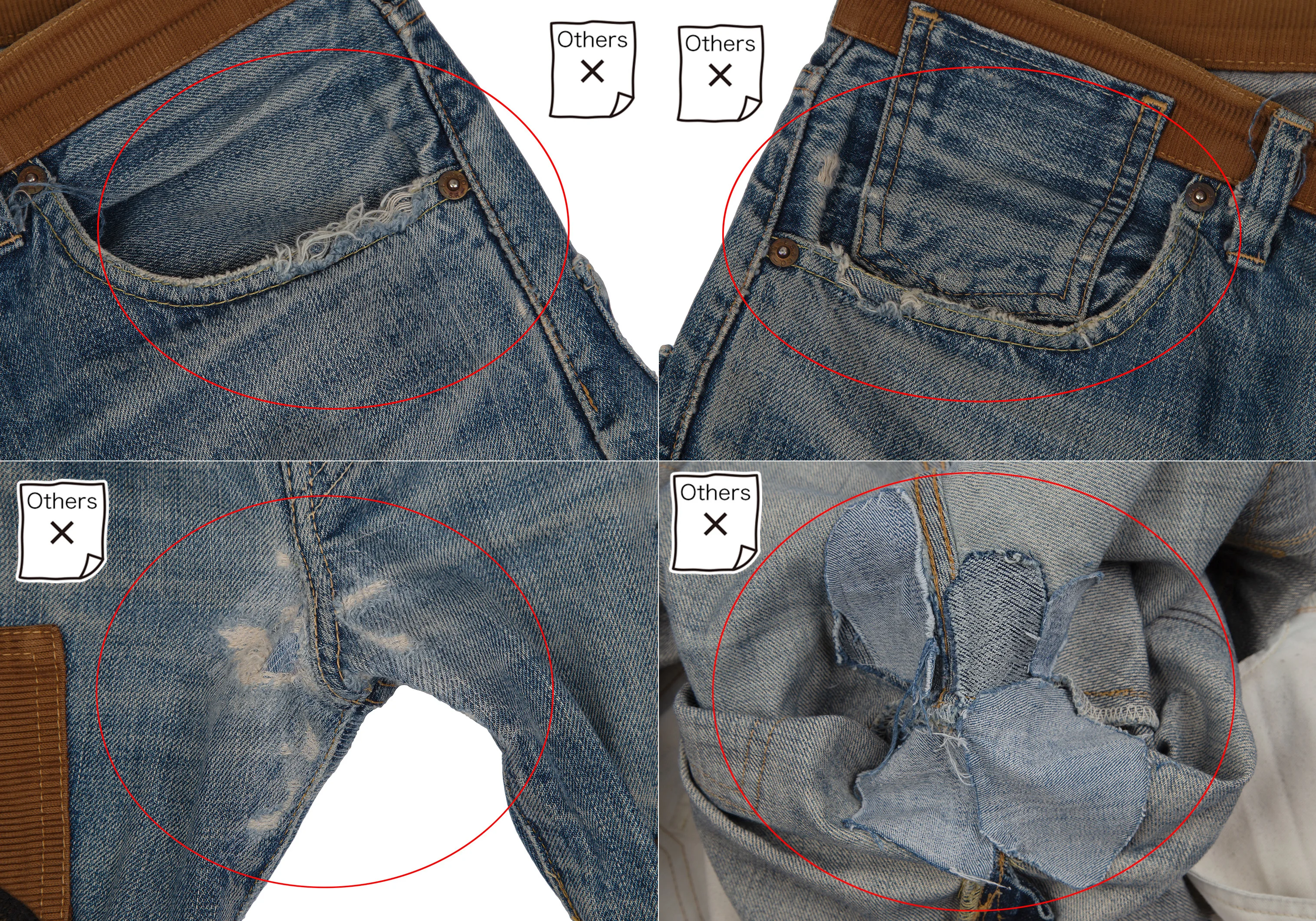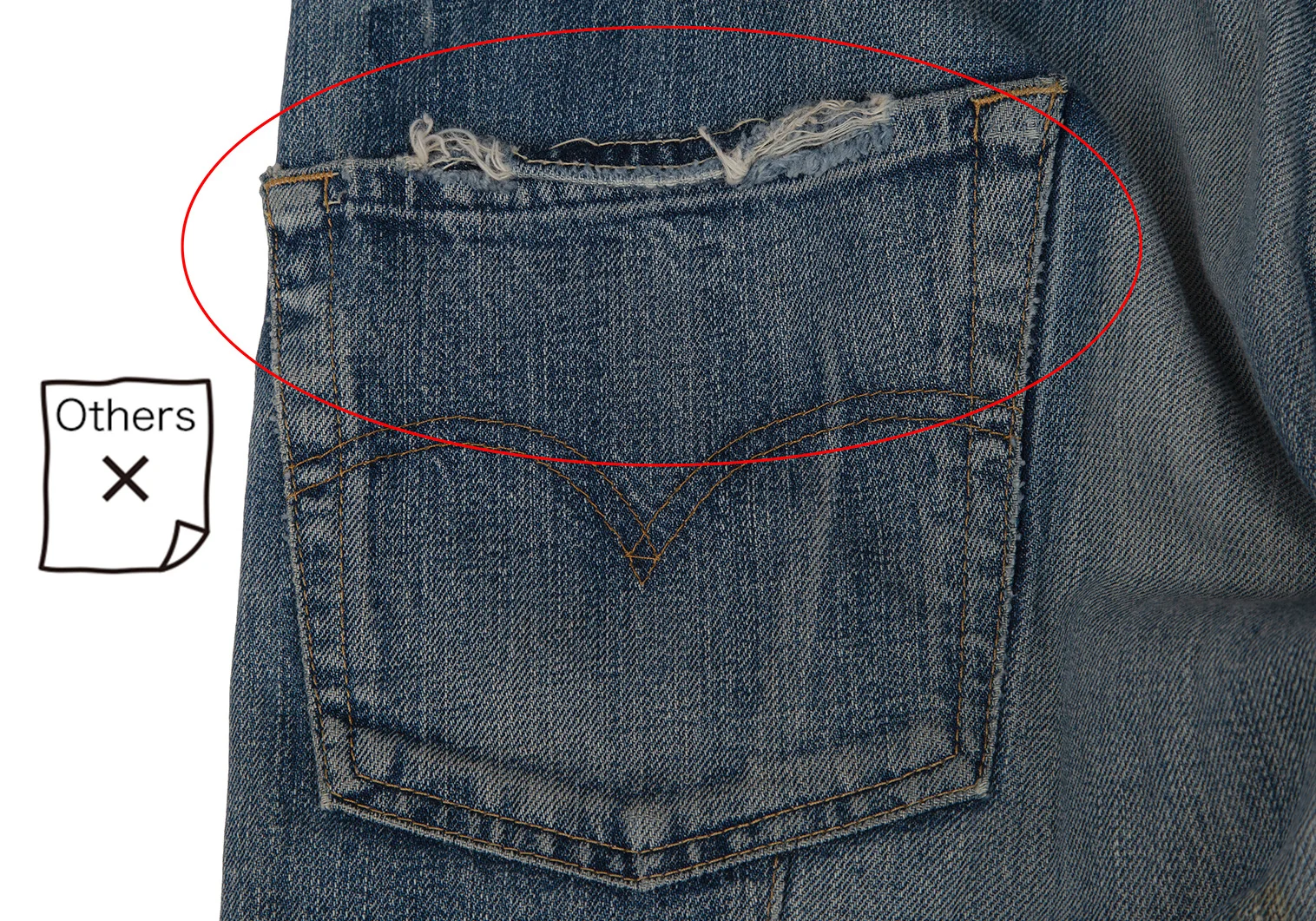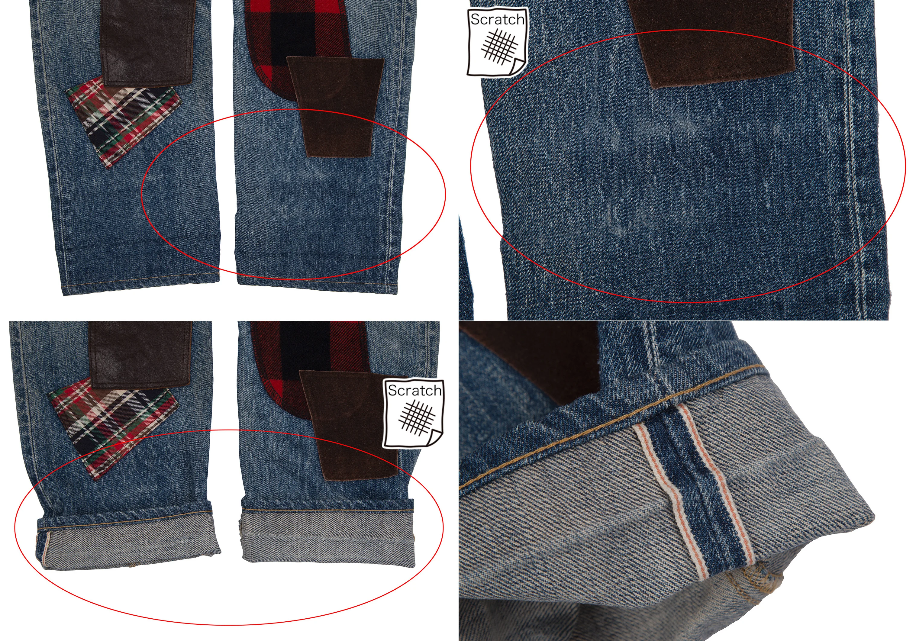 タグの印字が消えています。ポケット・股下・ベルトループにダメージ、股裏地に補修跡、後ろ股下に汚れ、ウエスト内側・前裾・裾裏にスレがあります(画像参照)。その他目立ったシミ、汚れ、ほつれ等なくいい状態です。クリーニング済み