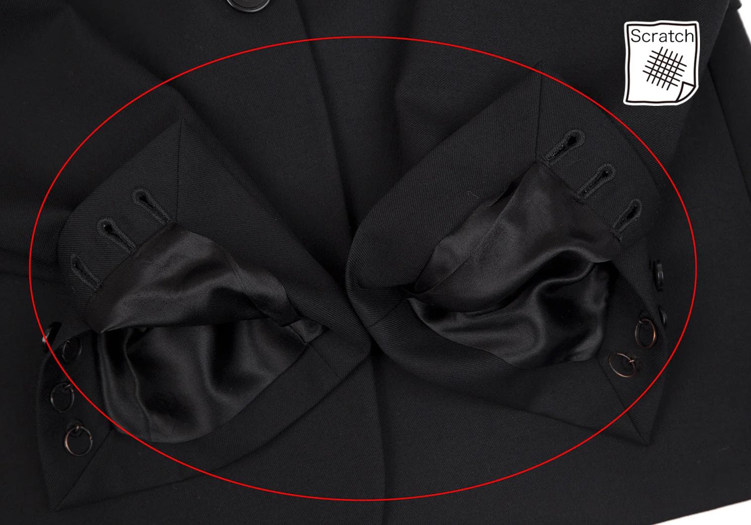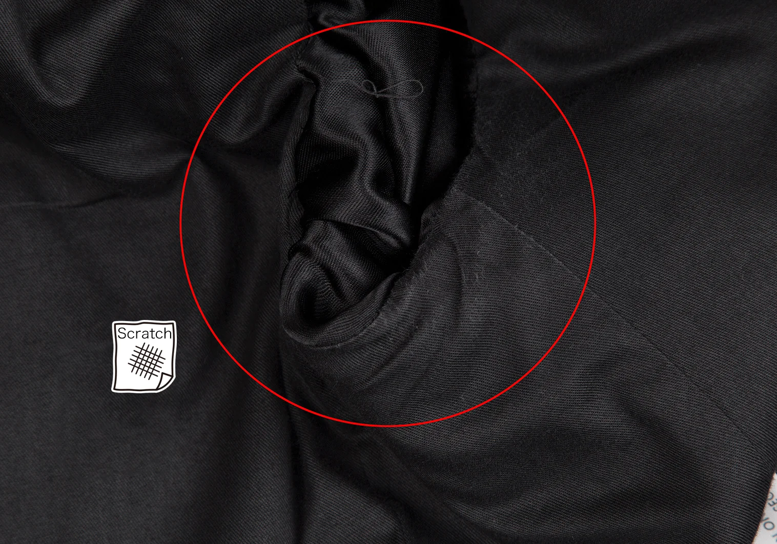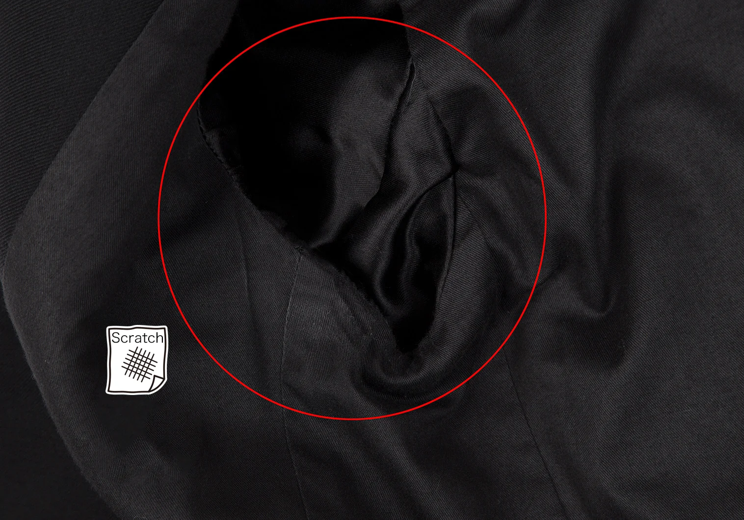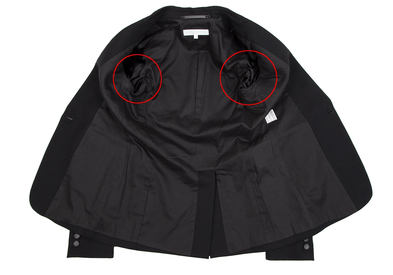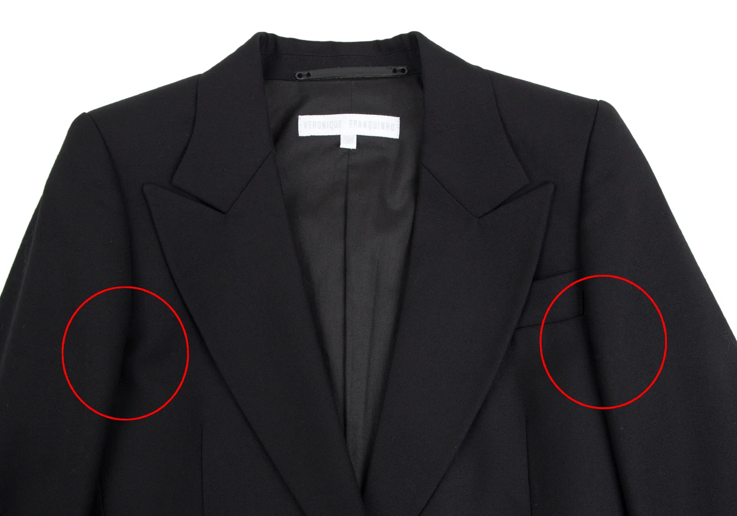 肩パッドあり。脇下・袖裏に少しスレ、袖裏金具にコーティングの剥がれ、脇裏に擦れがあります(画像参照)。その他目立ったシミ、汚れ、ほつれ等ありません。クリーニング済み