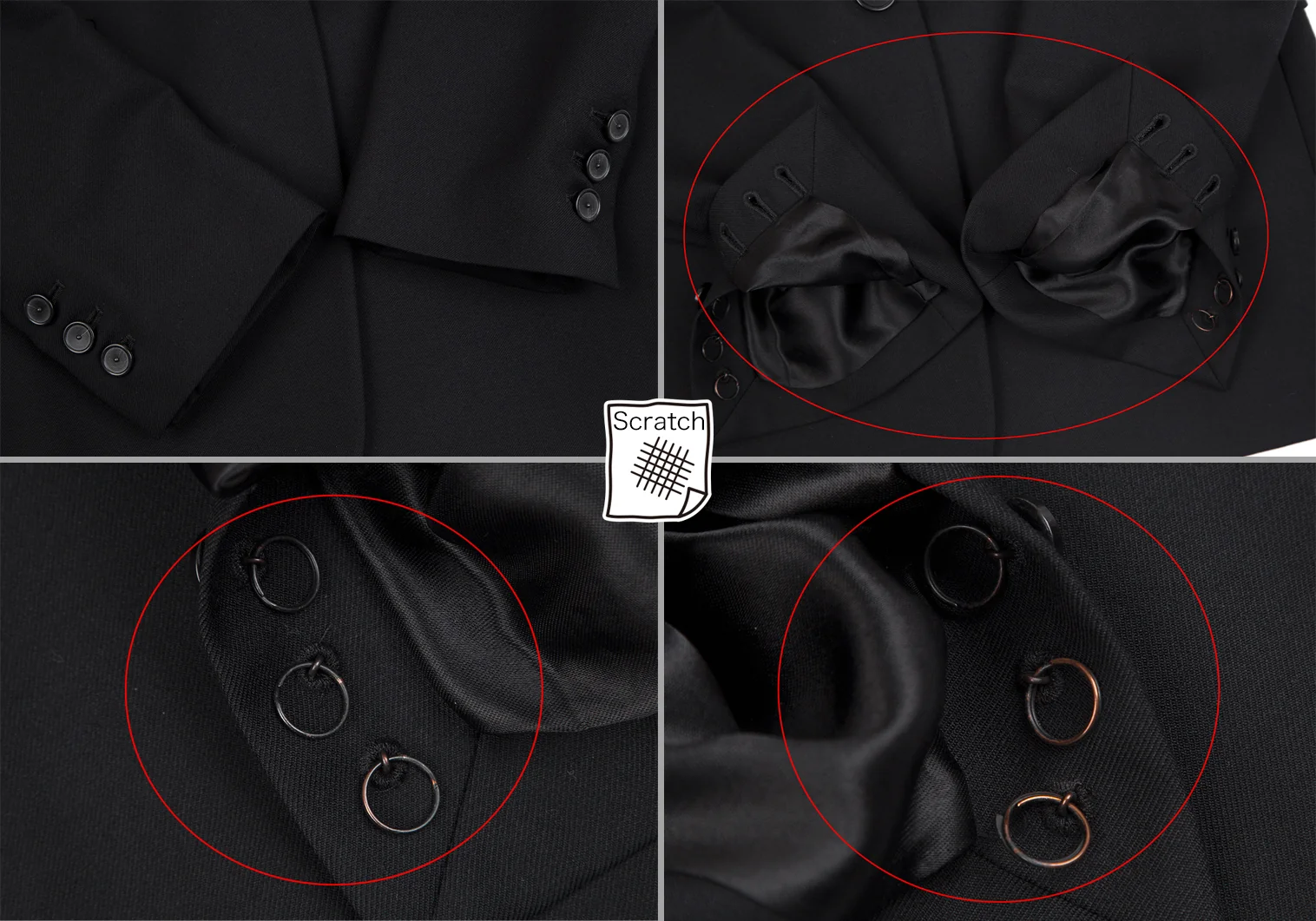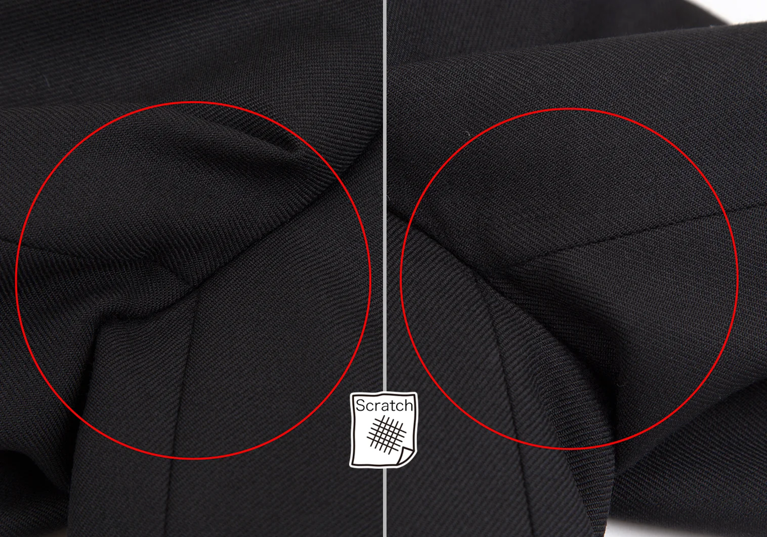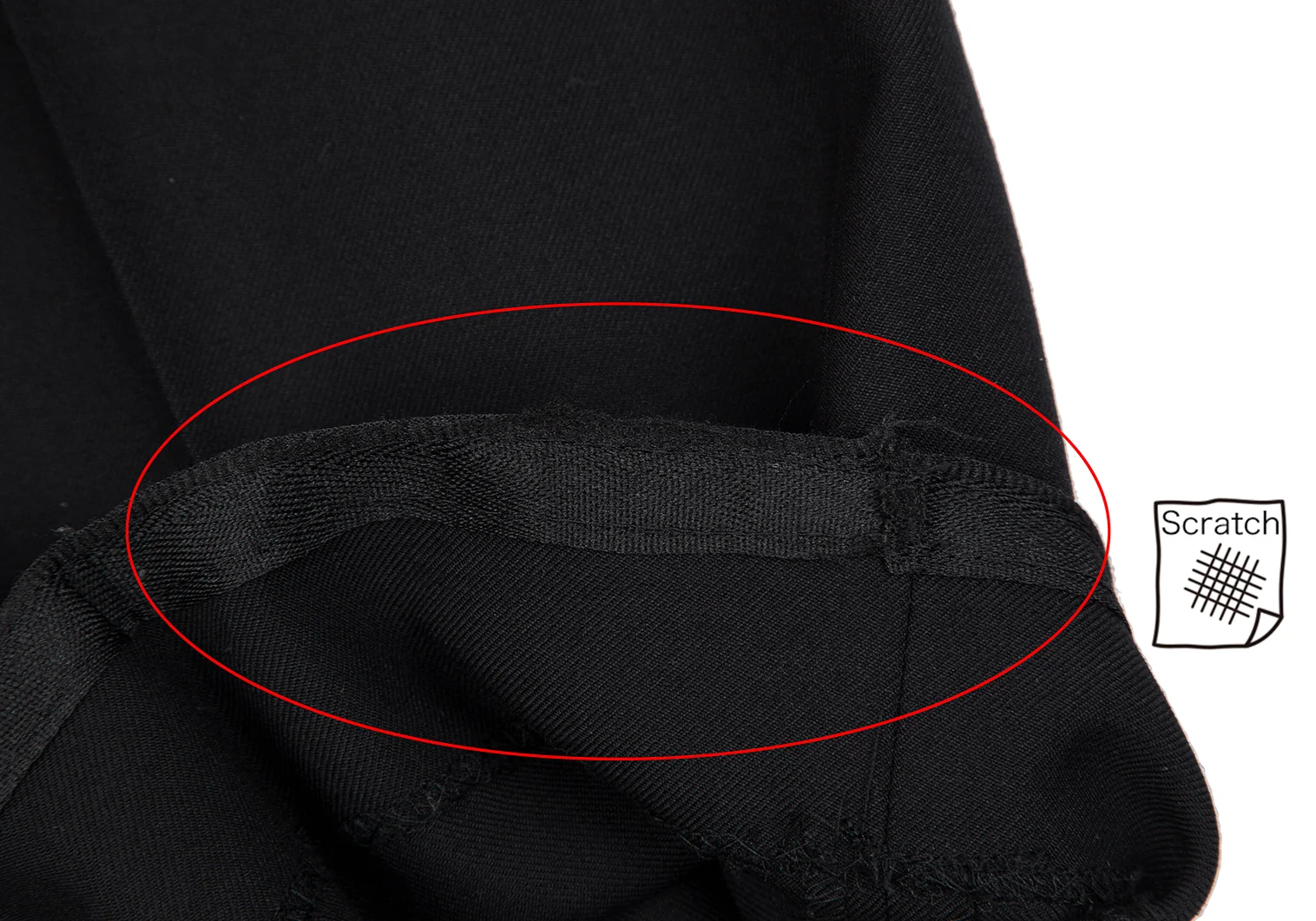 ジャケット:肩パッドあり。脇下・袖裏に少し擦れ、袖裏金具にコーティングの剥がれ、脇裏に擦れがあります。パンツ:品質表示タグがありません。裾裏に擦れがあります(画像参照)。その他目立ったシミ、汚れ、ほつれ等ありません。クリーニング済み
