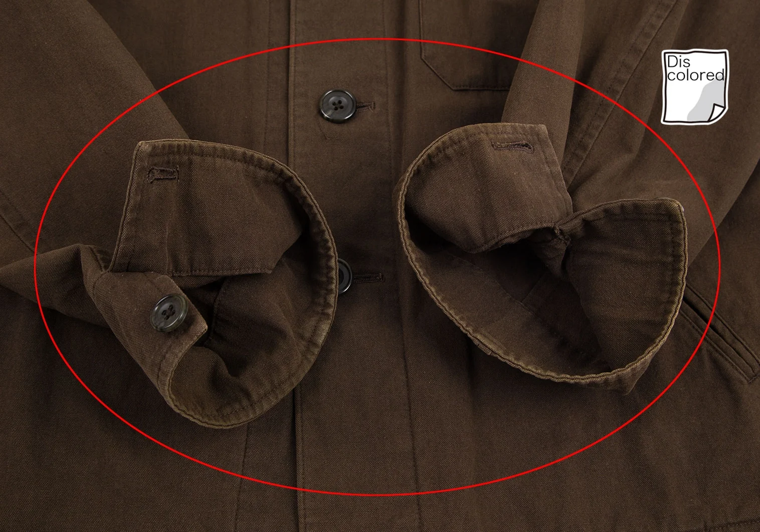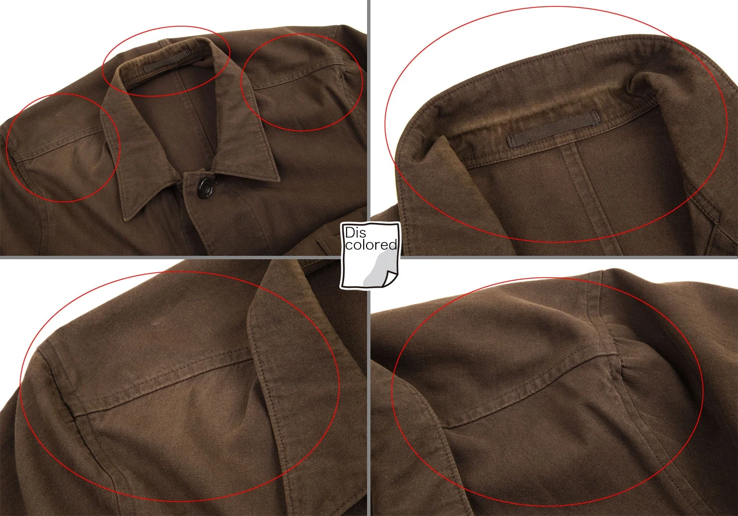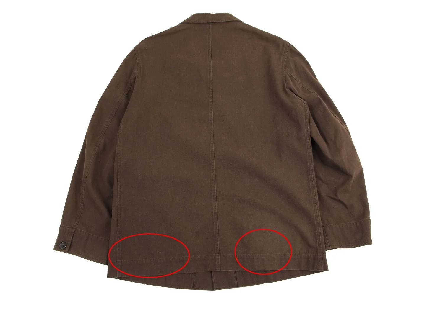 脇下・襟裏・後ろ裾に変色、袖先・肩に色褪せがあります(写真参照)。その他に目立ったシミ、汚れ、ほつれ等はありません。クリーニング済み