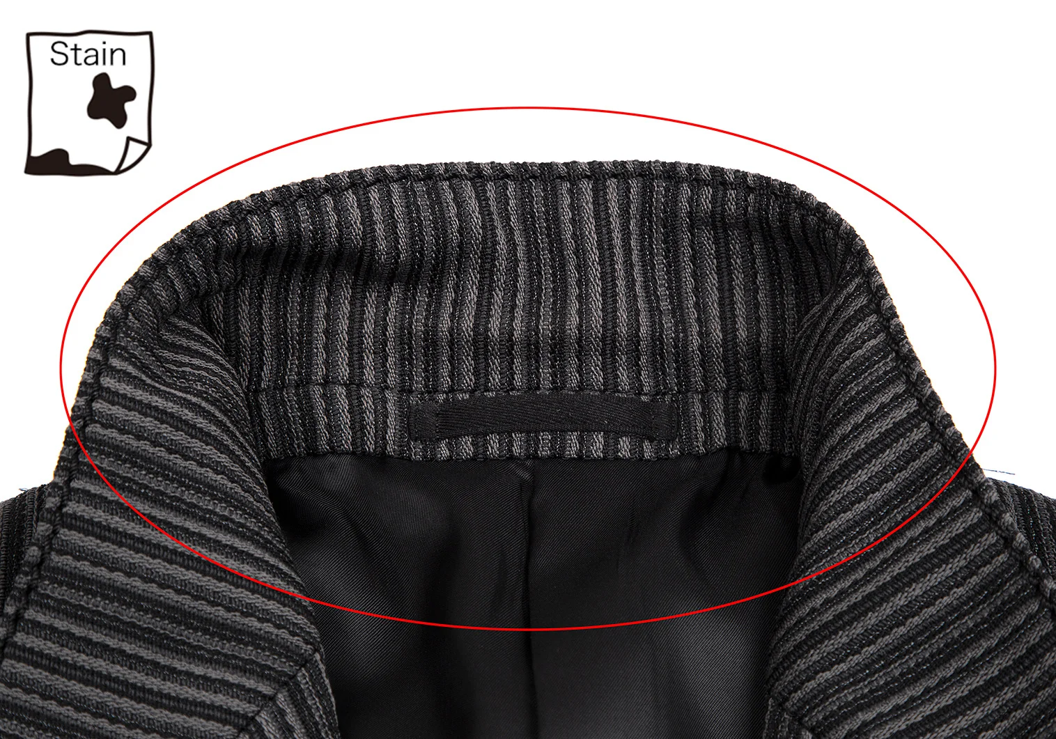 肩パットがあります。襟裏に薄汚れがあります(画像参照)。その他目立ったシミ、汚れ、ほつれ等なくいい状態です。クリーニング済み