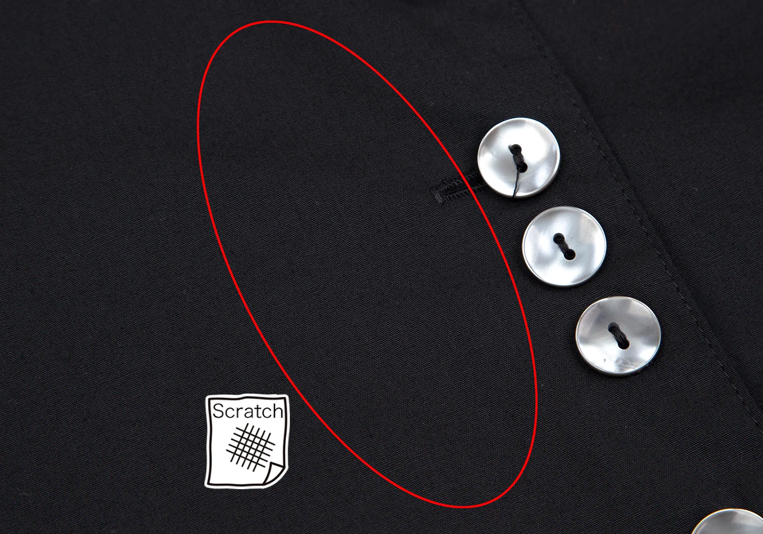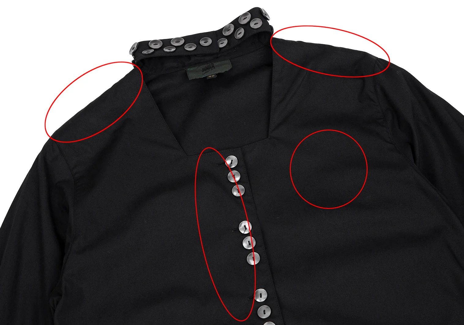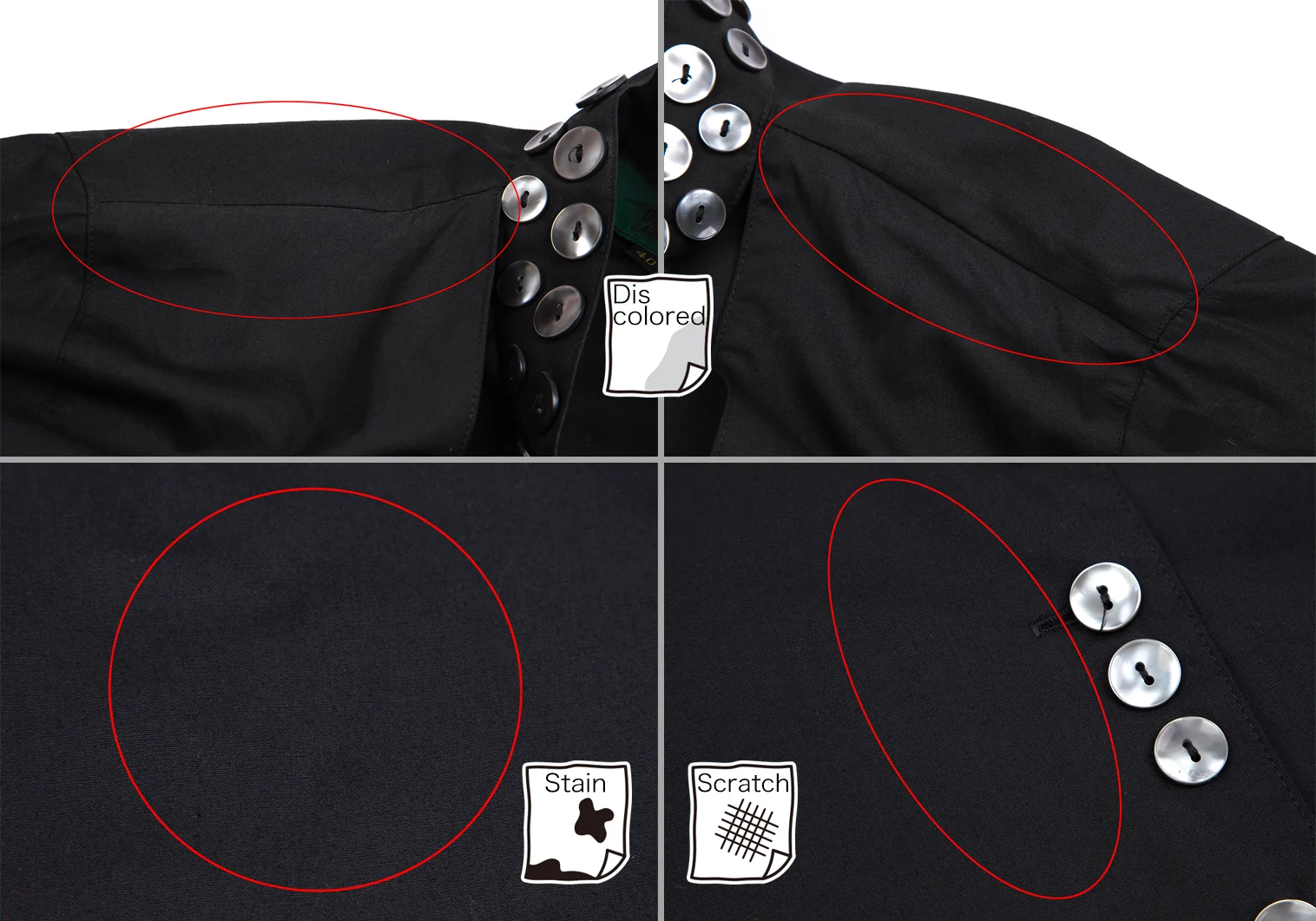 肩に少しヤケ、胸元シミ、前身頃擦れ、袖裏に多少色褪せがあります。(写真参照)その他目立ったシミ、汚れ、ほつれ等ありません。クリーニング済み