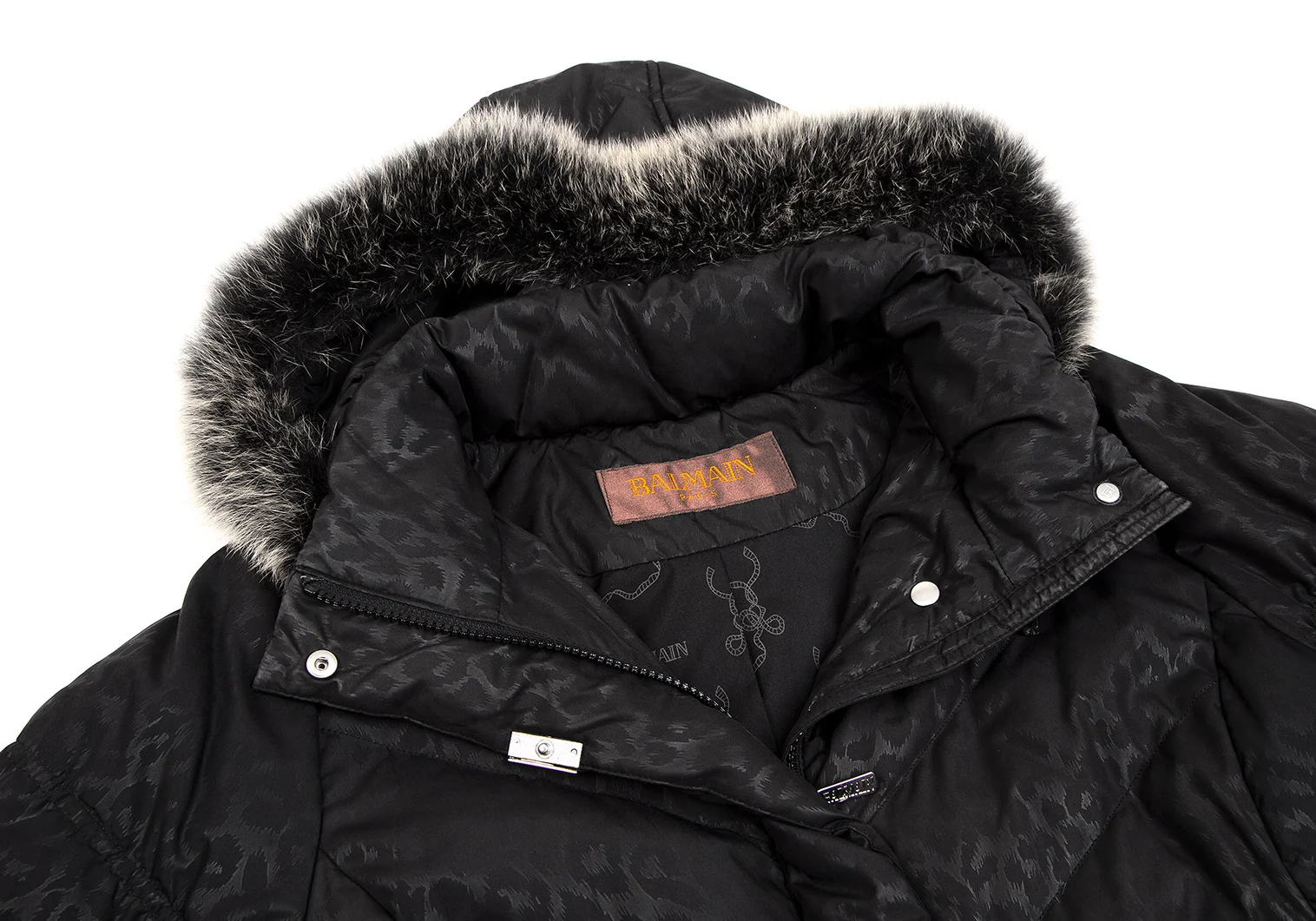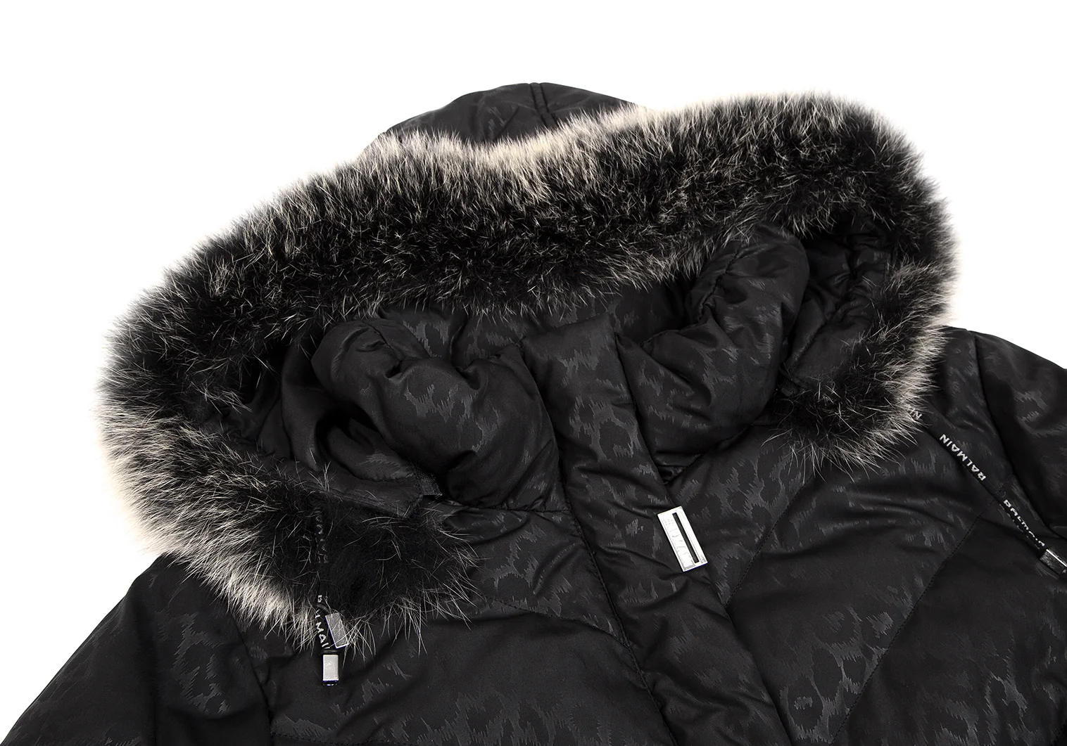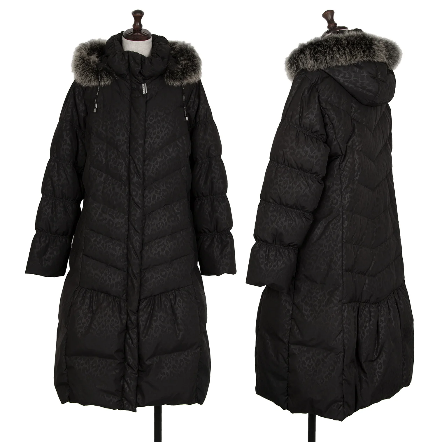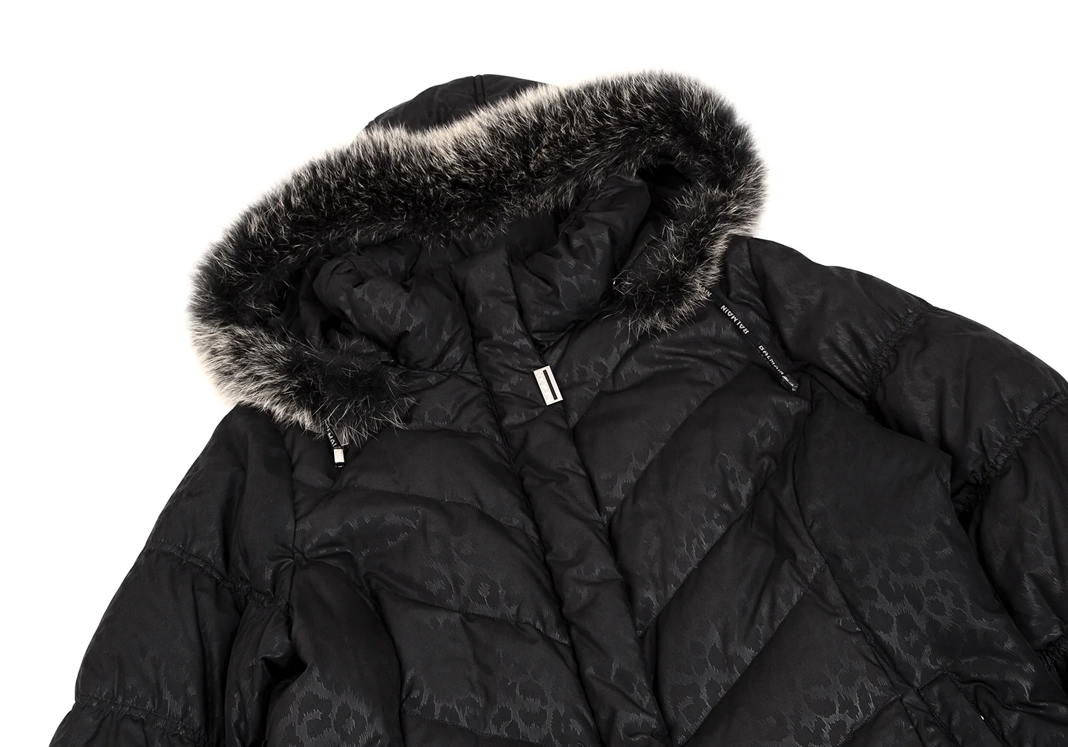 バルマンBALMAIN ブルーフォックスファー着脱レオパードプリントフードダウンコート 黒M