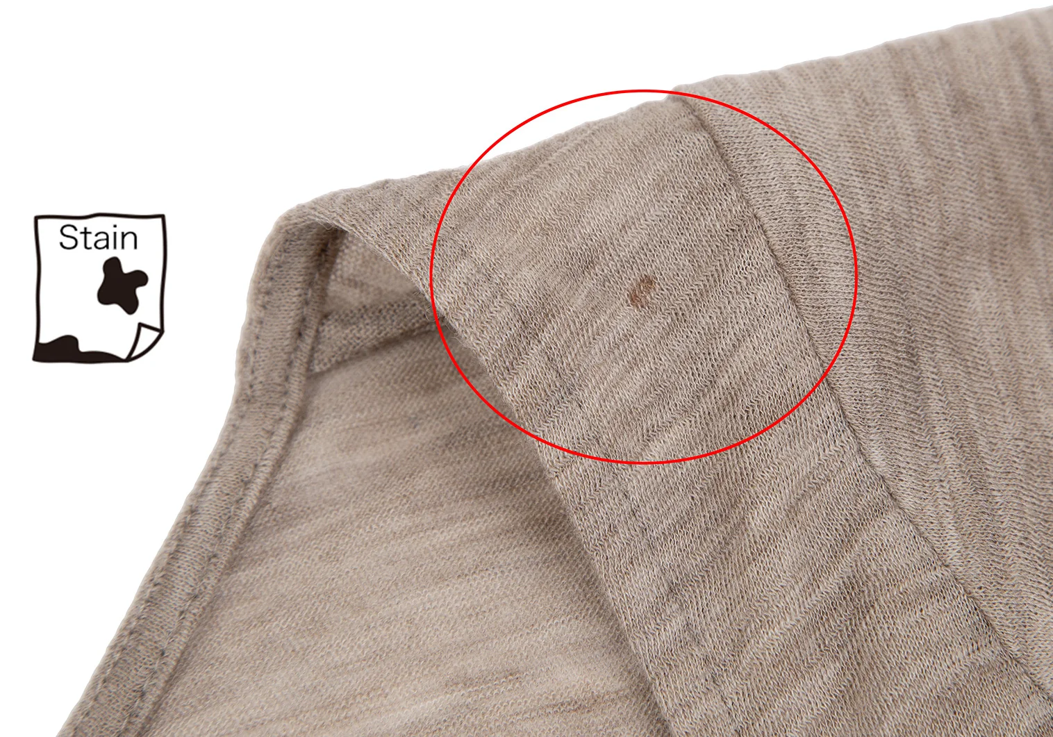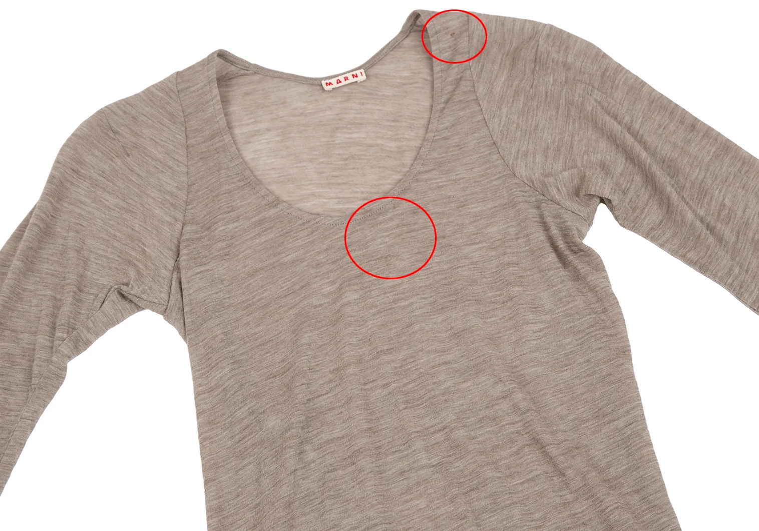 若干の透け感があります。左肩に点シミ・前に薄シミがあります(写真参照)。その他目立ったシミ、汚れ、ほつれ等なくいい状態です。クリーニング済み