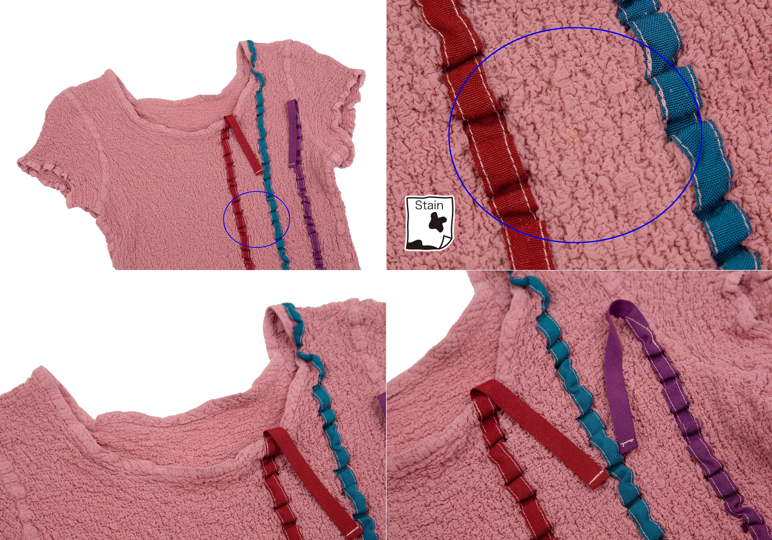 Tシャツ:前身頃に薄シミ・引っかけがあります。スカート:前身頃に薄シミがあります(画像参照)。その他目立ったシミ、汚れ、ほつれ等なくいい状態です。クリーニング済み