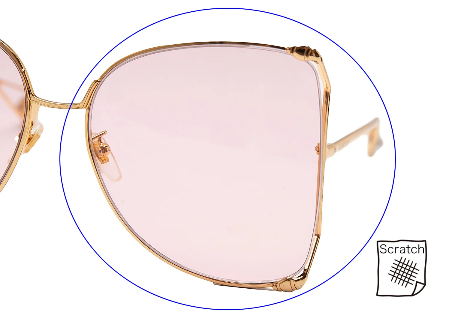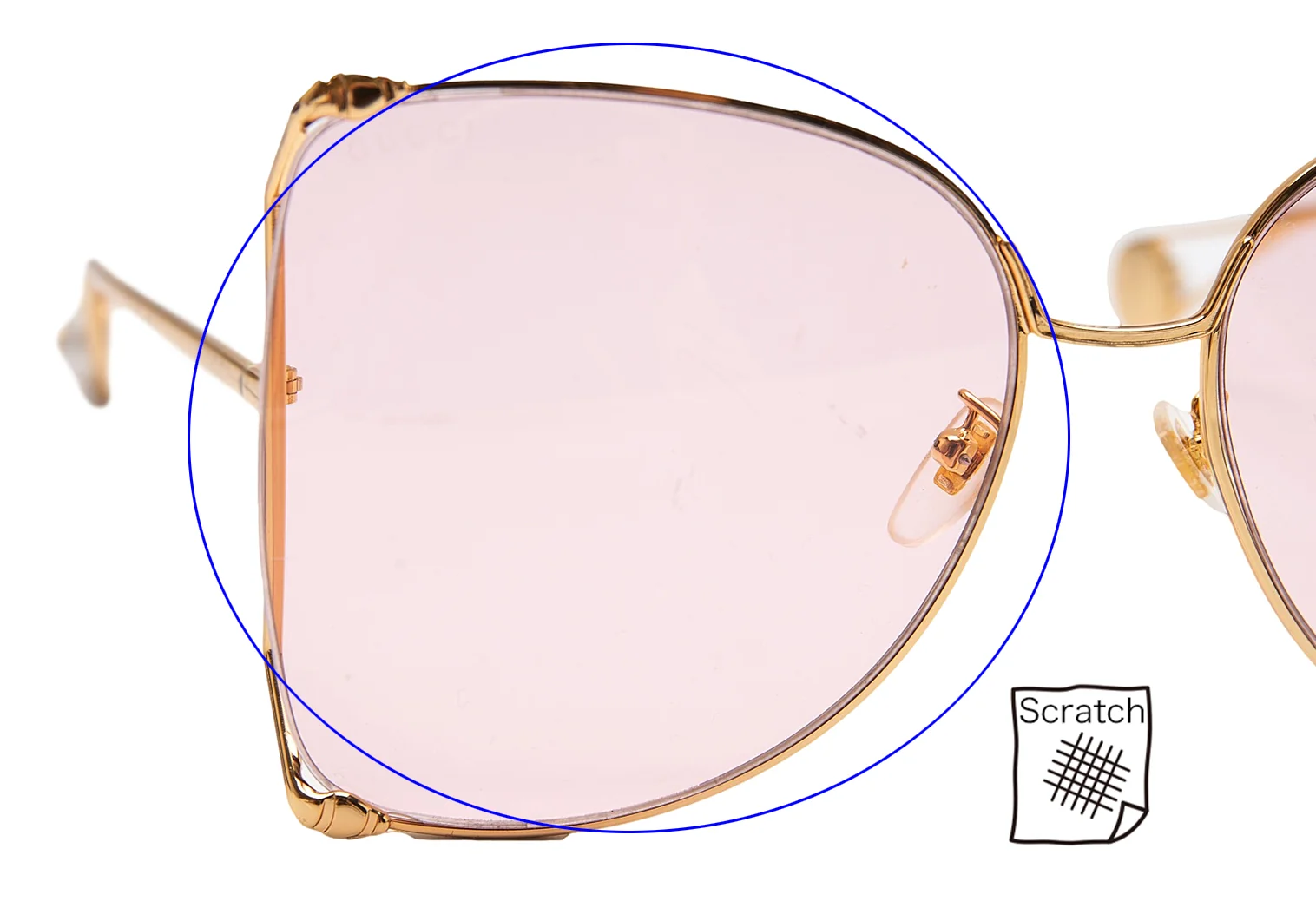 レンズにスレ、フレームにダメージがあります(写真参照)お客様一人一人の視力、骨格、鼻幅、耳の高さが違います。このような理由からオンラインショップでの度付きレンズ販売はしておりません。 お手数をおかけしますが、度入りレンズはお近くの眼鏡店等でお買い求めください。 他眼鏡店にてレンズの入れ替え、調整等に生じた不具合、破損については一切の責任を負いかねますので予めご了承下さい。