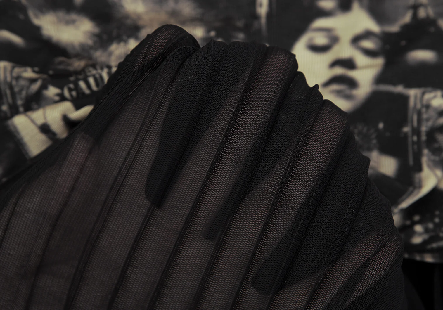 ジャンポールゴルチエ ファムJean Paul GAULTIER FEMME パワーネットプリーツレイヤードフェイスプリントストレッチスカート 黒ベージュ40