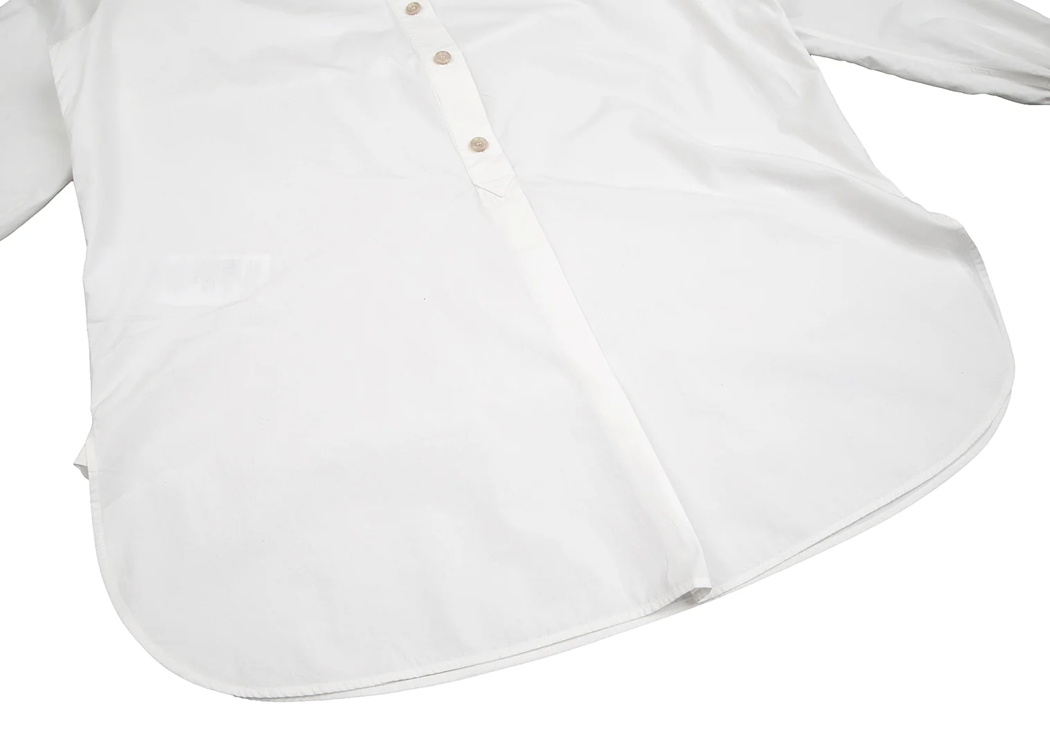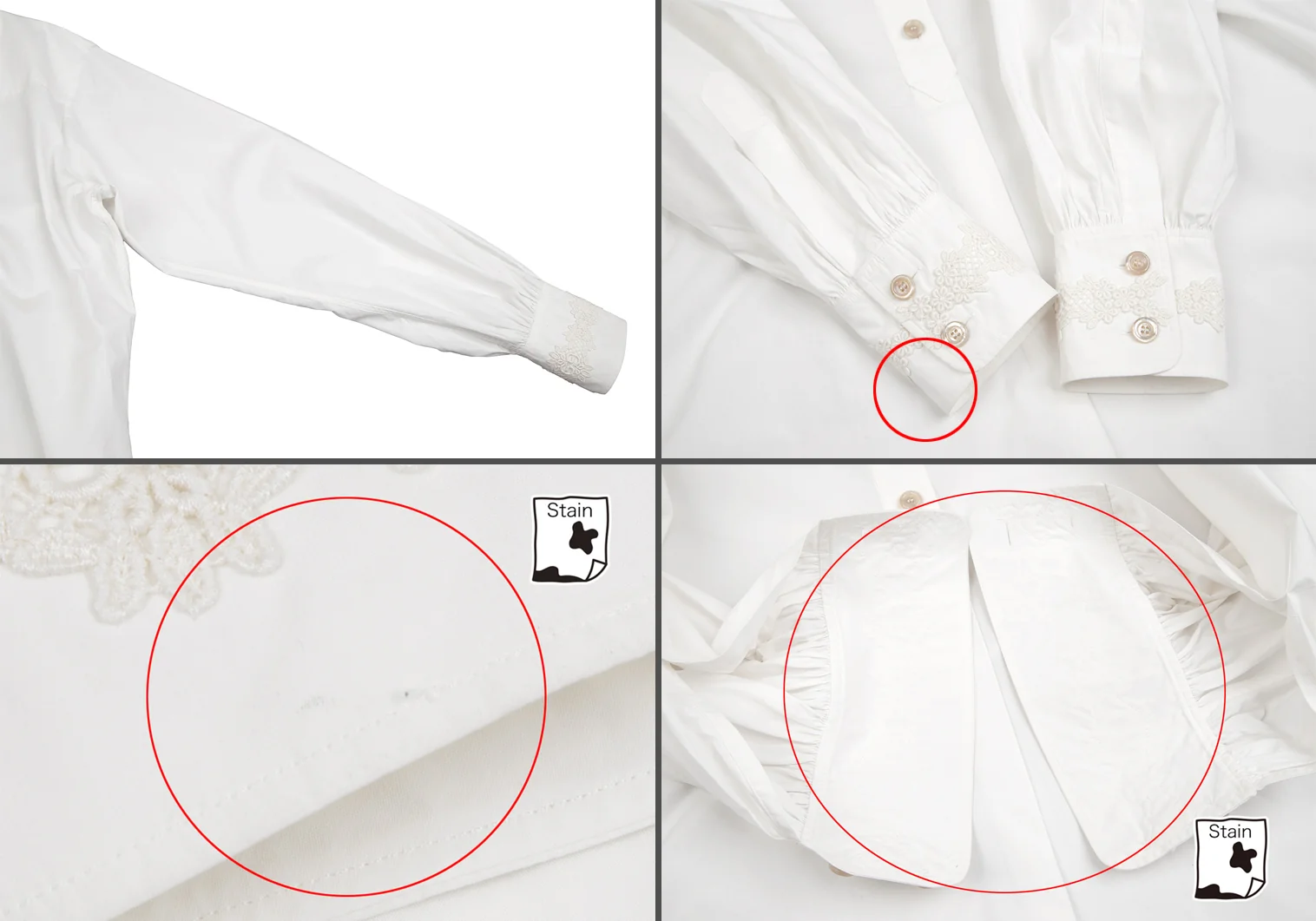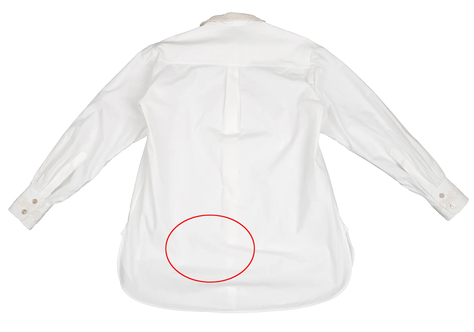 透け感があります。首周りに薄シミ、前立て裏・右袖先・袖裏、後ろ裾に薄汚れがあります。(写真参照)その他目立ったシミ、汚れ、ほつれ等なくいい状態です。クリーニング済み