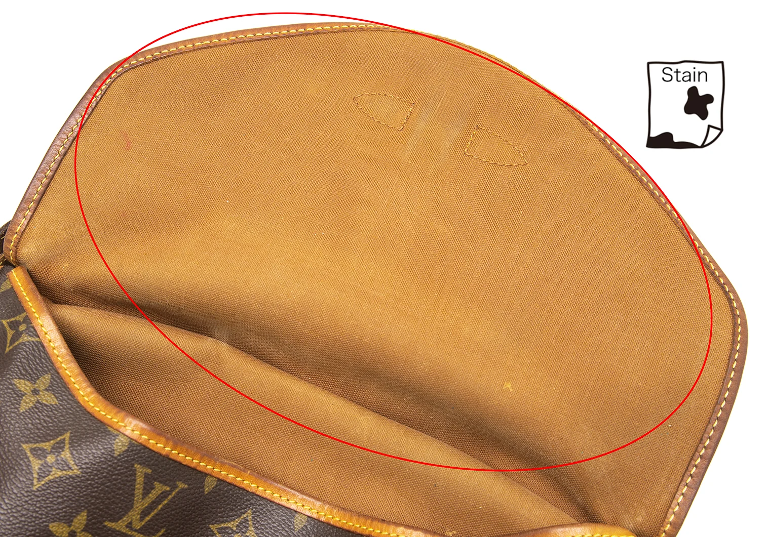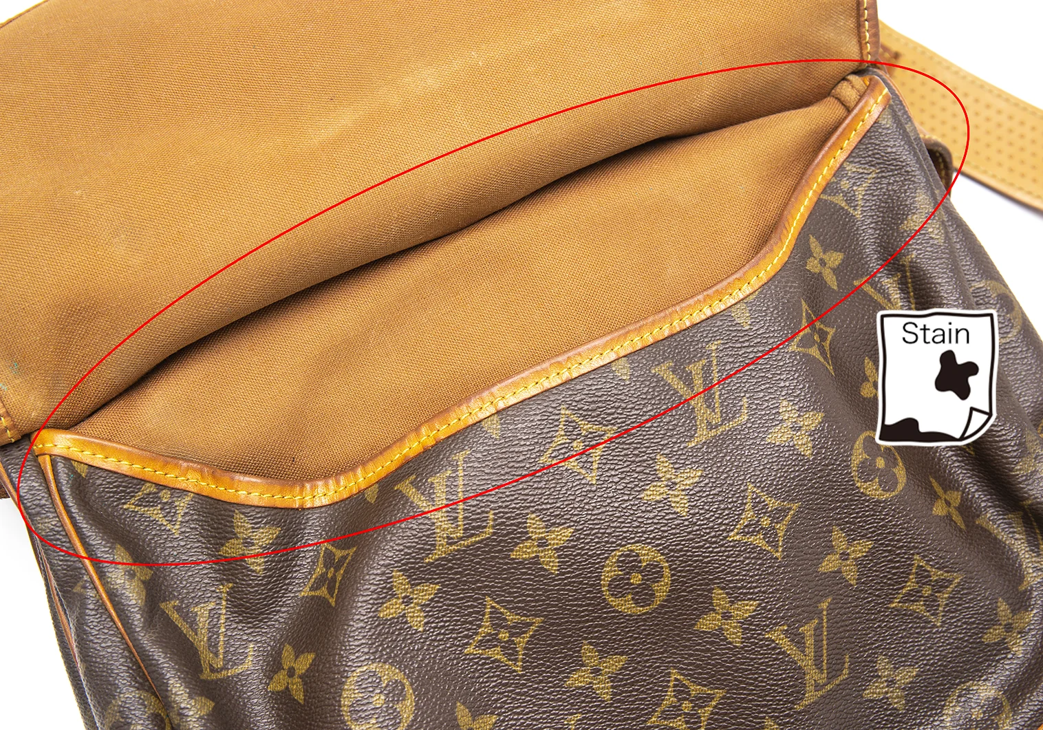 ヌメ側に変色・角スレ、フラップ内側に変色、金具のサビがあります(写真参照)。使用感がありますが、まだまだお使いいただけるお品です。