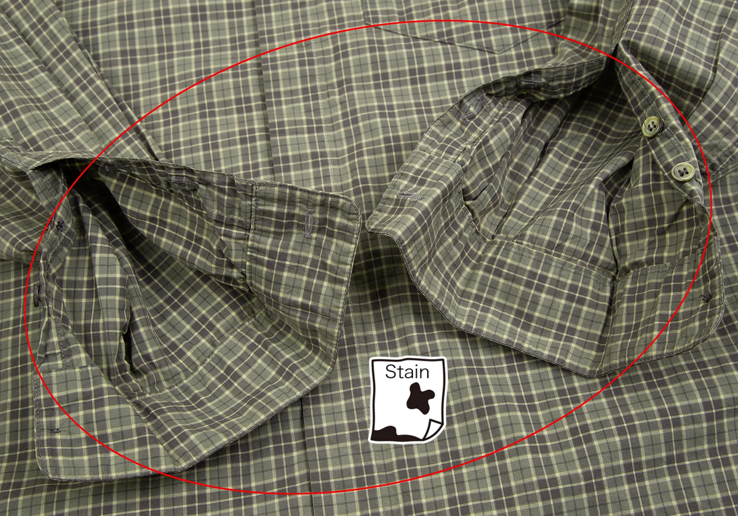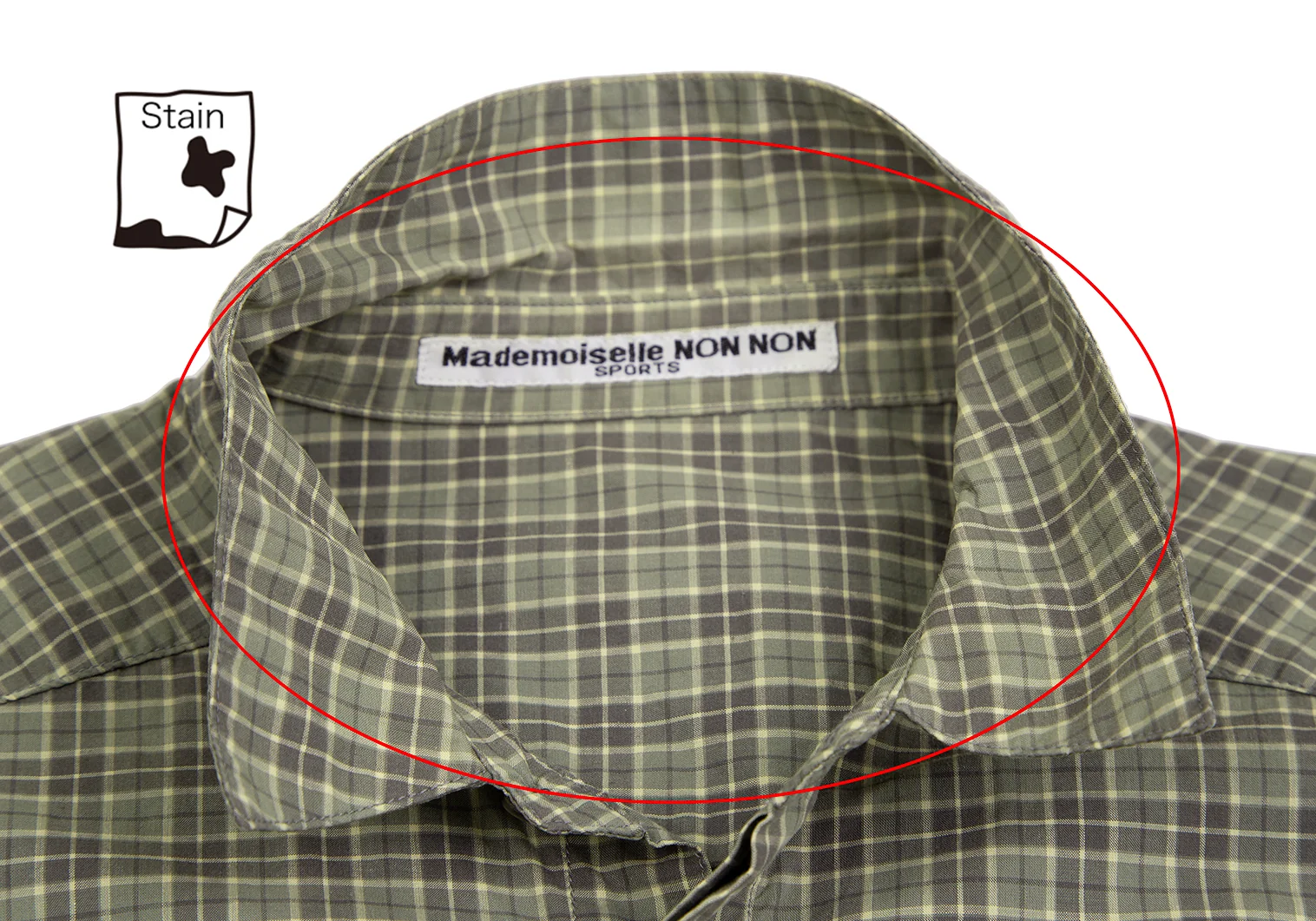 襟元・袖口に汚れ、前身頃にシミがあります(写真参照)その他目立ったシミ、汚れ、ほつれ等なくいい状態です。クリーニング済み