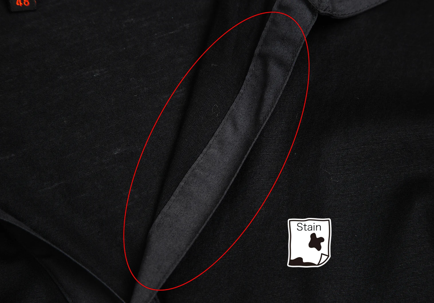 襟元に薄汚れ、後ろ首元に小穴があります(写真参照)その他目立ったシミ、汚れ、ほつれ等はありません。クリーニング済み