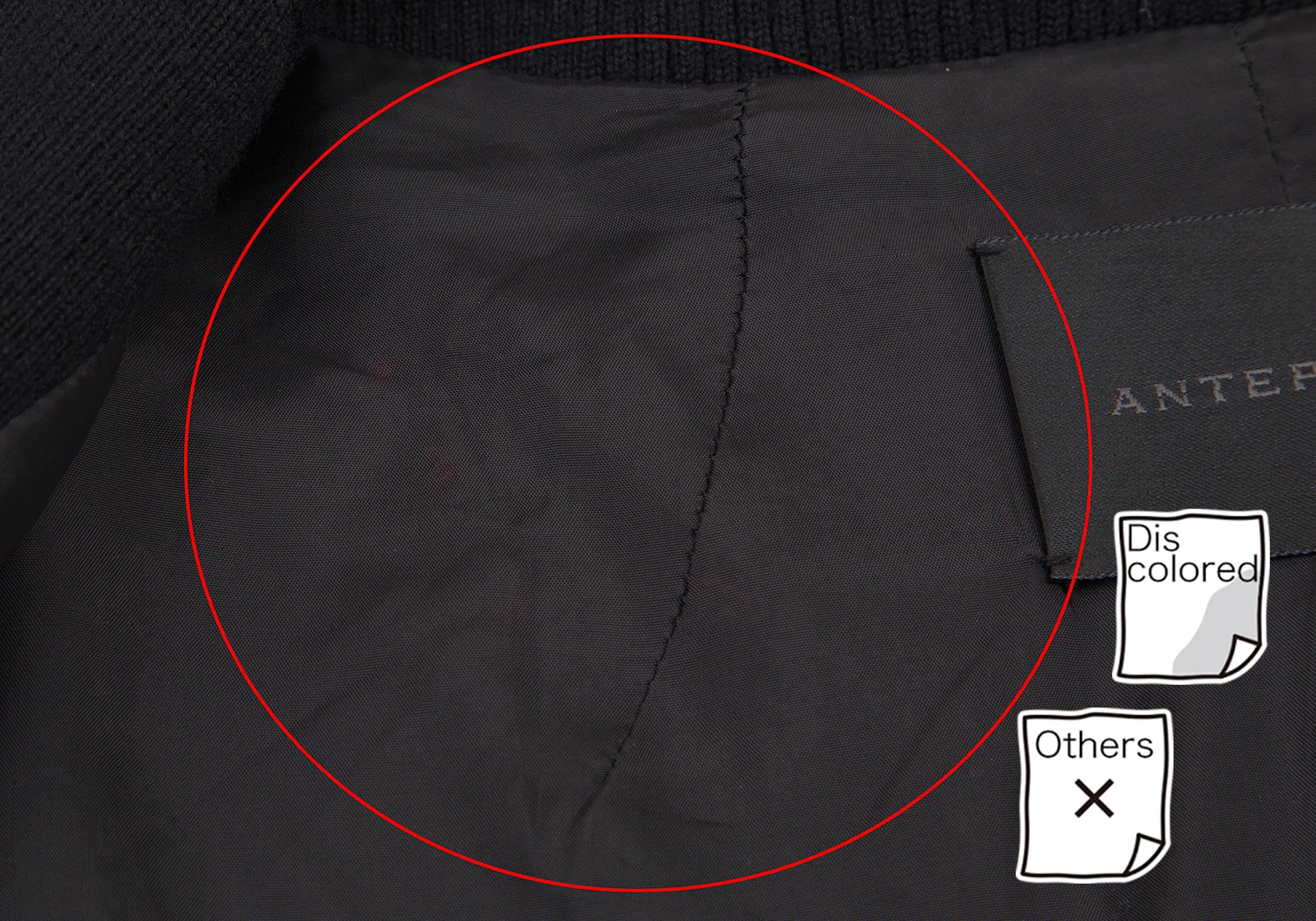 袖口擦れ、袖裏に汚れ、裏地に変色・縫い目ダメージ・糸引きがあります(写真参照)。その他目立ったシミ、汚れ、ほつれ等ありません。クリーニング済み