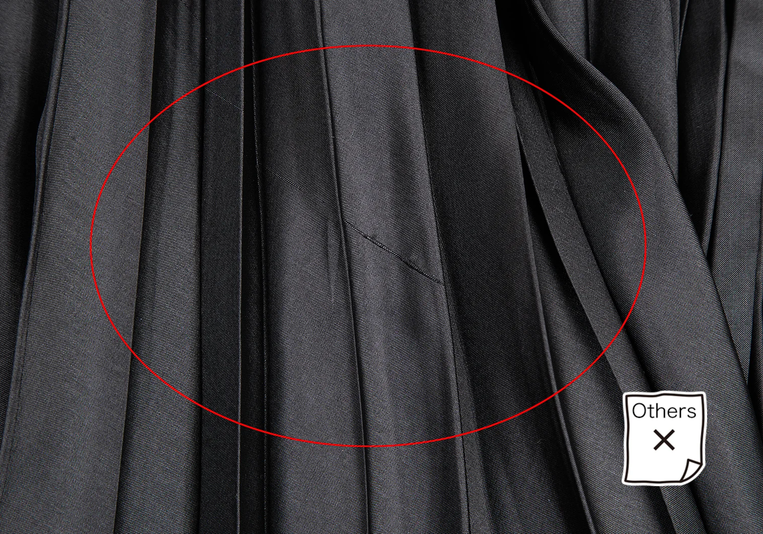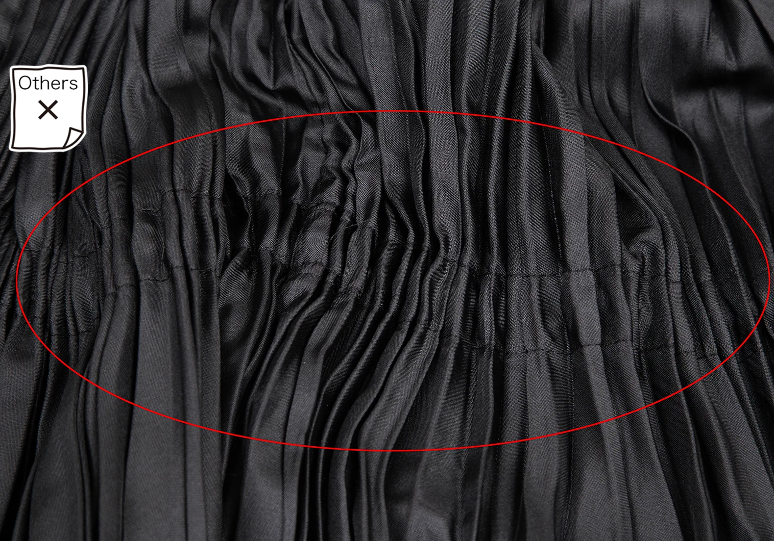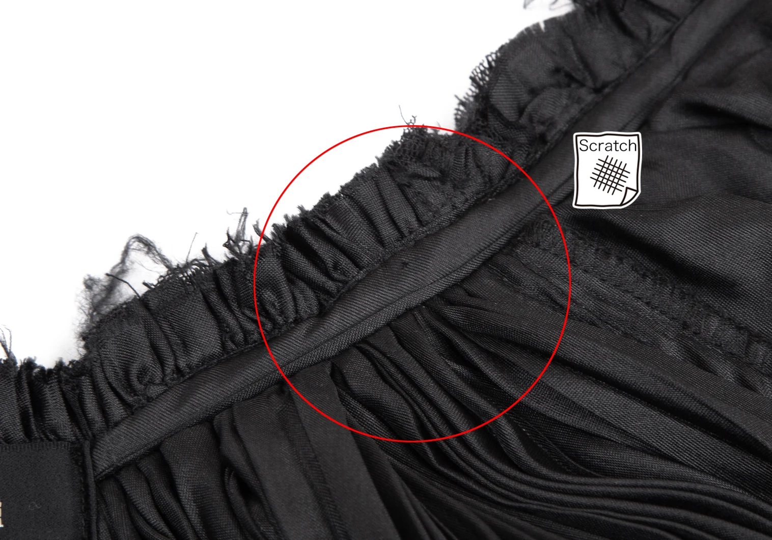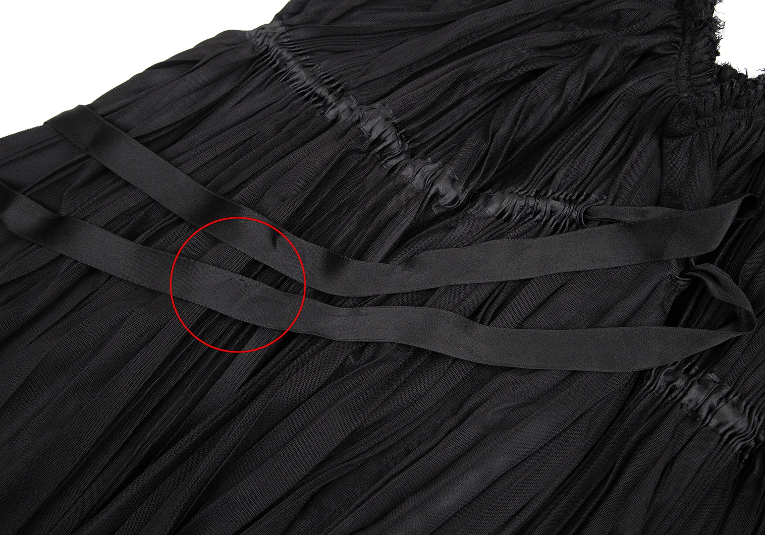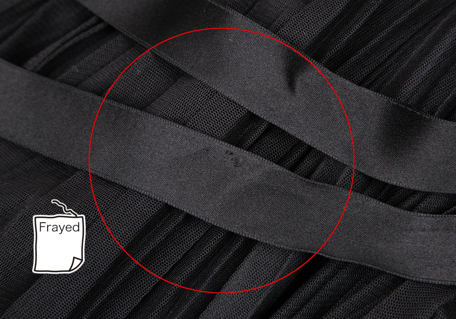 品質タグがありません。首元パイピング・リボンに引っ掛け、裏側の縫い目にのステッチ跡、裏裾に糸引きがあります。(写真参照)その他目立ったシミ、汚れ等はありません。クリーニング済み