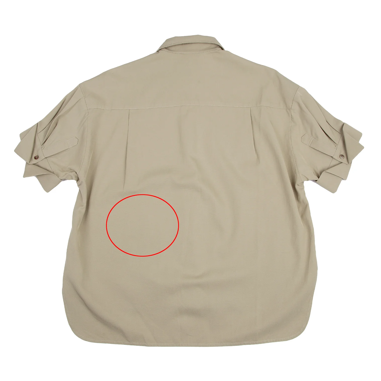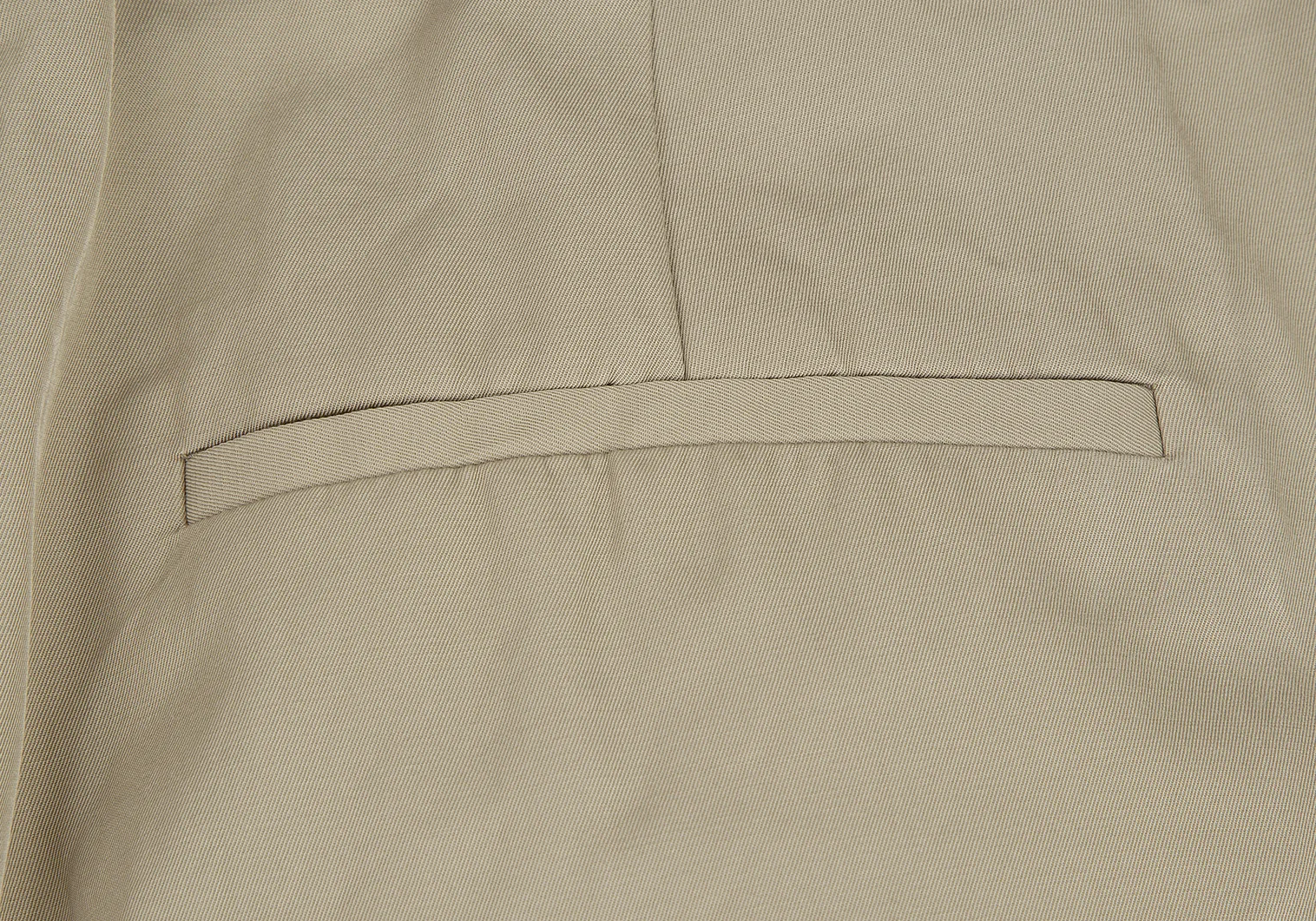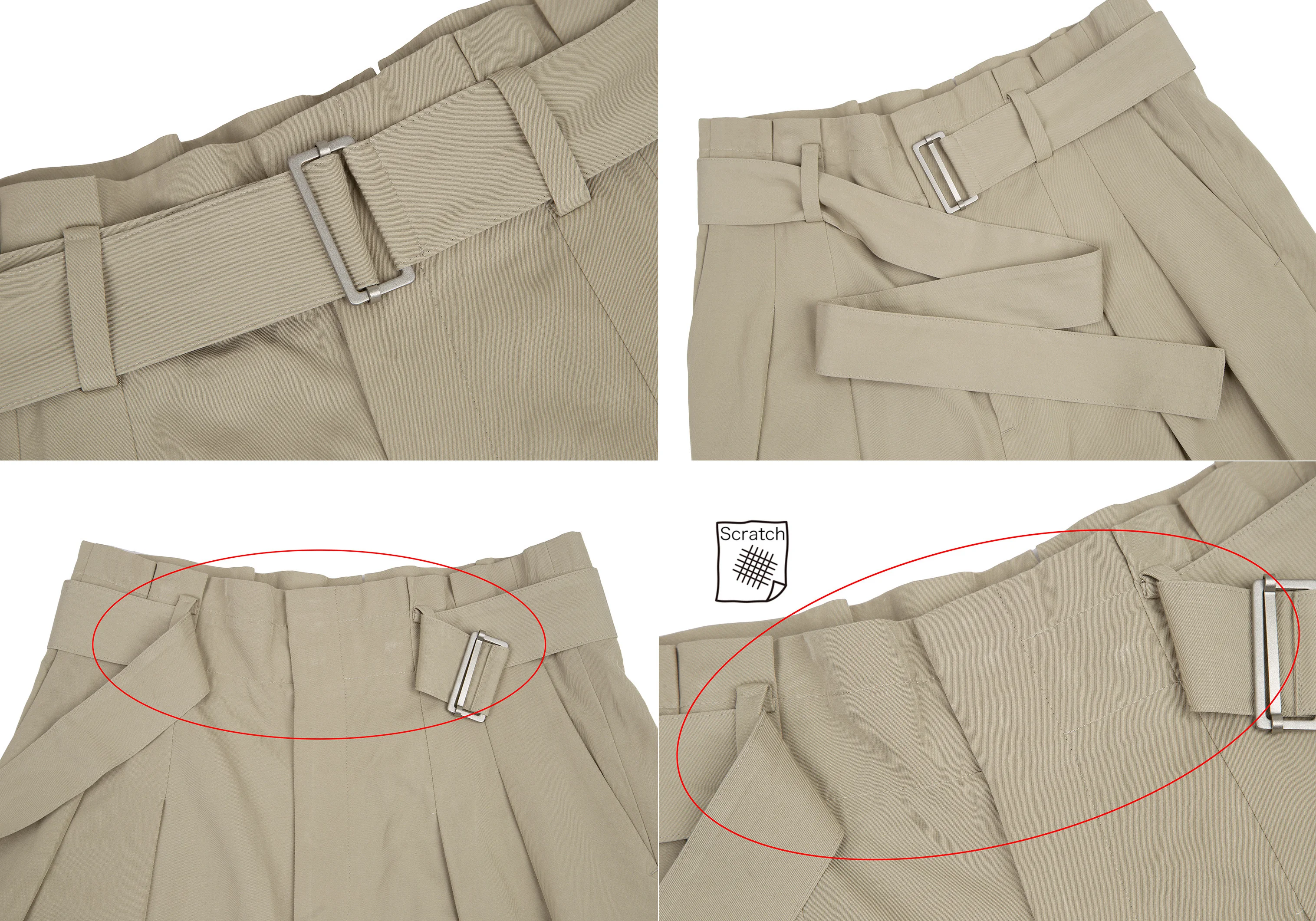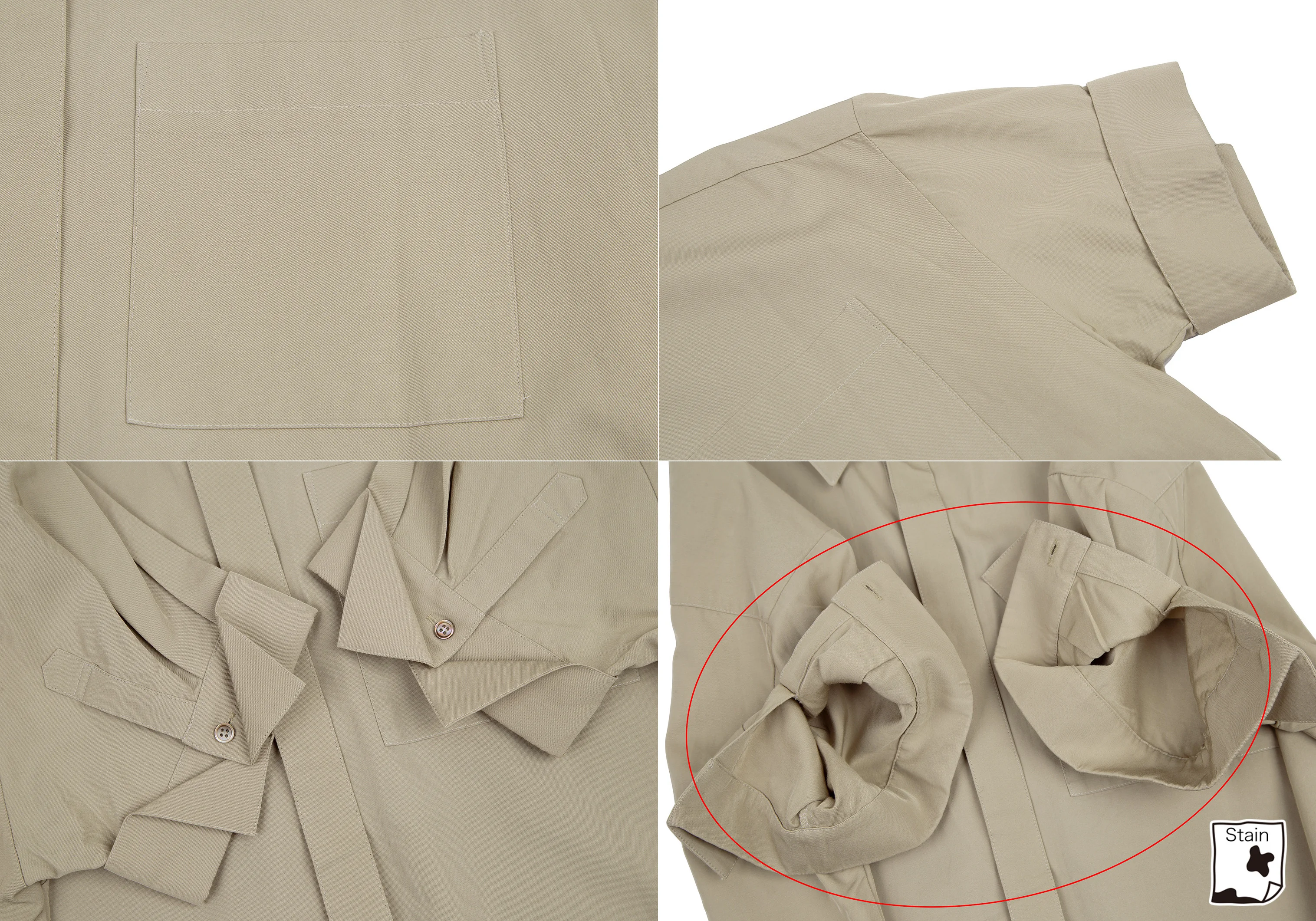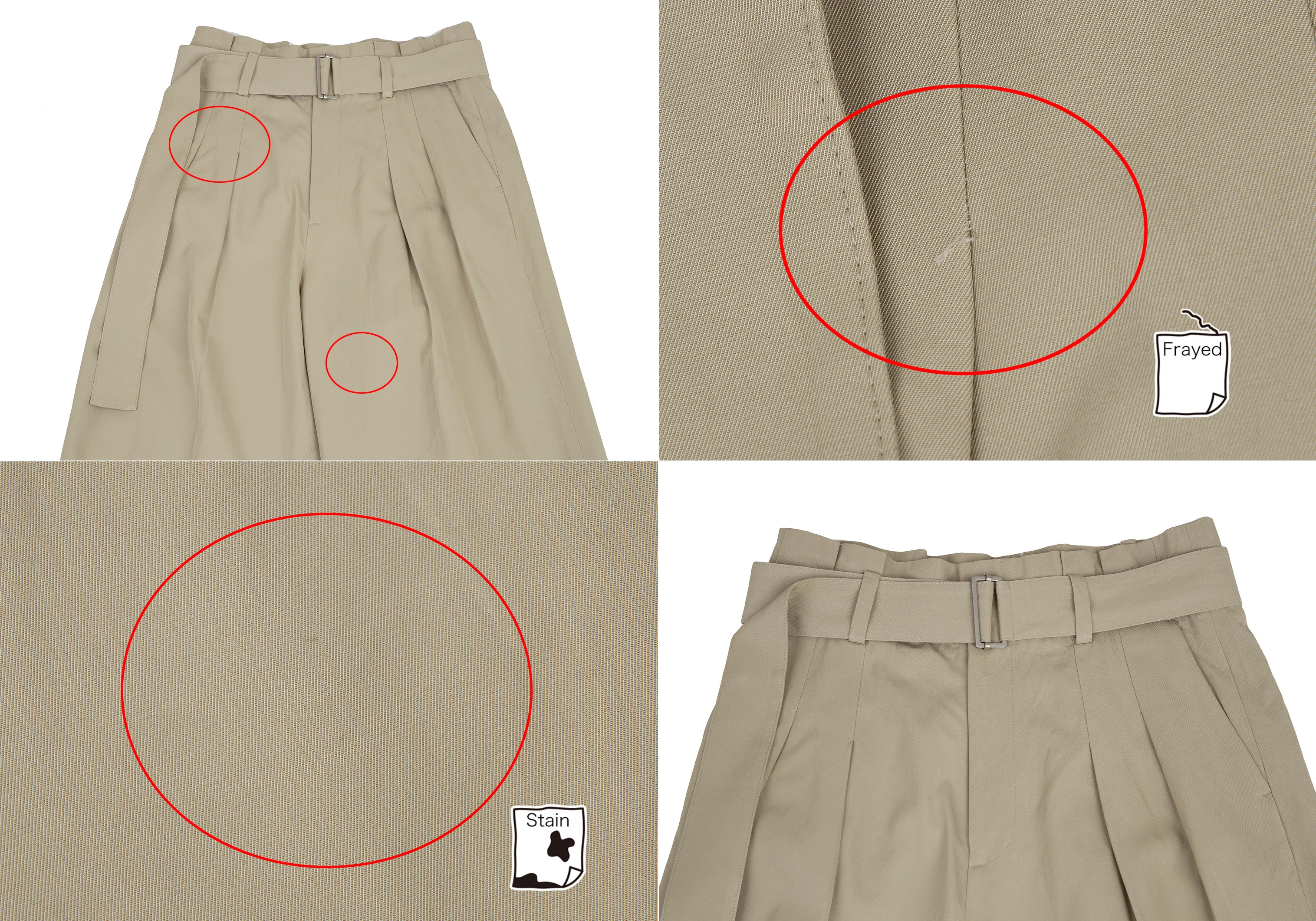 シャツ:襟元・袖裏に薄汚れ、後ろ身頃にアタリがあります。パンツ:前タック部分にほつれ、前身頃に薄汚れ、前ウエストにスレ、ヒップ部分にアタリがあります(写真参照)。その他目立ったシミ、汚れ、ほつれ等はありません。クリーニング済み