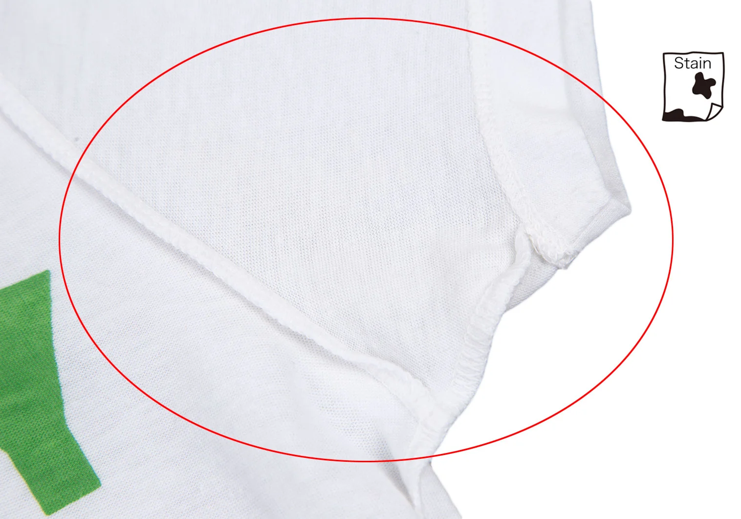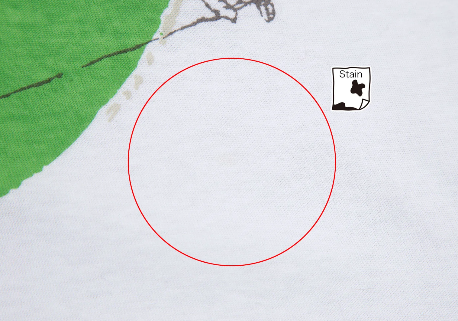 品質表示タグがありません。首周り・脇下・前裾に薄シミがあります(写真参照)。その他目立ったシミ、汚れ、ほつれ等はありません。クリーニング済み