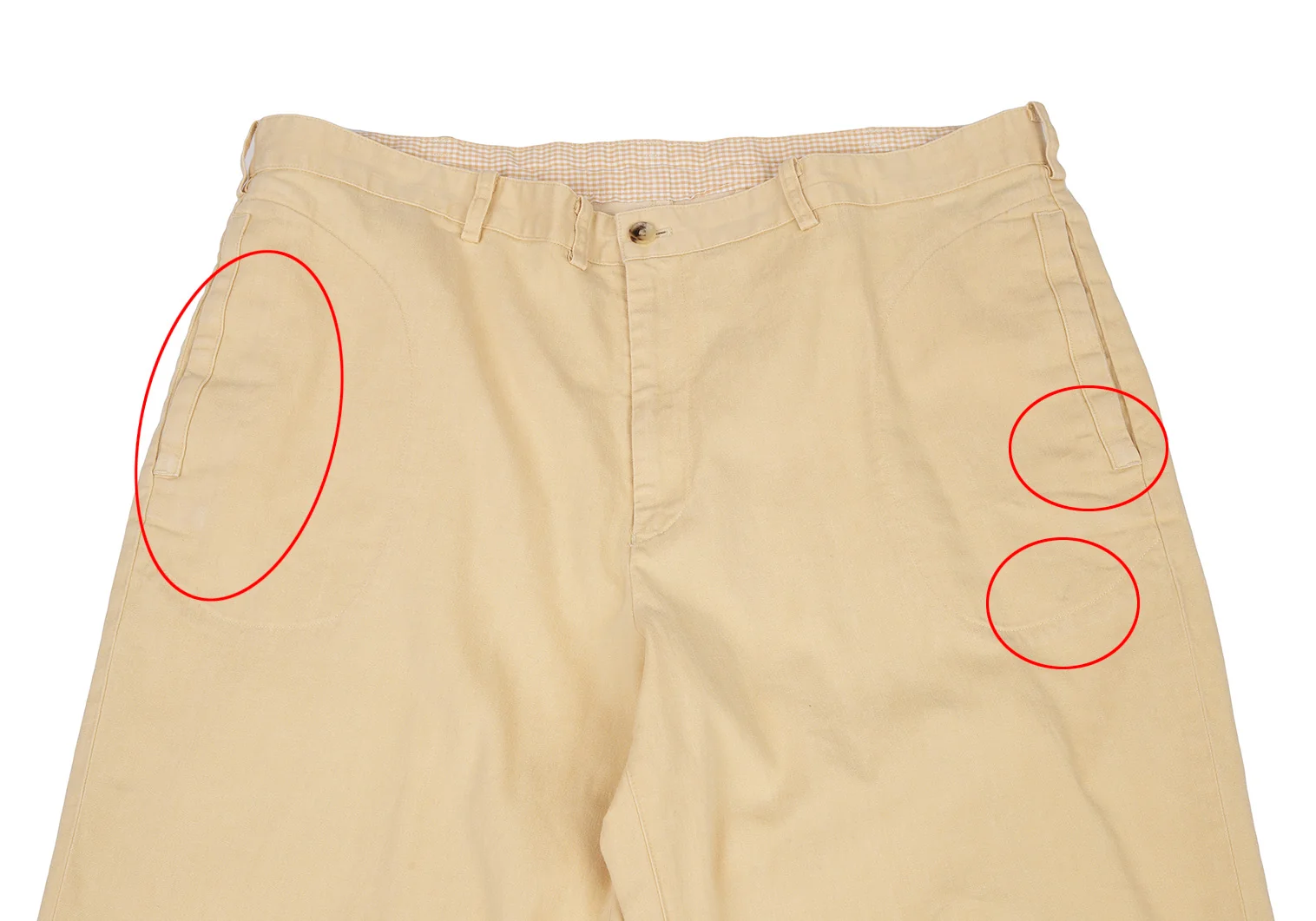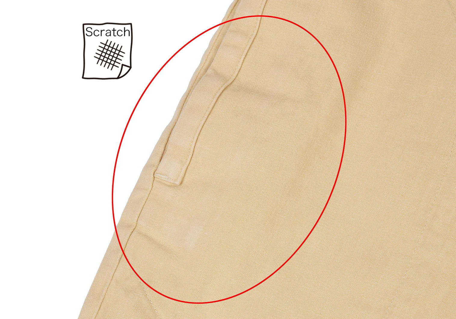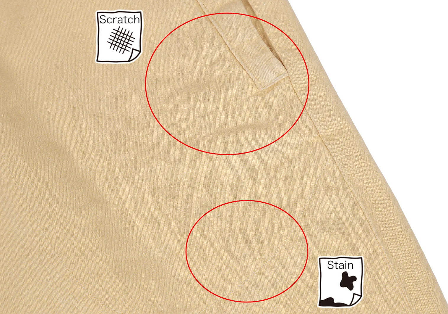 サイドポケット口にスレ、前身頃左足・右裾裏に汚れがあります(写真参照)。その他ほつれ等ない状態です。クリーニング済み