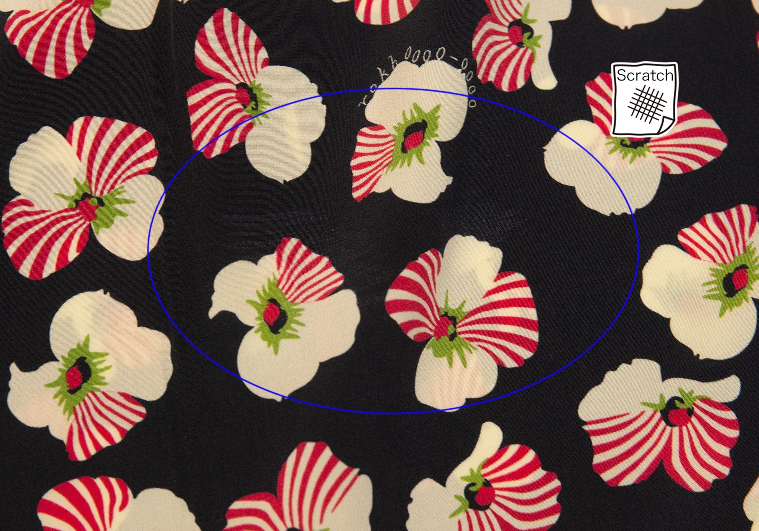 品質表示タグがありません。脇下に擦れ、ストールに薄シミ、前後に糸引きがあります(写真参照)。その他目立ったシミ、汚れ等はありません。クリーニング済み