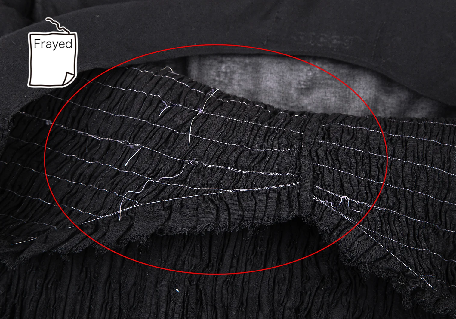 透け感があります。ギャザー裏側一部ゴム切れがあります。(写真参照)その他目立ったシミ、汚れ、ほつれ等なくいい状態です。クリーニング済み