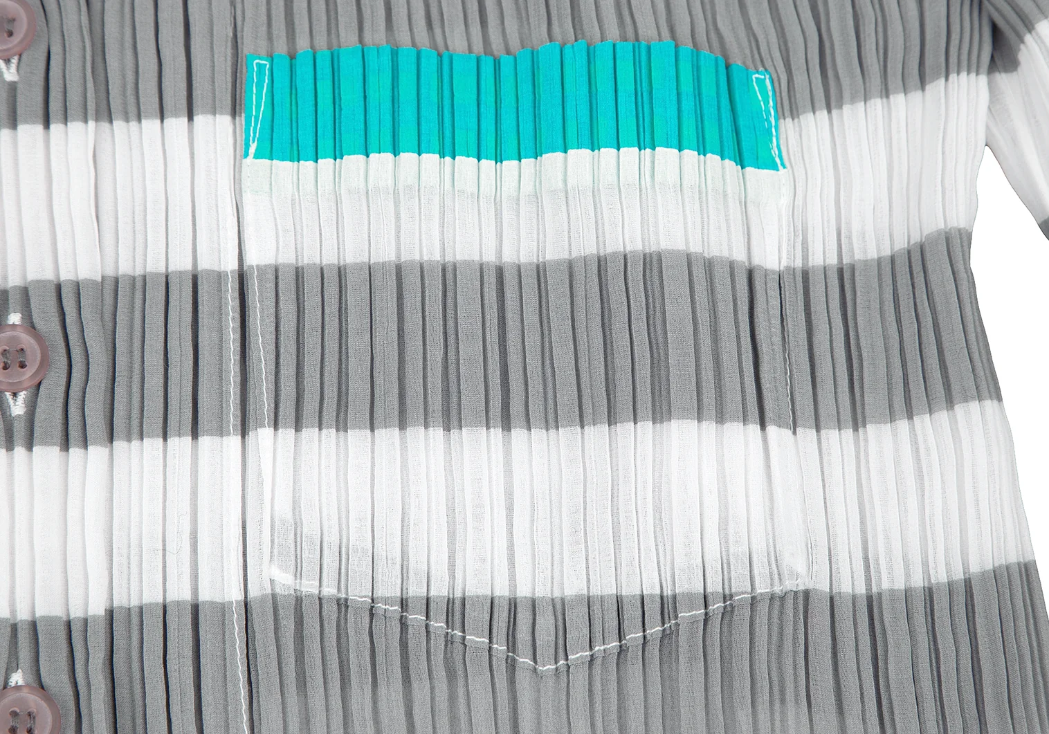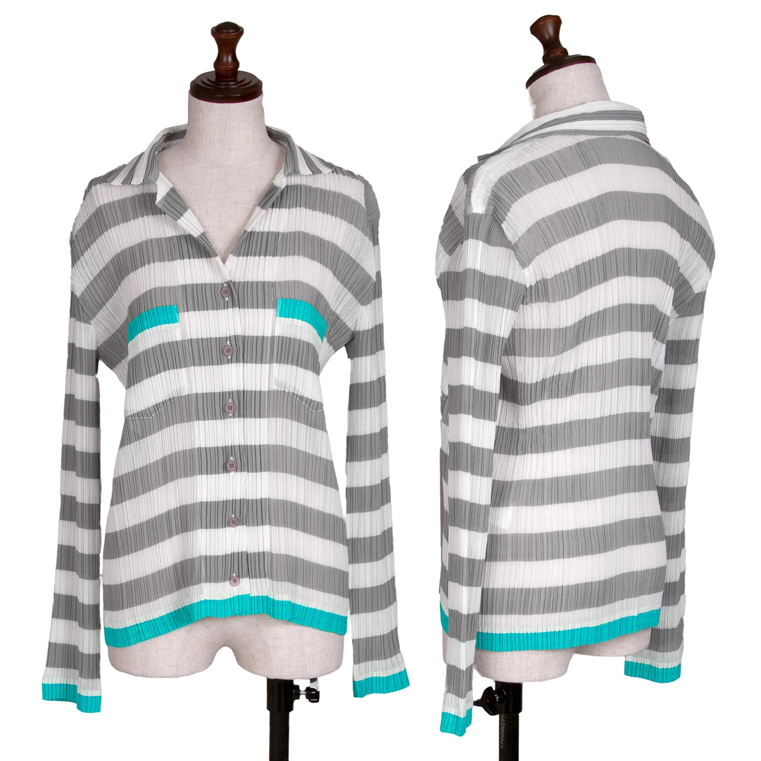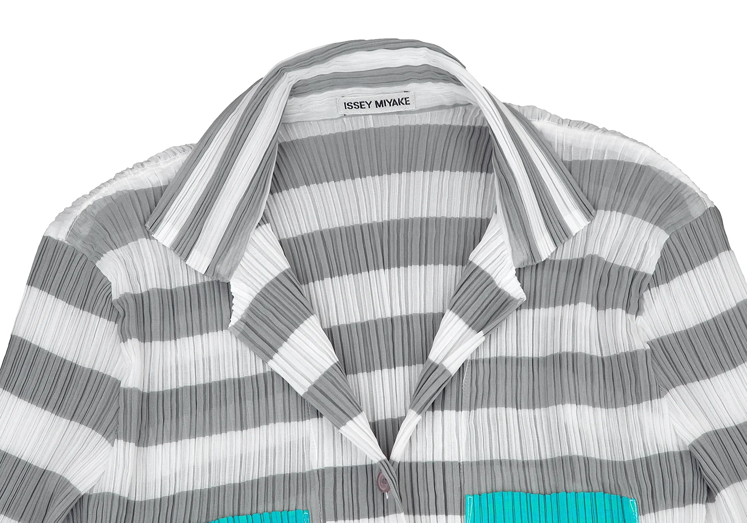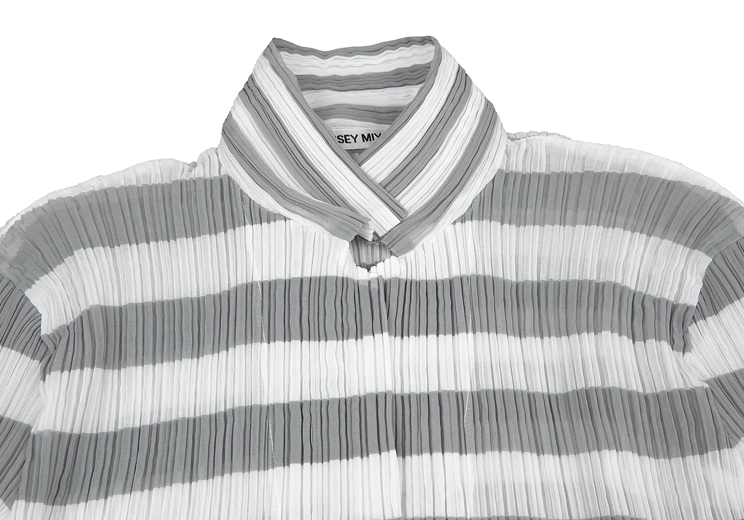 イッセイミヤケISSEY MIYAKEパターン切替ボーダーシースループリーツシャツ 白グレーM