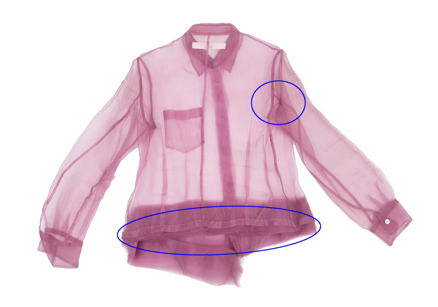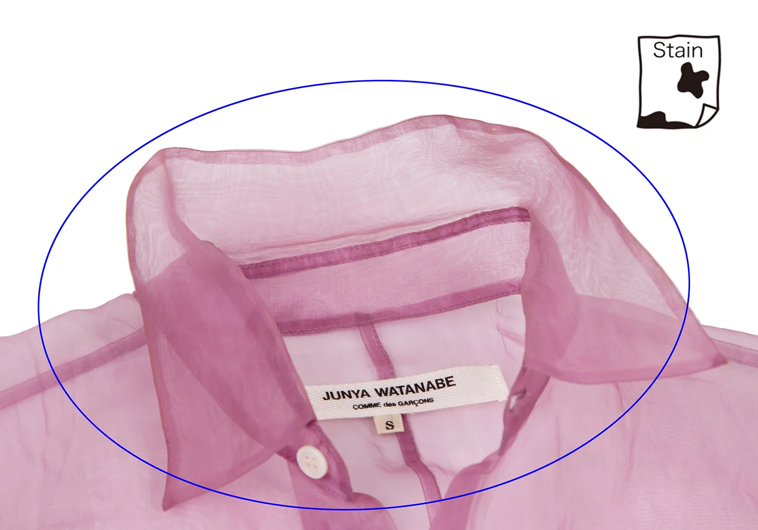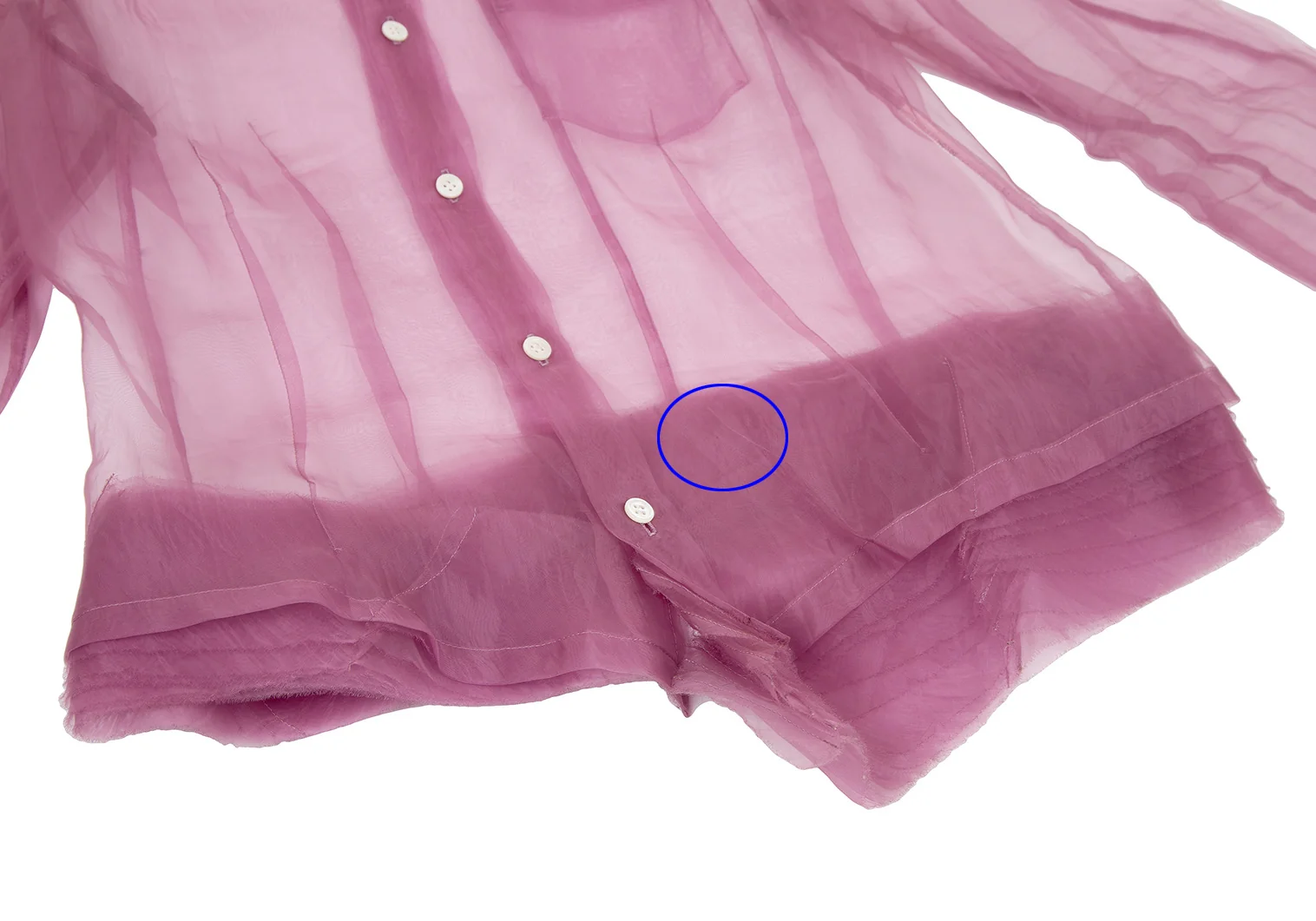 品質タグがカットされています。透け感があります。襟周り・袖裏に汚れ、前裾に穴あき、後ろ右脇に薄汚れ、裾にステッチほつれがあります(写真参照)。その他目立ったシミ、汚れ、ほつれ等はありません。クリーニング済み