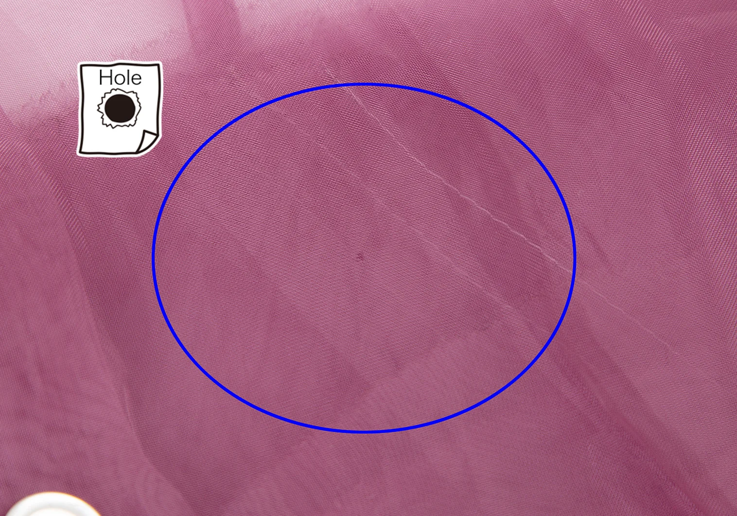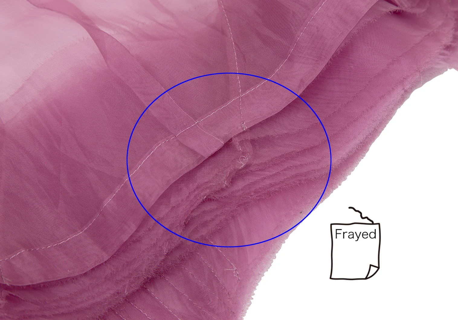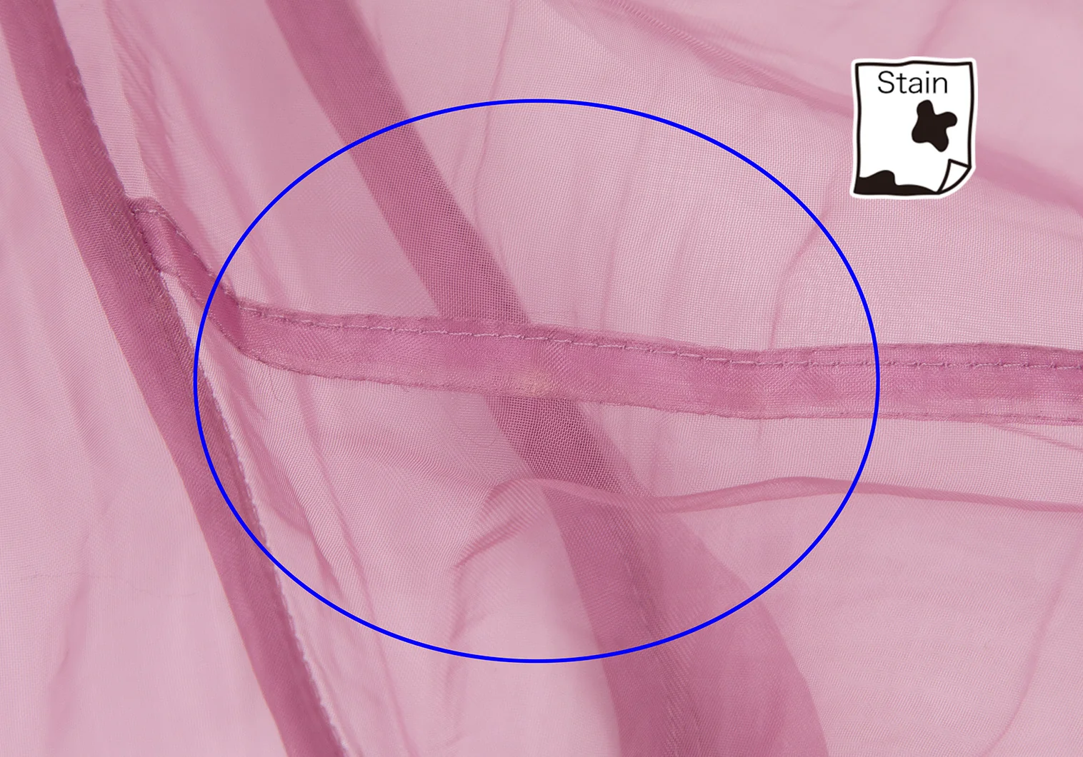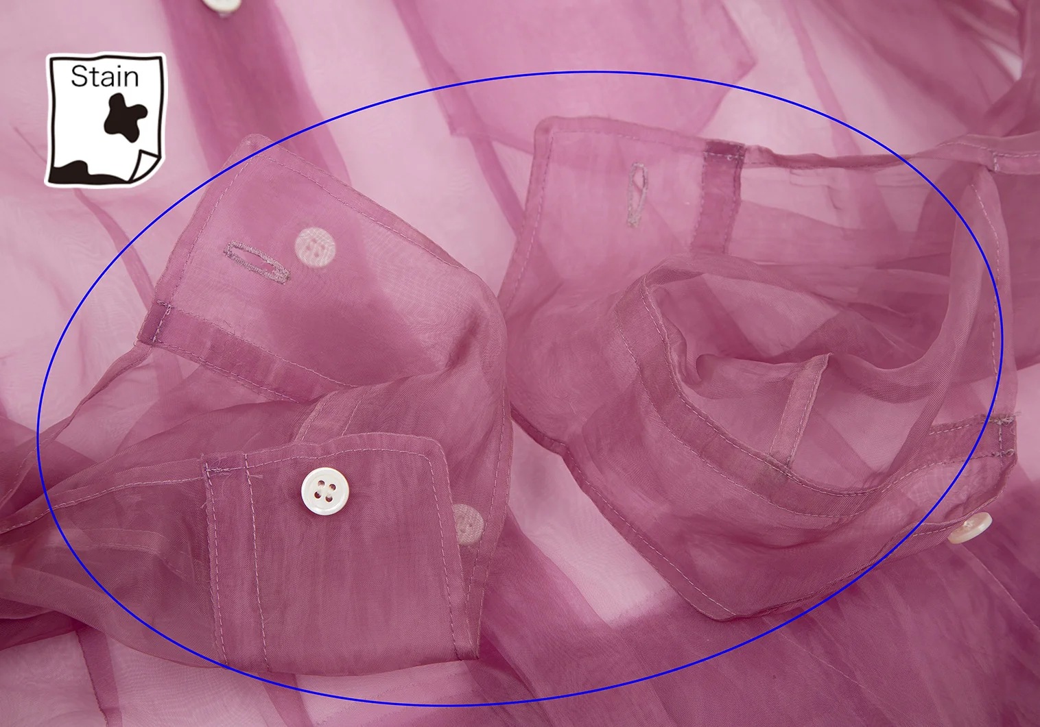 品質タグがカットされています。透け感があります。襟周り・袖裏に汚れ、前裾に穴あき、後ろ右脇に薄汚れ、裾にステッチほつれがあります(写真参照)。その他目立ったシミ、汚れ、ほつれ等はありません。クリーニング済み