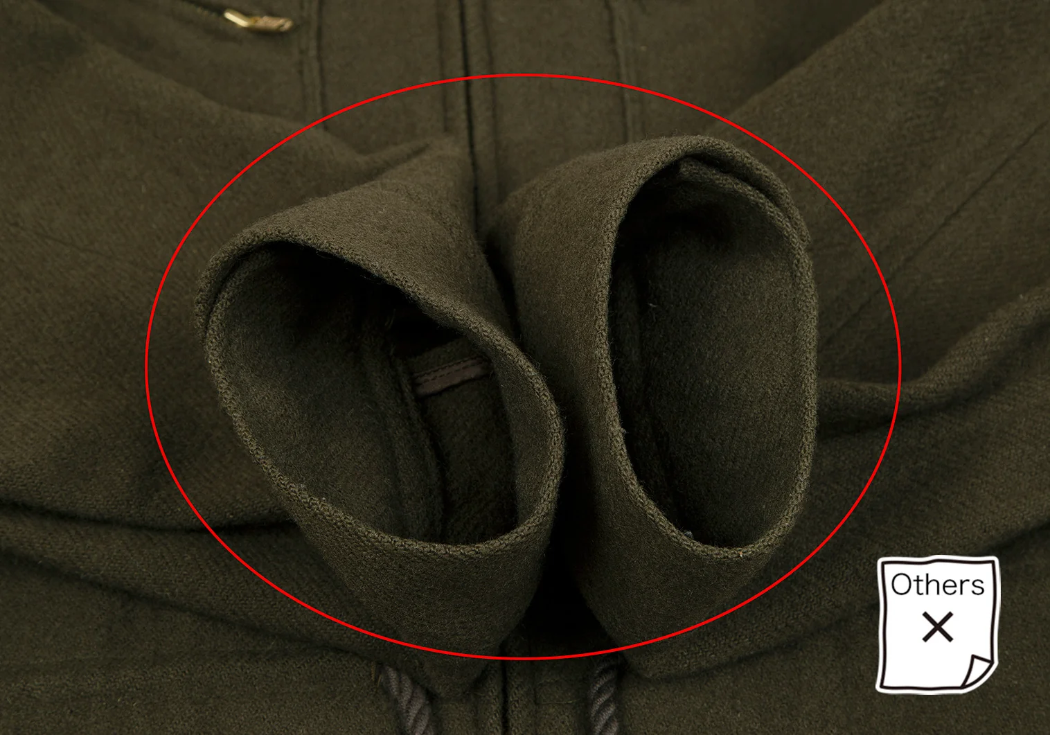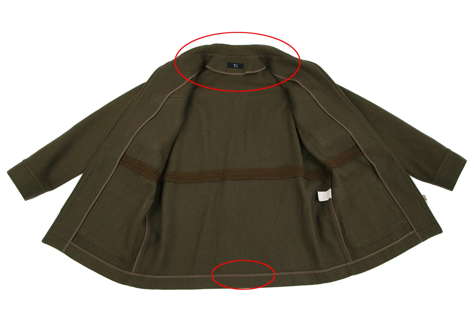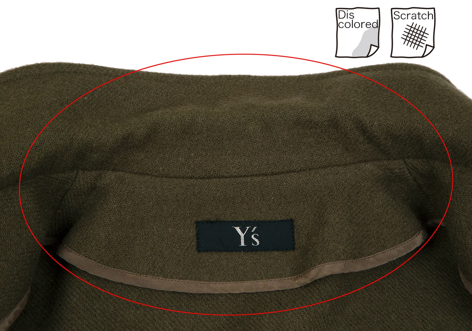 タグにネーム書き込みがあります。袖先に毛抜け、襟裏にスレ・首元パイピング部分に変色、裾パイピング部分に汚れがあります(写真参照)。クリーニング済み