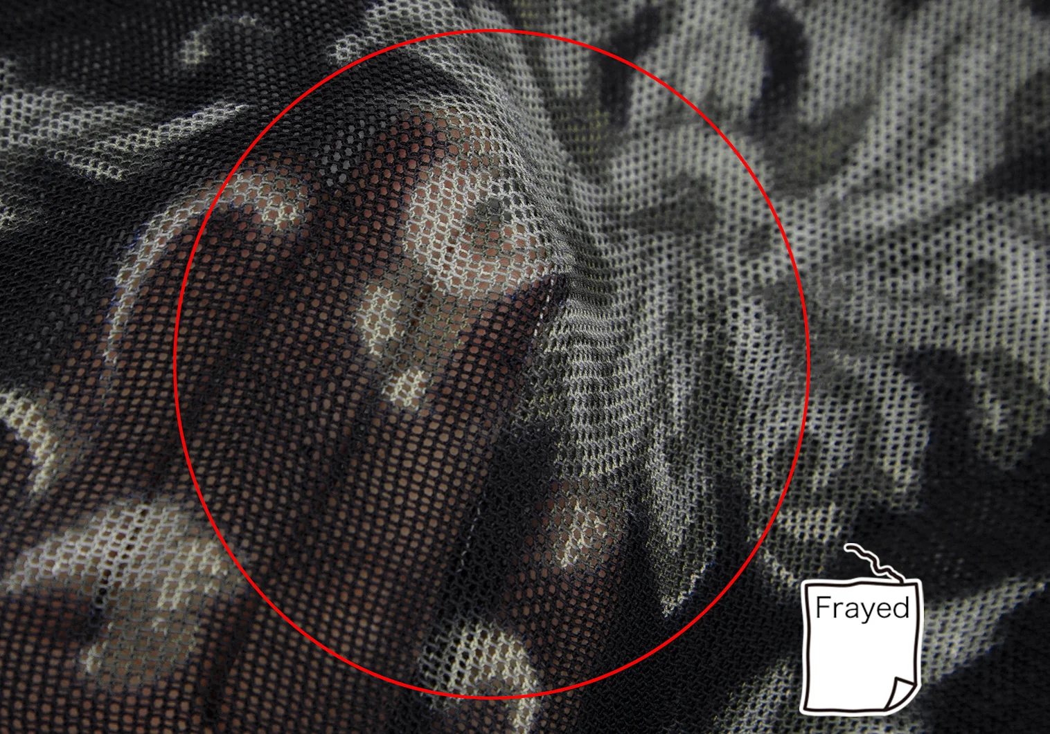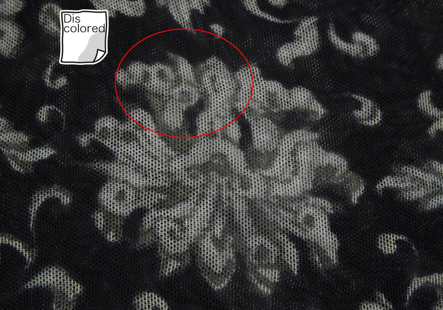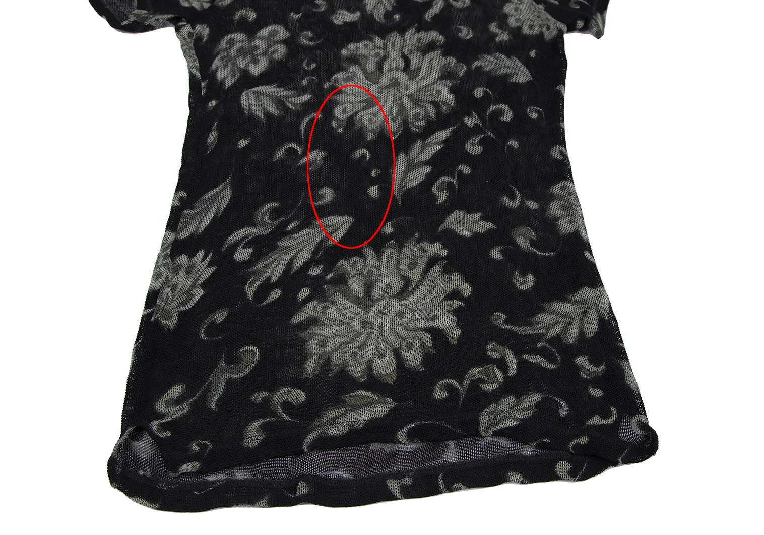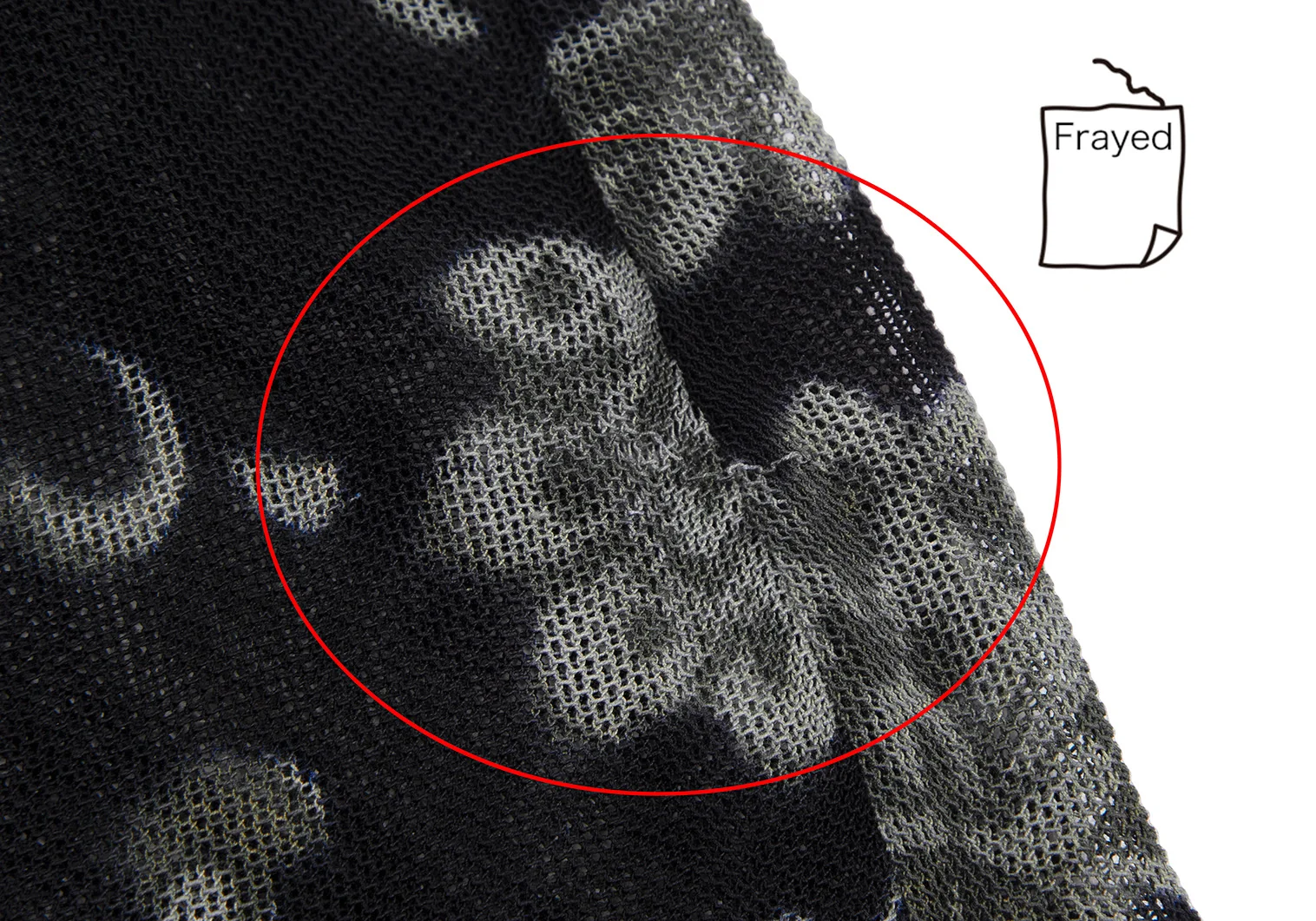 透け感があります。前身頃に糸引き、後ろ身頃に変色、後ろ裾に引っかけがあります(写真参照)。その他目立ったシミ、汚れ等ない状態です。クリーニング済み