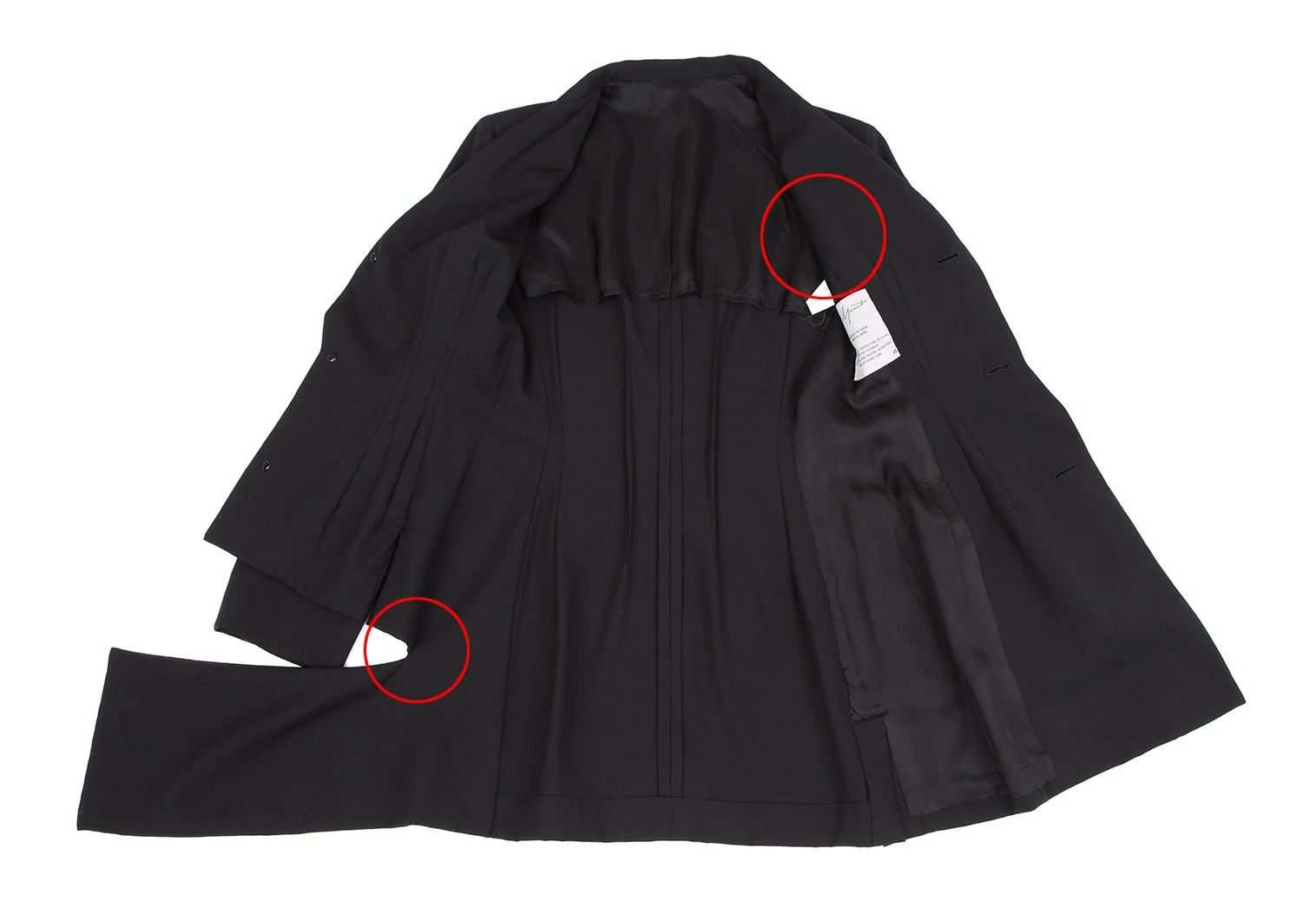 ジャケット:肩パッドあり。裾スリット部分・裏地脇下にダメージがあります(写真参照)。その他目立ったシミ、汚れ、ほつれ等なはありません。クリーニング済み