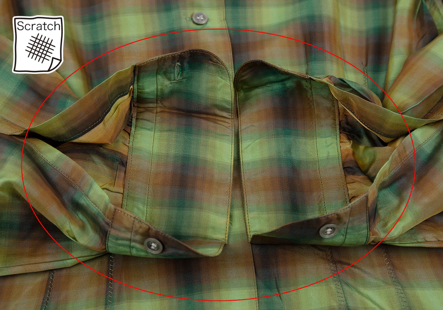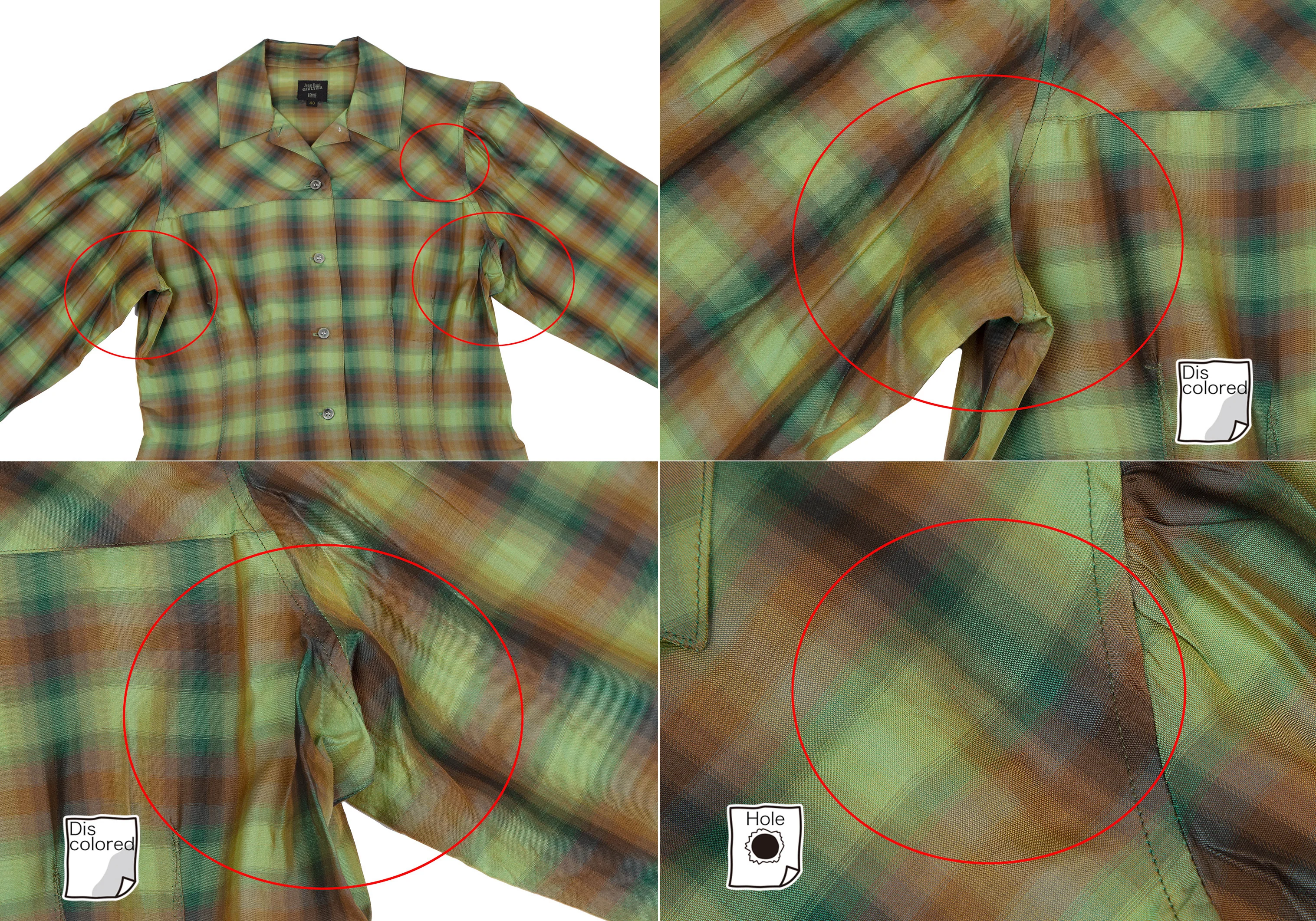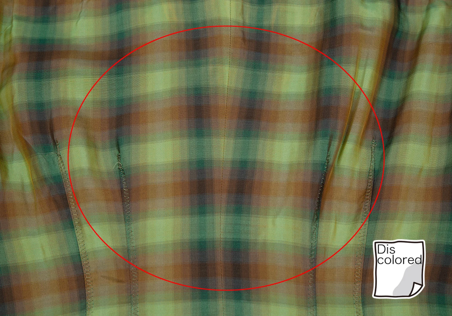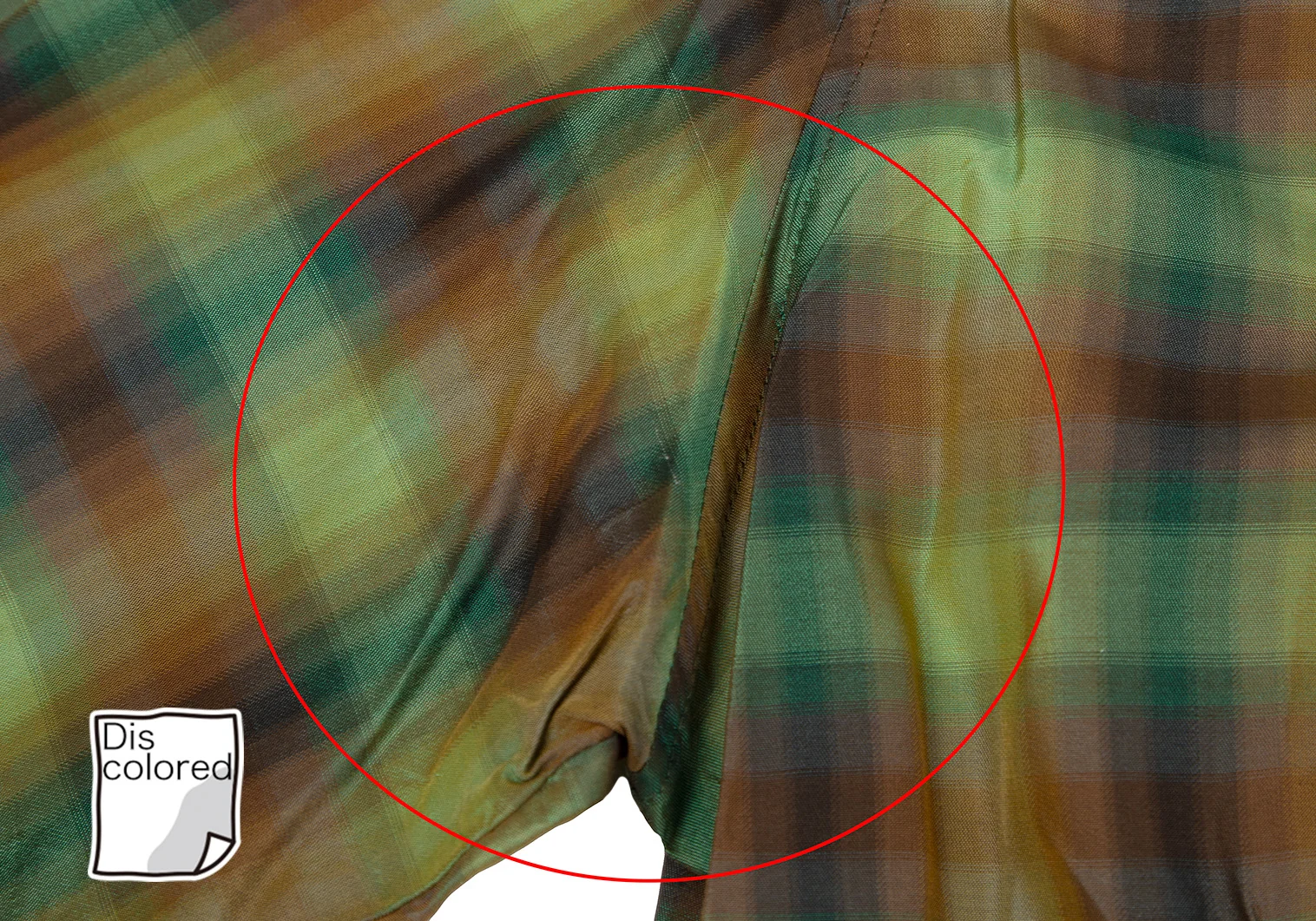 左胸元にピン穴、前後脇周り・前身頃・背中に変色、袖裏にスレがあります(写真参照)。その他汚れ、ほつれ等ない状態です。クリーニング済み