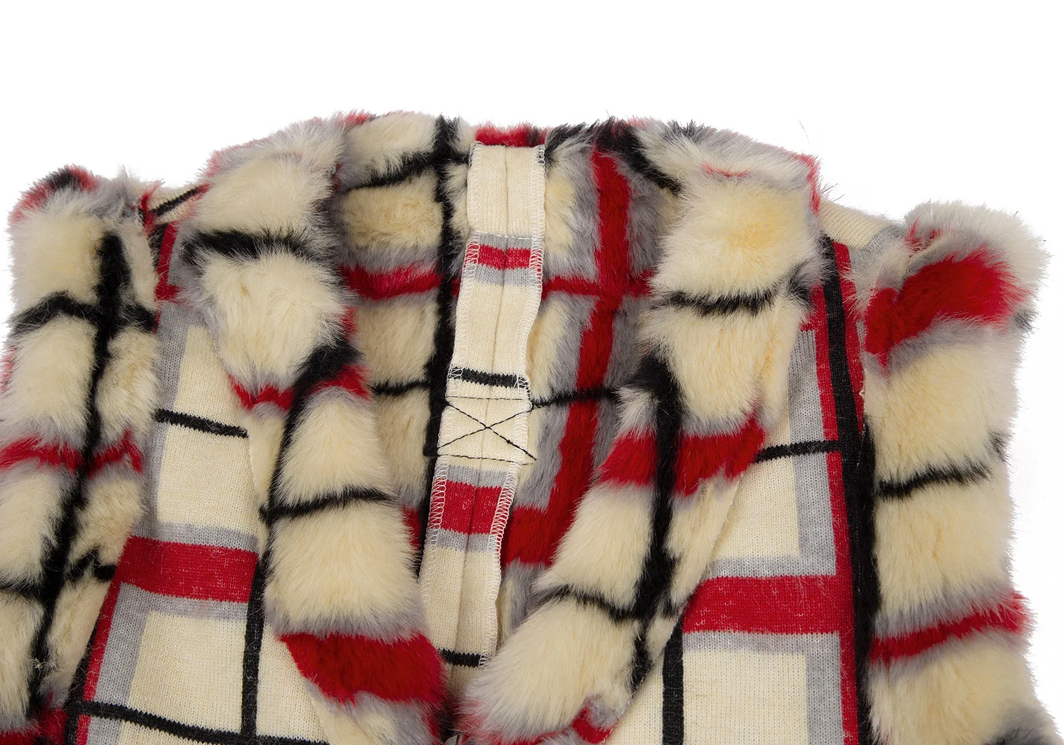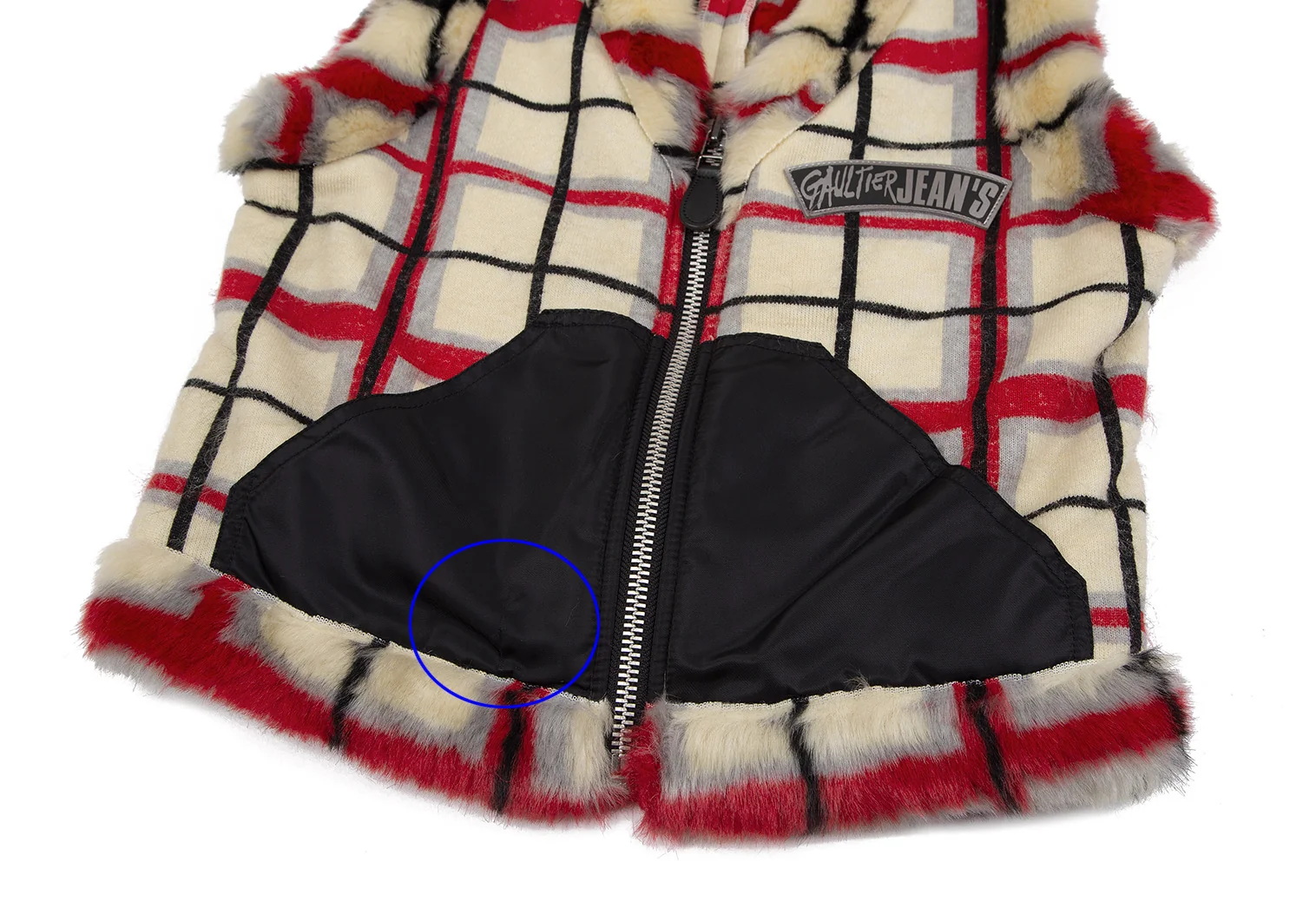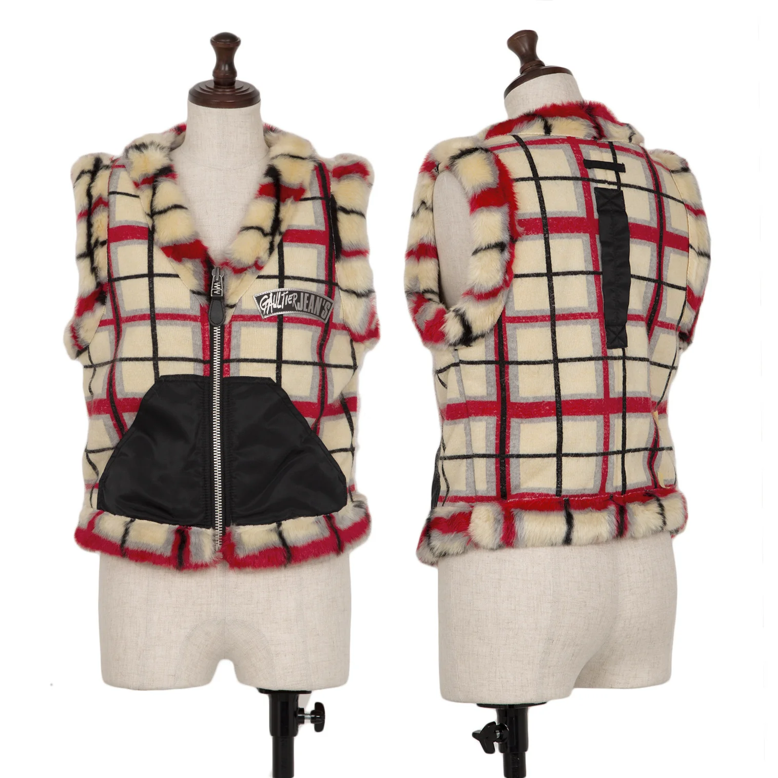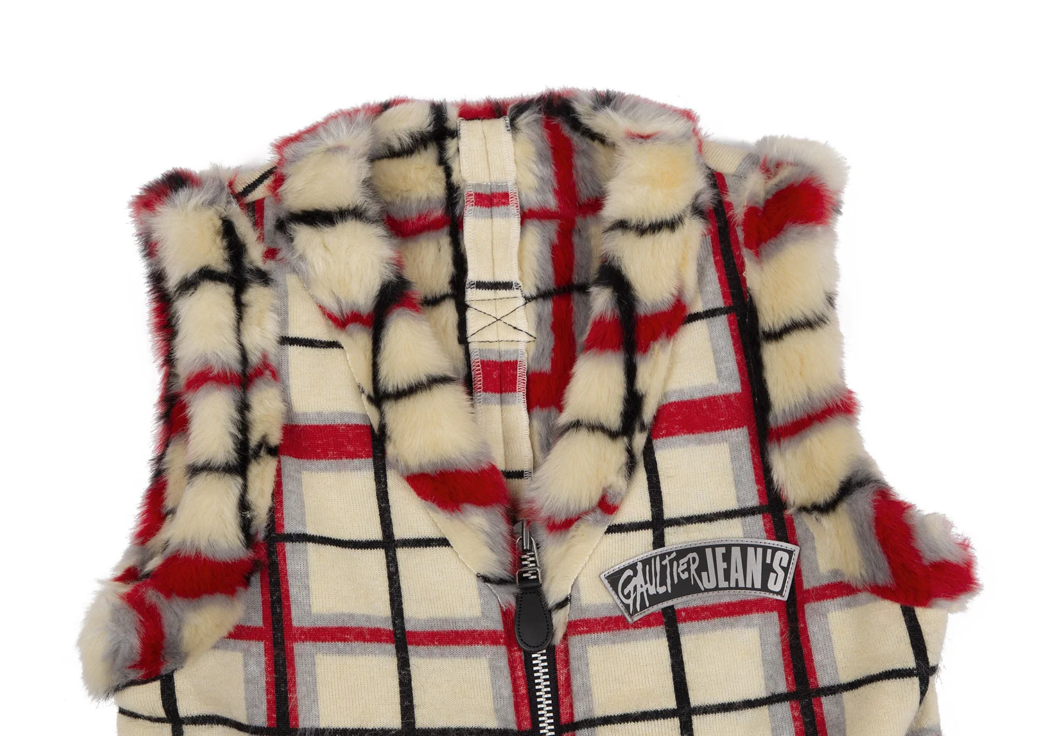 ゴルチエジーンズGAULTIER JEAN'S ファーチェックニットベスト クリーム赤黒40